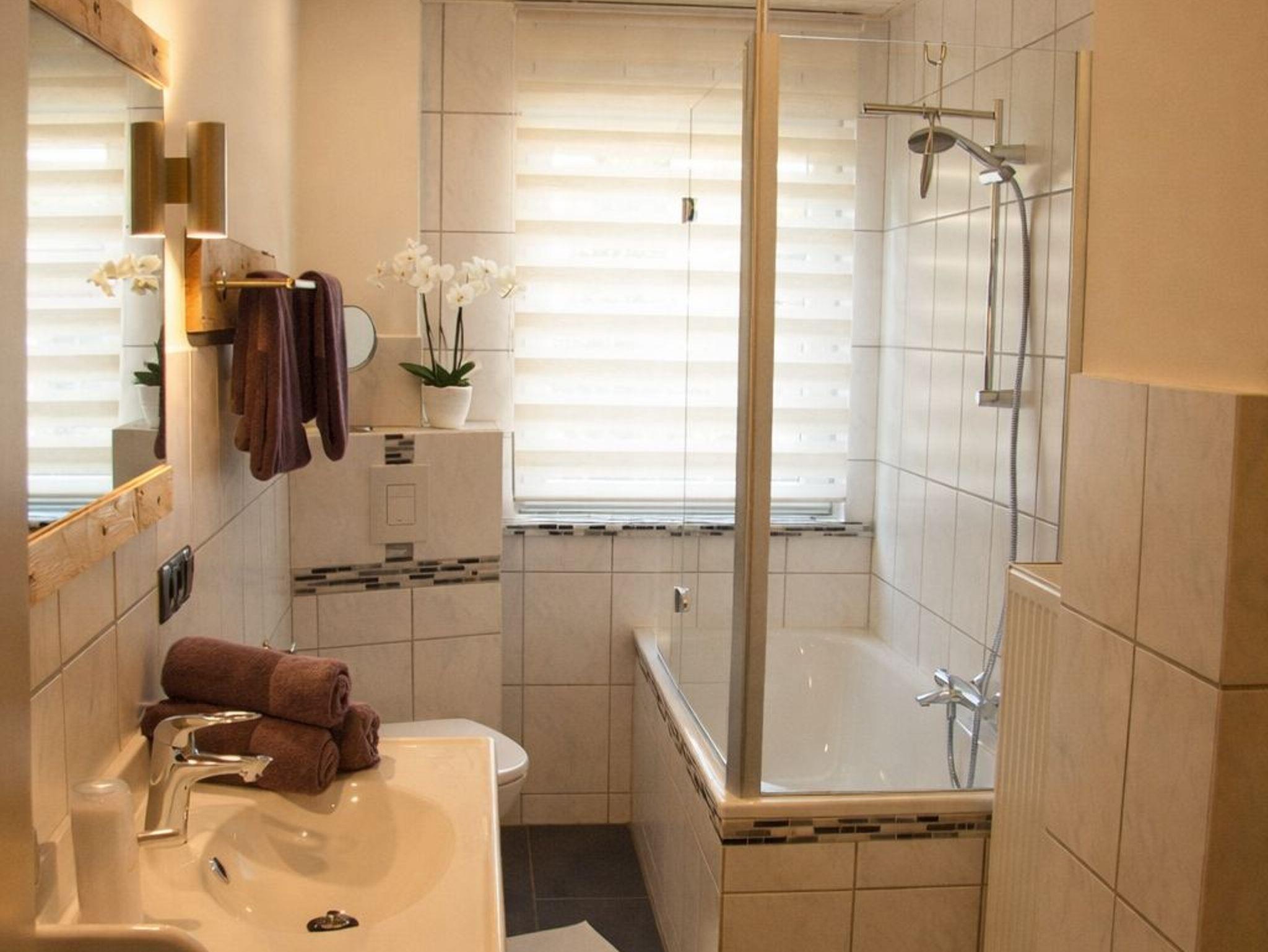 Badewanne mit stabilem Duschaufsatz, WC, extra Sitzgelegenheit, Kosmetikspiegel, Kinderschemel, großes Fenster, Föhn, Hand,- und Badetücher, welche im Preis mit inbegriffen sind.