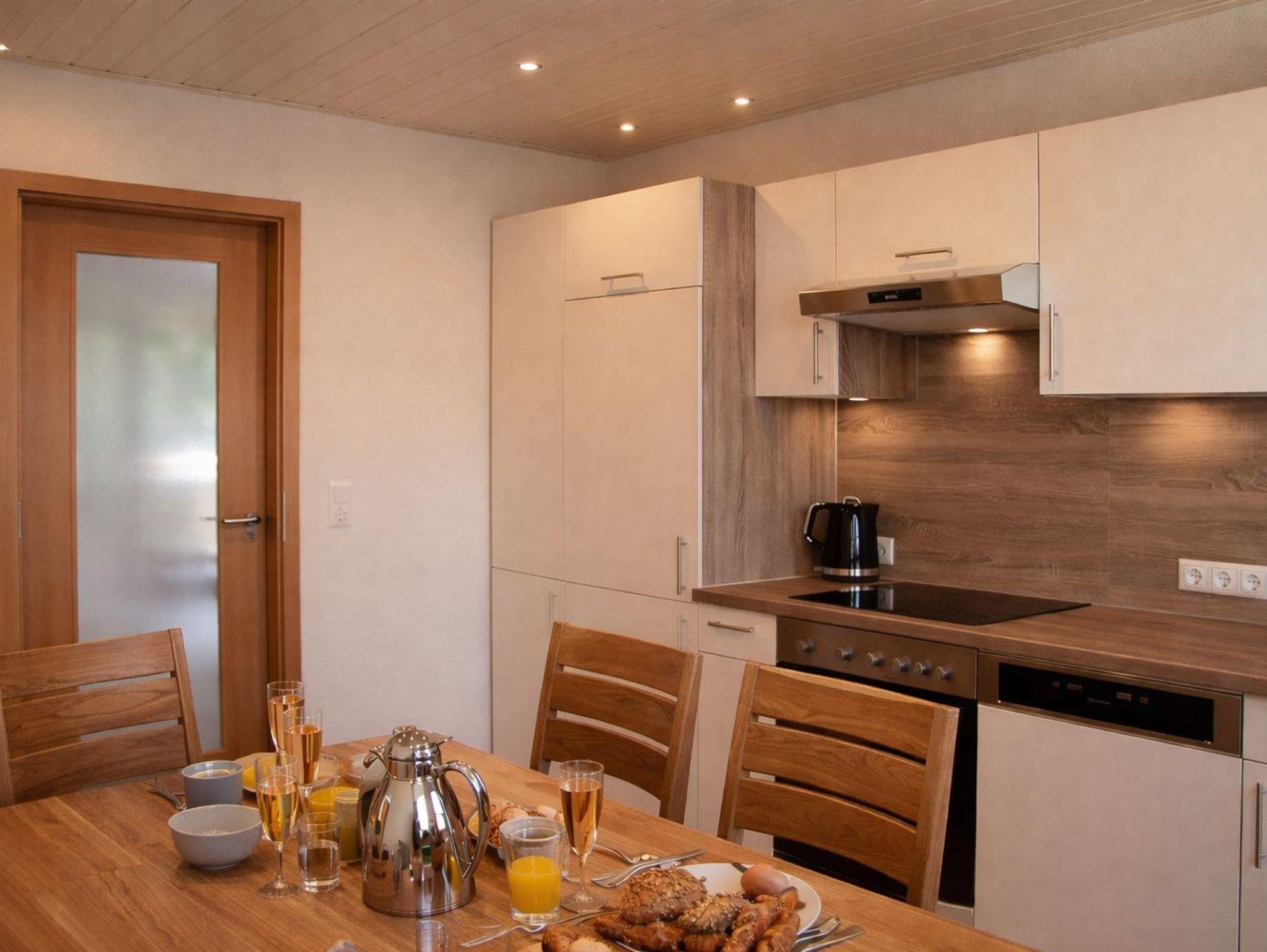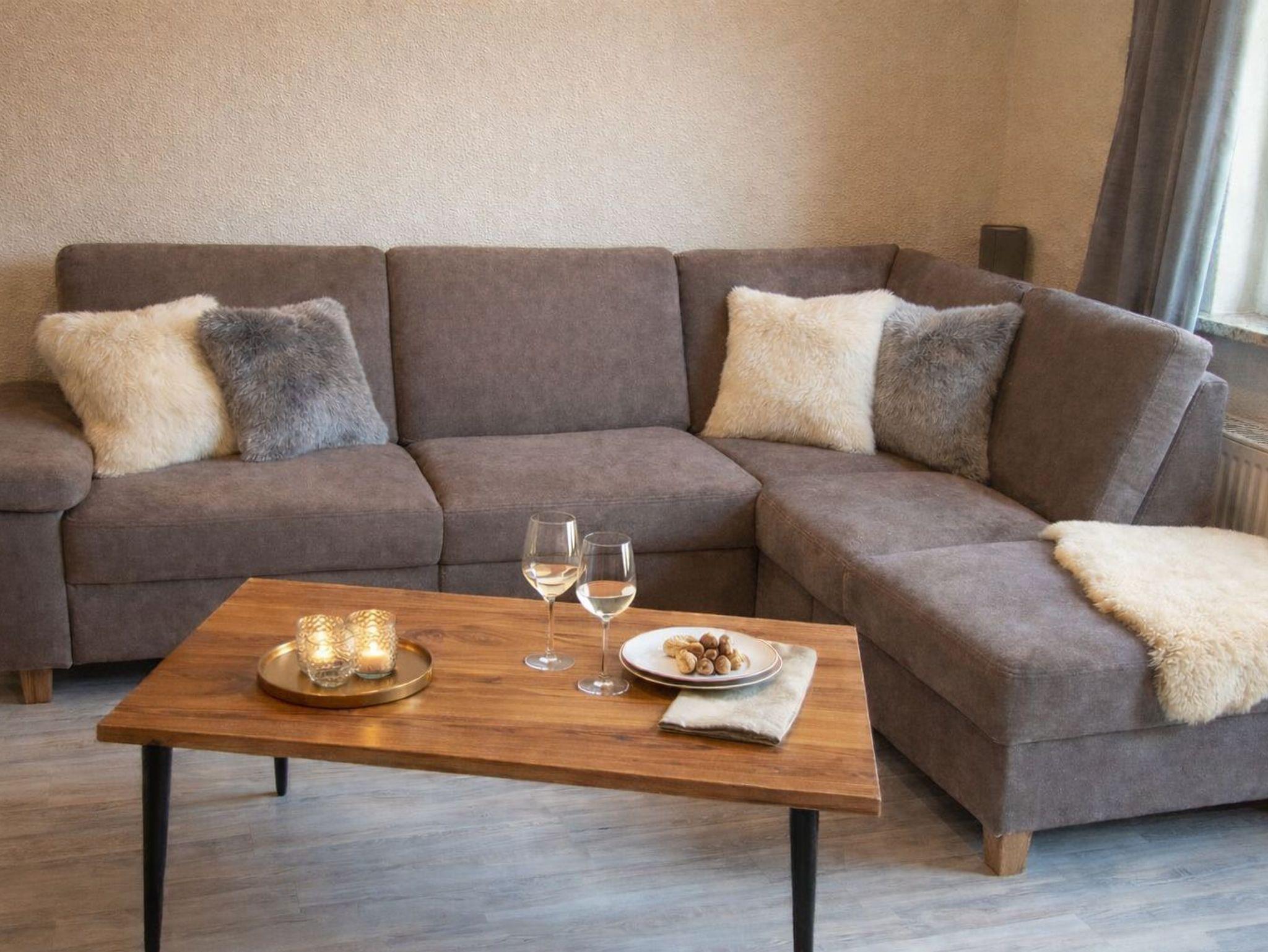 Die Ferienwohnung ist geschmackvoll und hochwertig eingerichtet. Rustikale Holzmöbel und edle Dekorationen schaffen eine gemütliche Atmosphäre.
