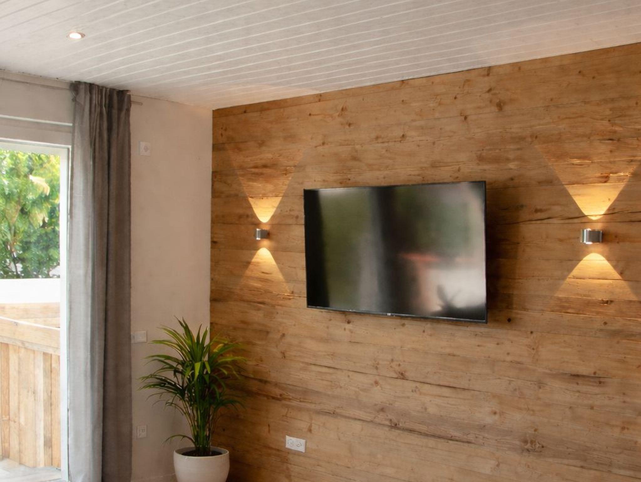 55? Flachbildschirm, Couch, Lesestuhl, Holztruhe, elektrische Außenrollos und ein direkter Zugang auf die 30 m² große Terrasse. In den Wintermonaten bietet der Ofen eine mollige Wärme.