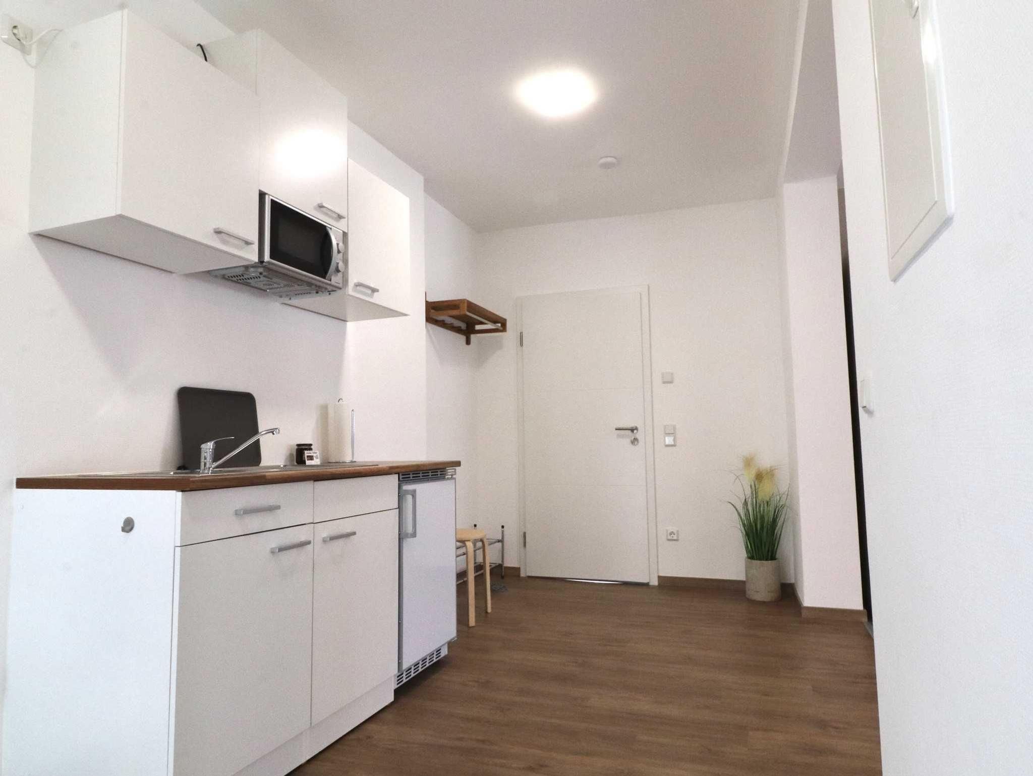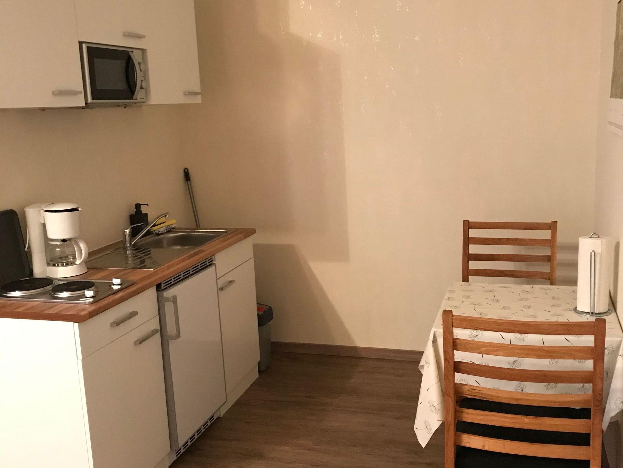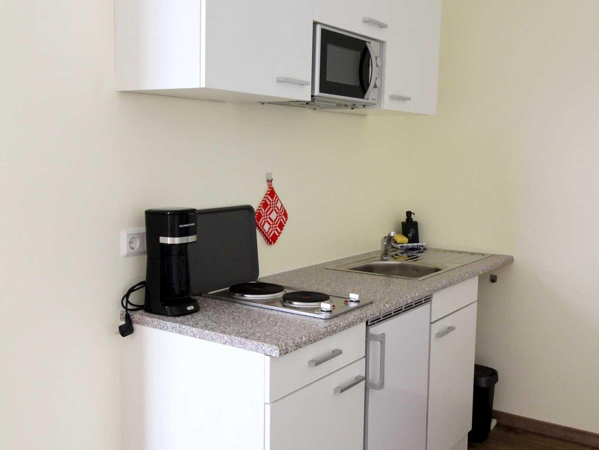 - Miniküche mit Mikrowelle, 2 Kochplatten und Kühlschrank