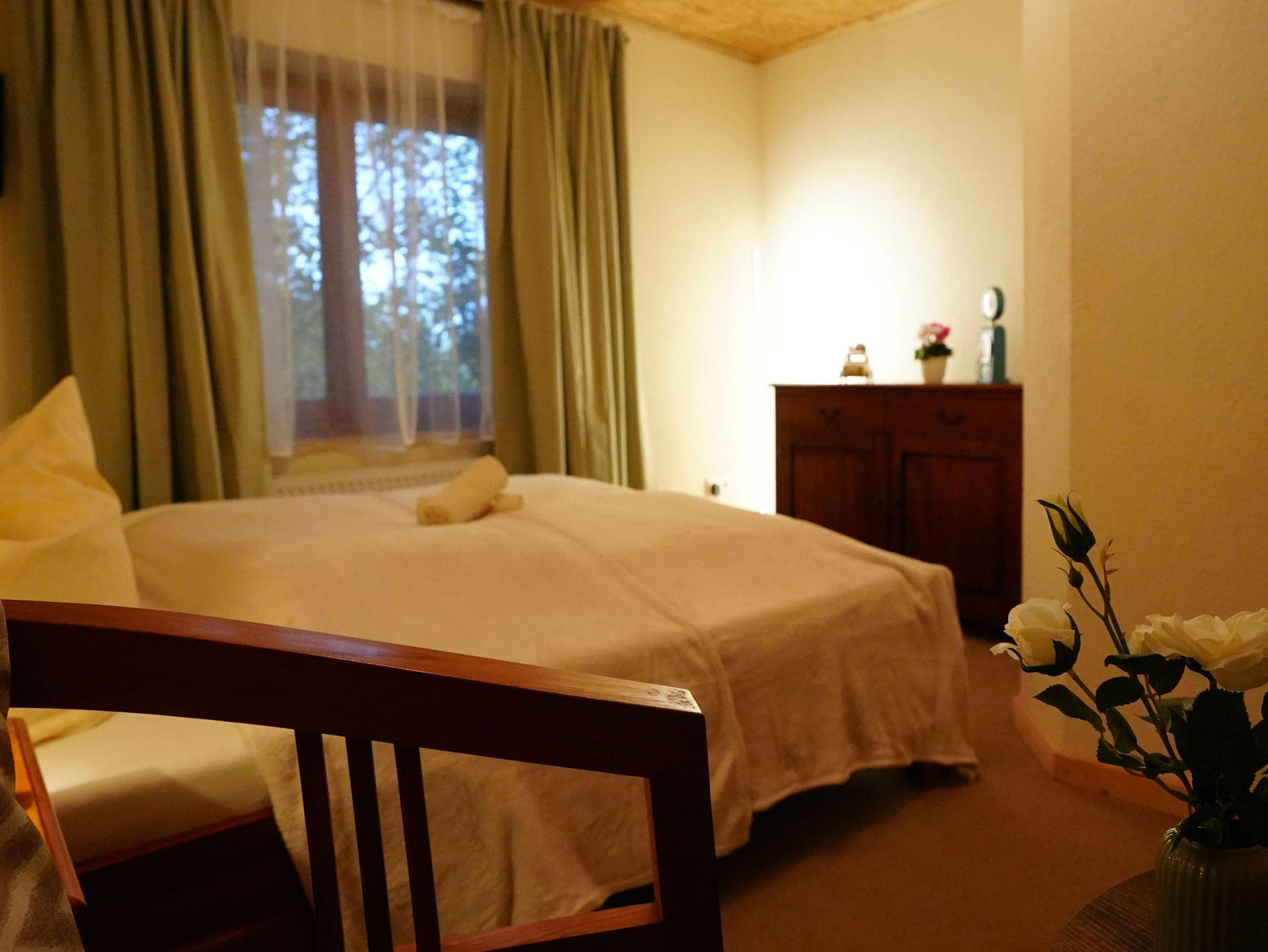 Das Zimmer Gamrig ist mit einem Doppelbett und einer kleinen Sitzecke sowie Dusche und WC eingerichtet.
