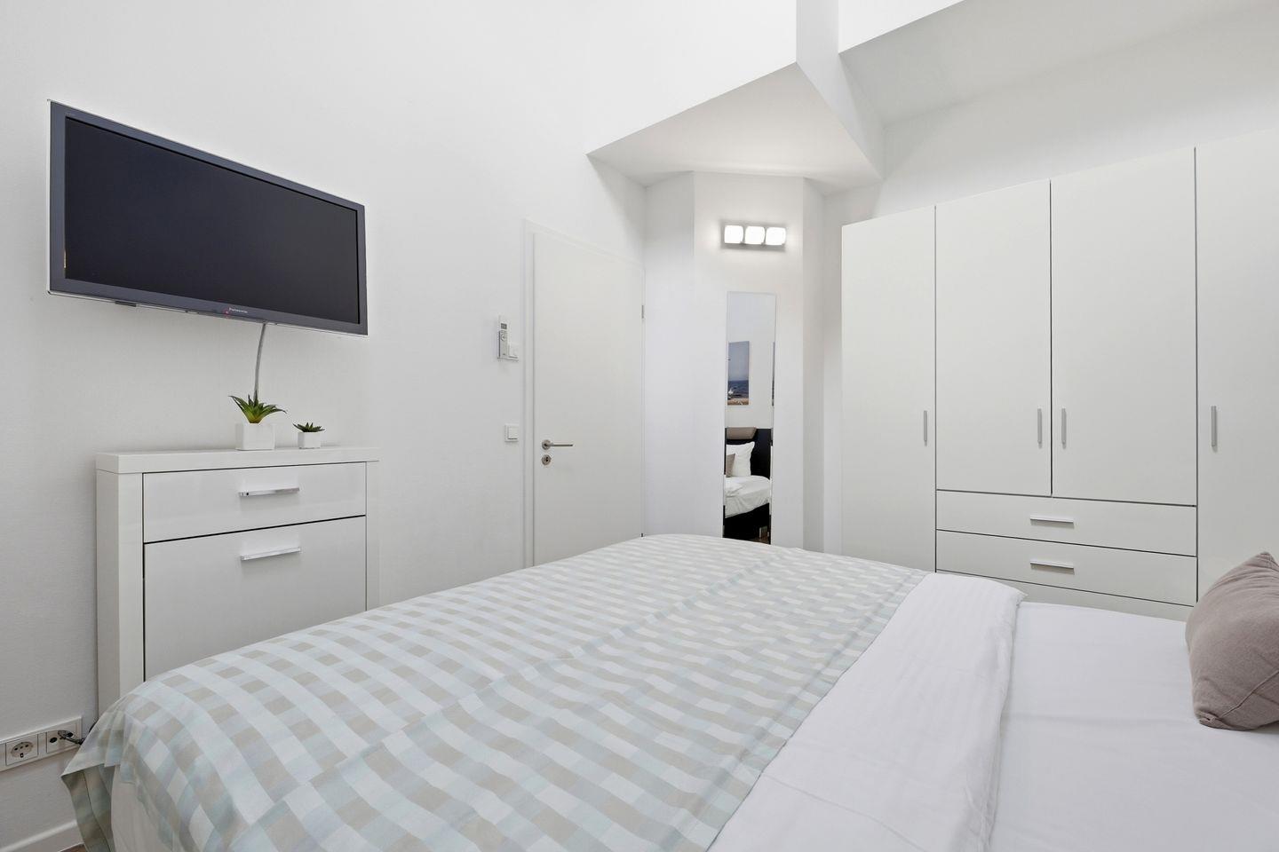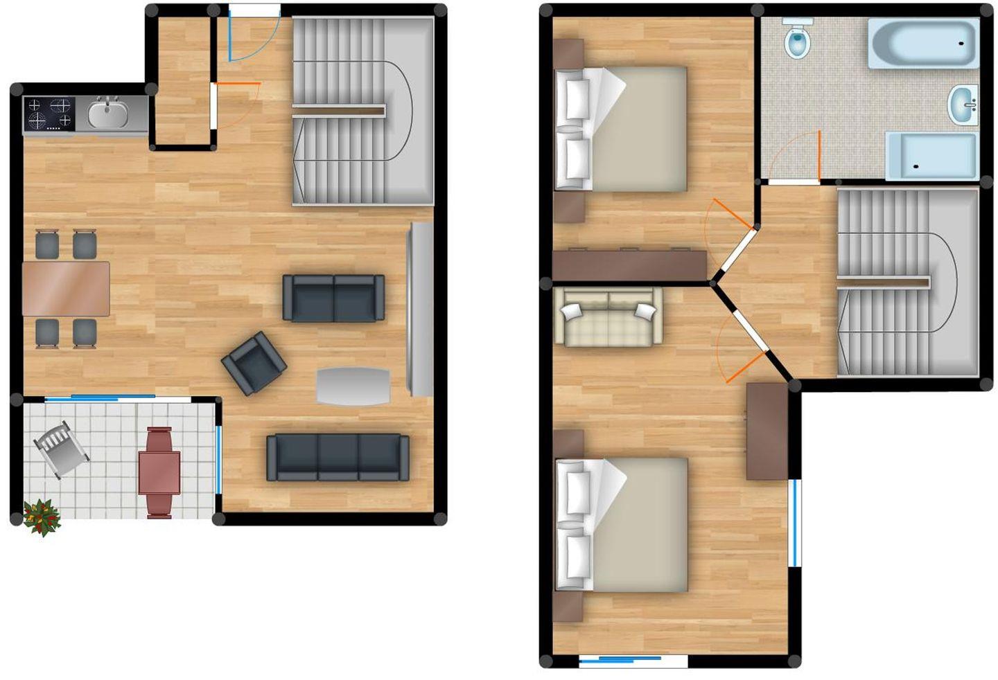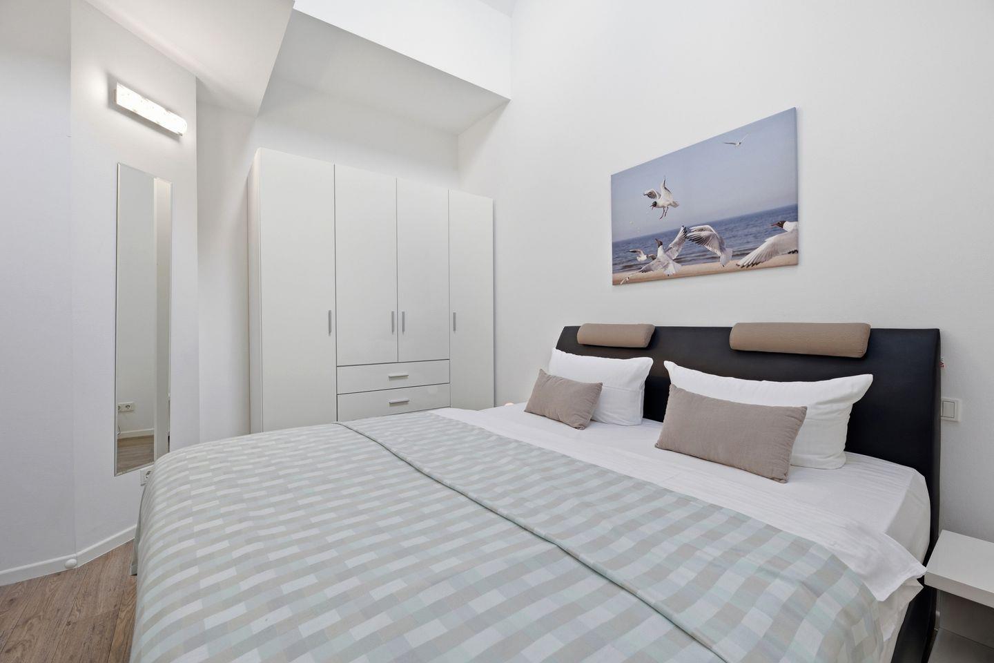 Das Wohnzimmer, durchflutet von natürlichem Licht, verfügt über eine integrierte Einbauküche sowie einen komfortablen Essbereich. Hier können Sie in stilvollem Ambiente köstliche Mahlzeiten zubereiten und genießen. Die obere Etage der Wohnung beherbergt zwei vollwertige Schlafzimmer sowie ein modernes Badezimmer, das durch seine hochwertige Ausstattung Ihren Aufenthalt zusätzlich bereichert.