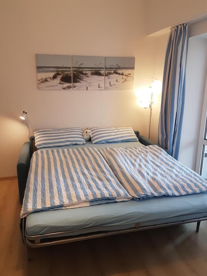 Zentral an der Inselglocke gelegen, bietet die Fewo Strandschnuppe Komfort und Wohlfühl-Ambiente für einen gelungenen Baltrum-Urlaub: Wohn/Schlafbereich mit komfortabler, rückenschonender Schlafcouch und LED-Fernseher, eine Essecke und moderne Küchenzeile mit Spülmaschine, ein schönes Schlafzimmer mit zwei separaten Betten, ein Bad mit Dusche und einen großzügigen, überdachten Balkon mit 2 Sonnenliegen, gemütlicher Bank, Tisch und Stühlen, die zum Verweilen einladen. Insgesamt 2 Erwachsene und bis zu 2 Kinder haben so Platz für einen schönen Urlaub auf Baltrum.