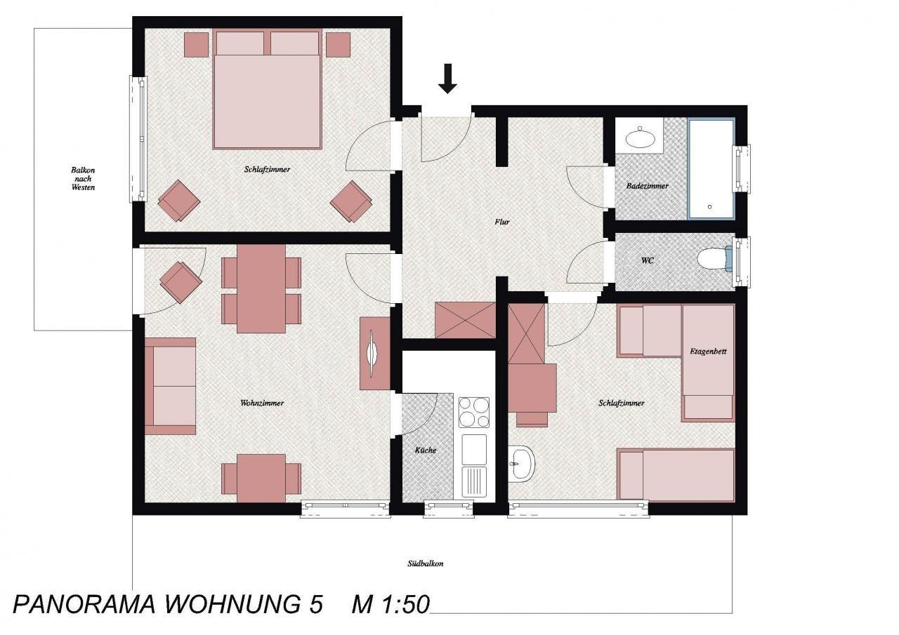 1 Wohnzimmer, 1 Schlafzimmer, 1 Kinderzimmer (3 Betten Stockbett/Einzelbett) mit Waschgel., Bad, WC getrennt, sep. Küche, Flur und Balkon nach Süden und Westen