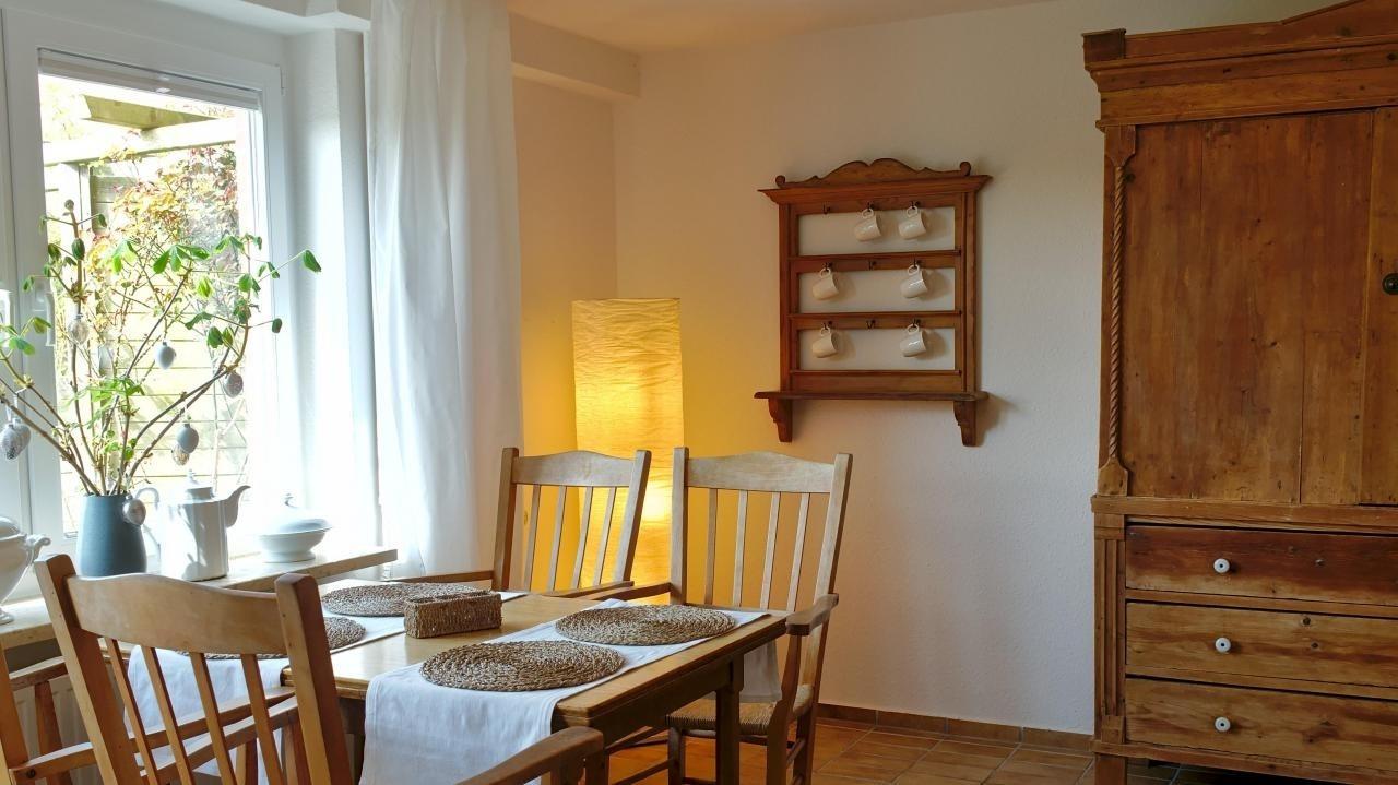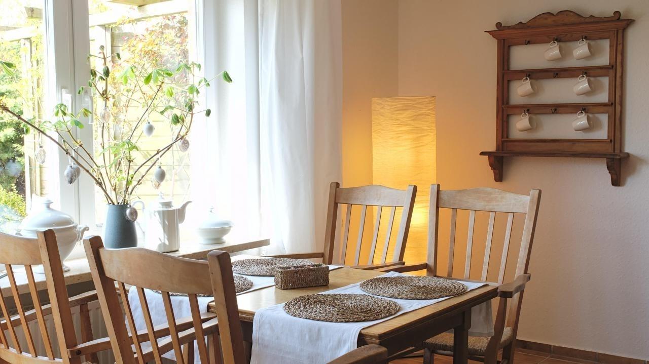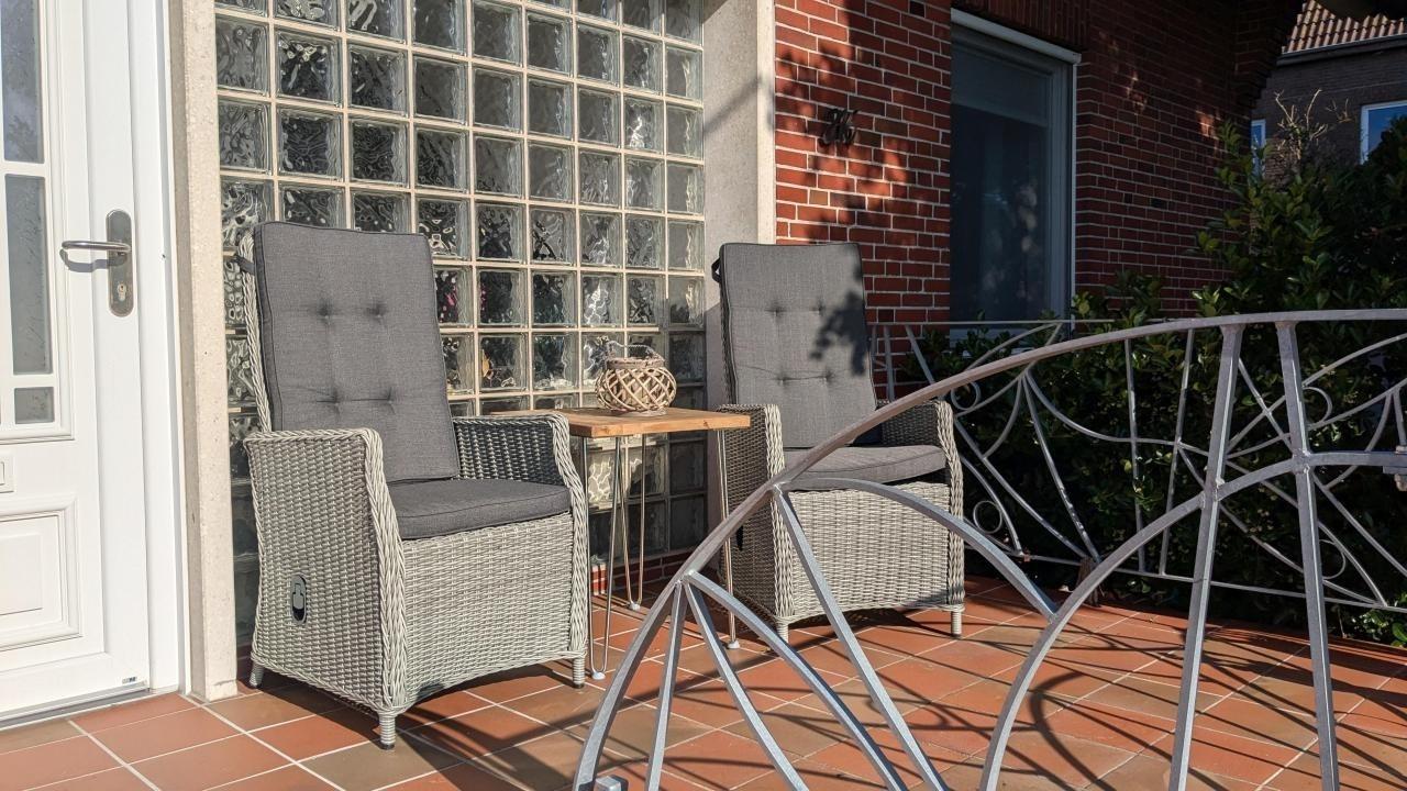 2 Schlafräume (1 Zimmer mit Doppelbett, 1 Zimmer mit getrennten Betten), Wohnzimmer mit Esstisch, separate Küche, Soda-Stream-Gerät, Thermomix, Dusche/WC, Gartennutzung im gemeinschaftlichen Garten, gemütliche Terasse mit Gartentisch und Strandkorb