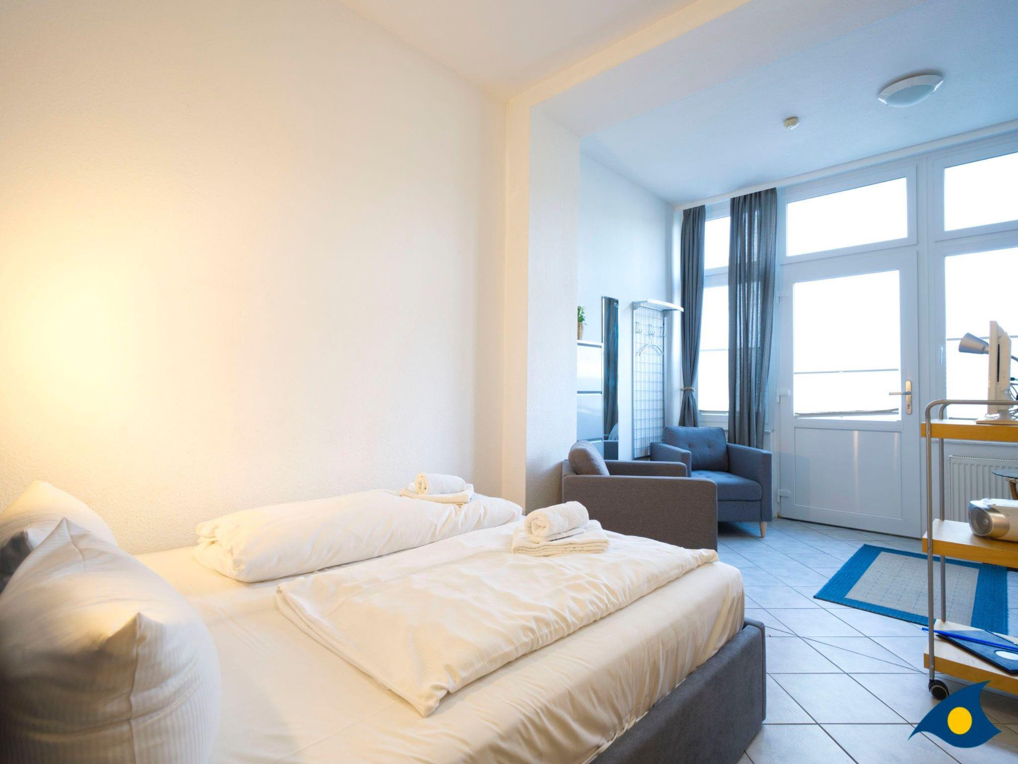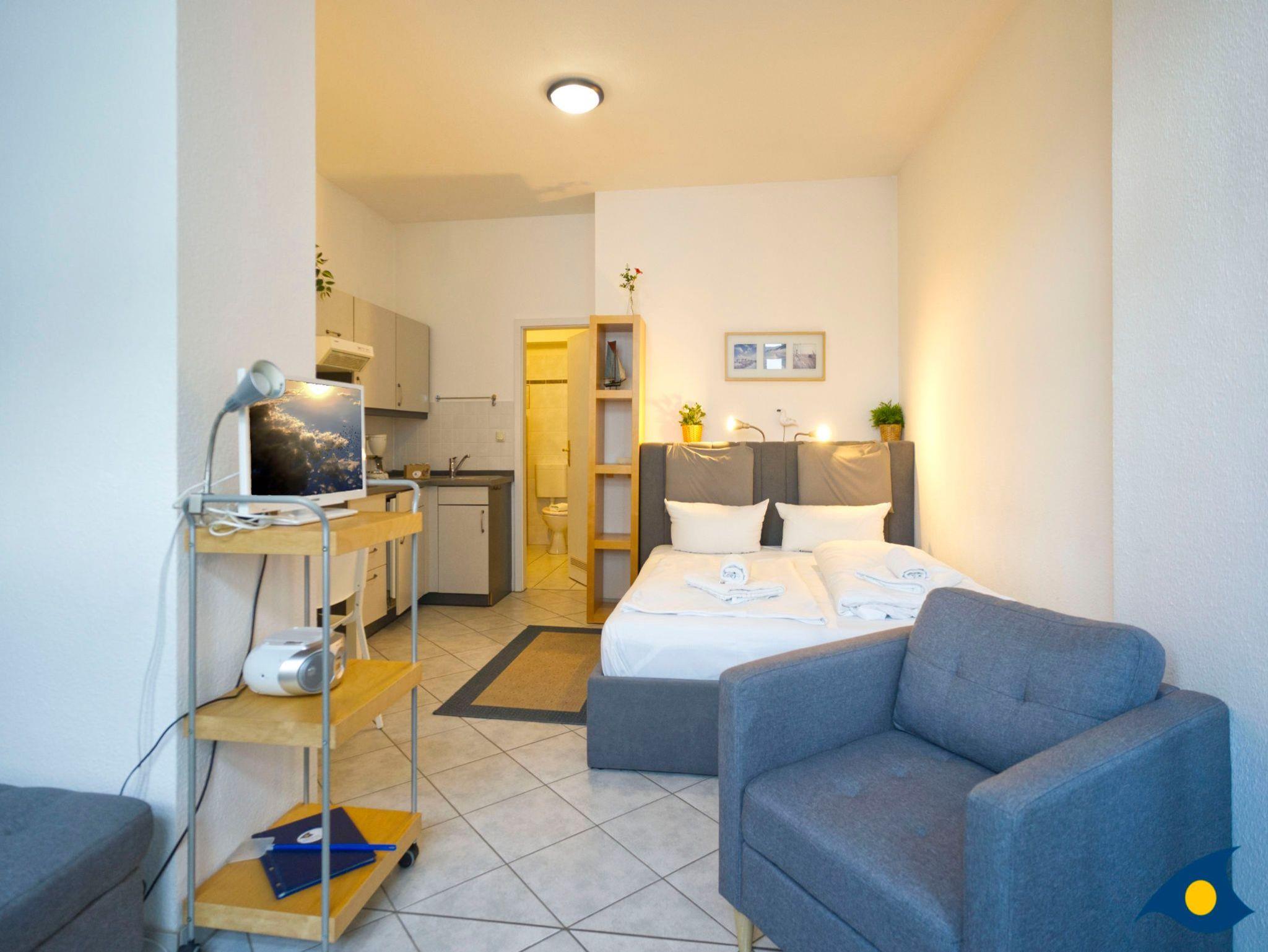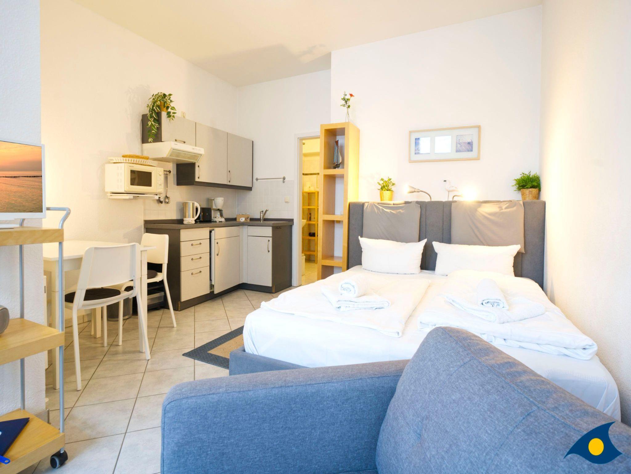 Dieses gemütliche Appartement mit 35 qm Wohnfläche beherbergt alles, was Sie für einen entspannten Urlaub für zwei Personen benötigen. Der kombinierte Wohn- und Schlafraum begrüßt Sie mit einer gemütlichen Sitzecke am hellen Fenster. Im Schlafbereich befindet sich ein bequemes Doppelbett (1,60 m x 2,00 m). Die kleine Küche ist mit einer Mikrowelle, einem 2 Plattenherd und einem Kühlschrank ausgestattet. Die zusätzliche Abstellkammer kann für die Koffer und als Garderobe genutzt werden.