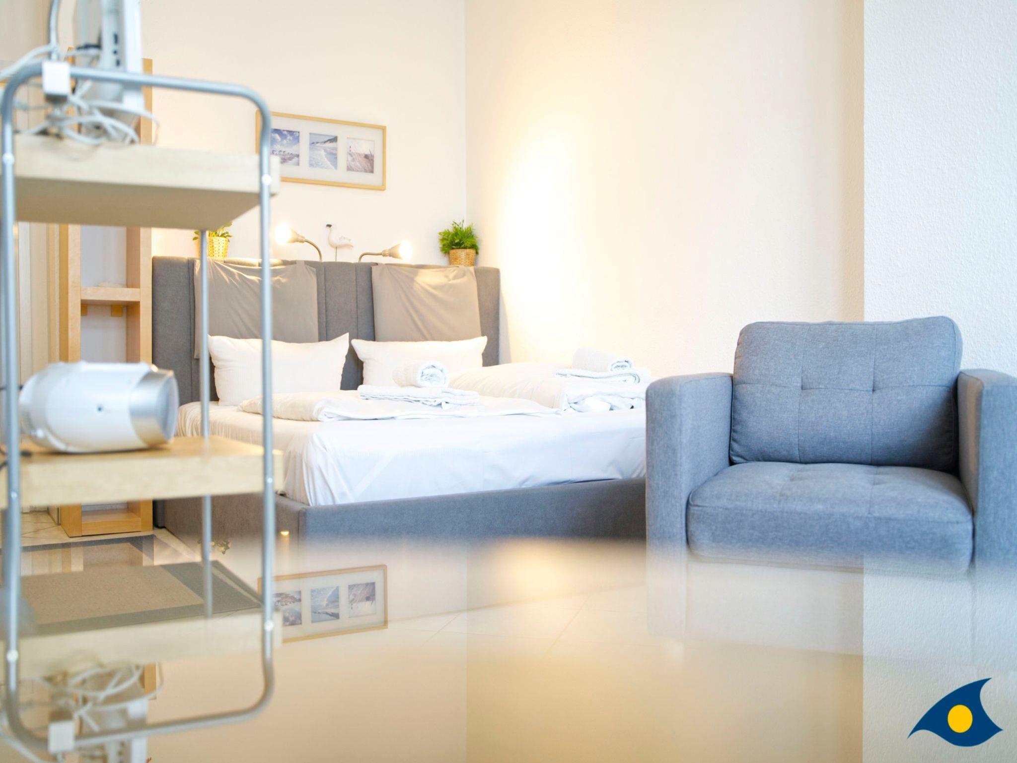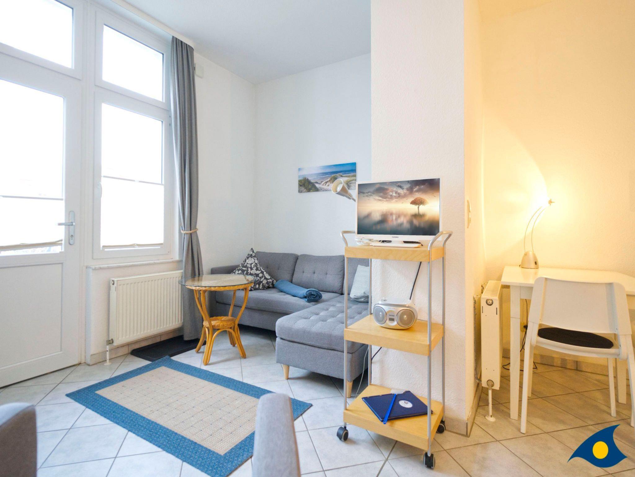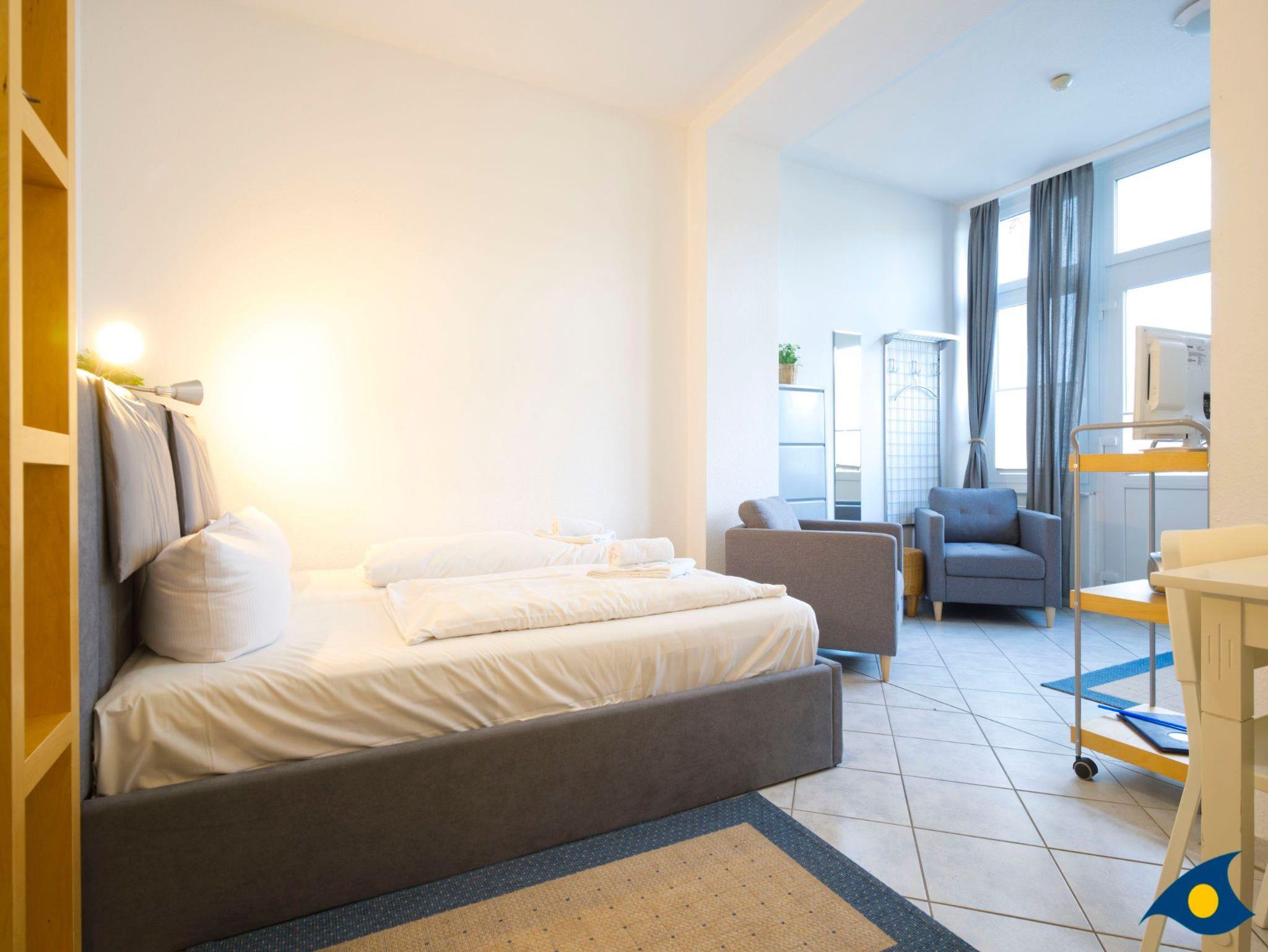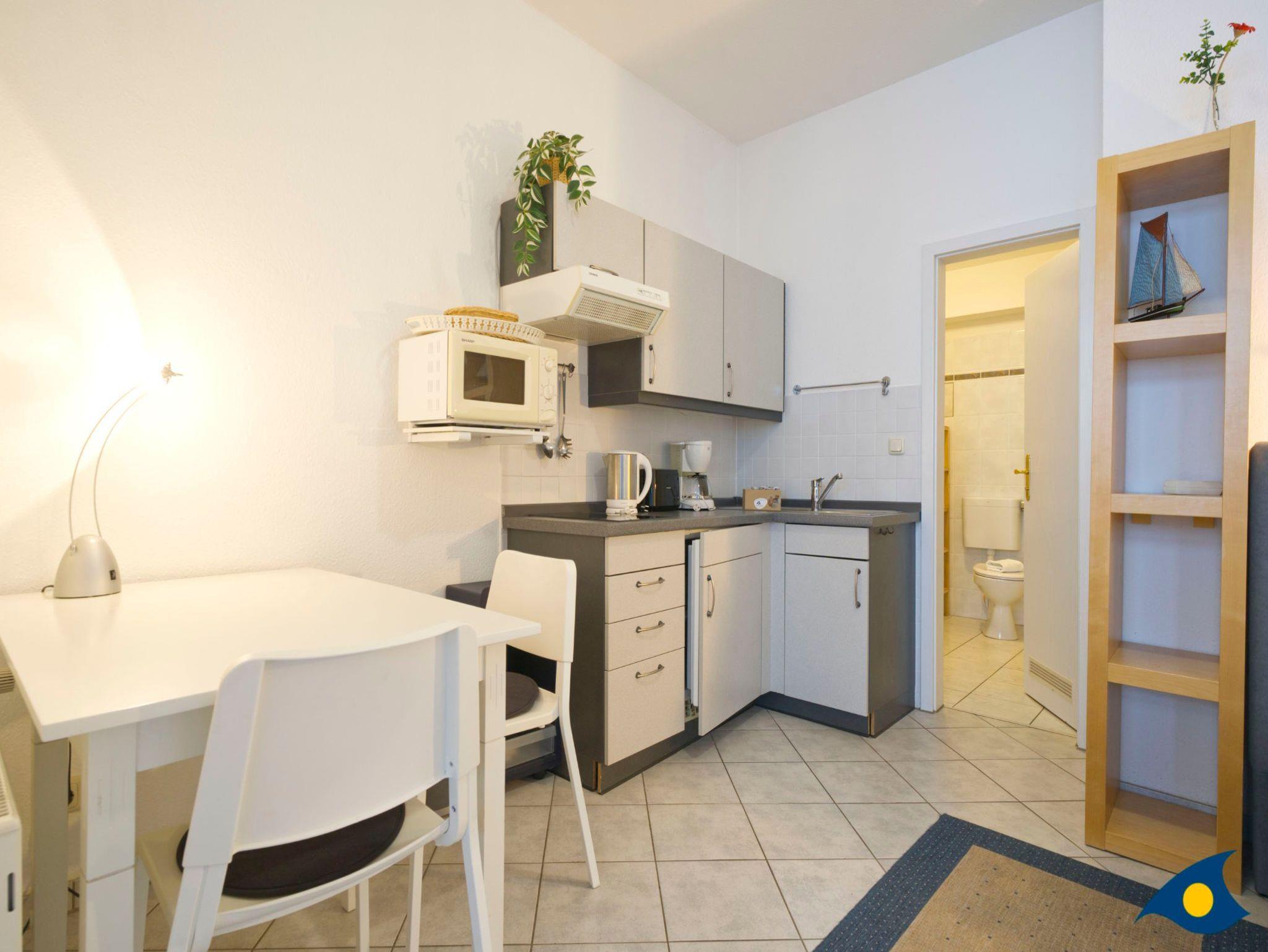Dieses gemütliche Appartement mit 35 qm Wohnfläche beherbergt alles, was Sie für einen entspannten Urlaub für zwei Personen benötigen. Der kombinierte Wohn- und Schlafraum begrüßt Sie mit einer gemütlichen Sitzecke am hellen Fenster. Im Schlafbereich befindet sich ein bequemes Doppelbett (1,60 m x 2,00 m). Die kleine Küche ist mit einer Mikrowelle, einem 2 Plattenherd und einem Kühlschrank ausgestattet. Die zusätzliche Abstellkammer kann für die Koffer und als Garderobe genutzt werden.