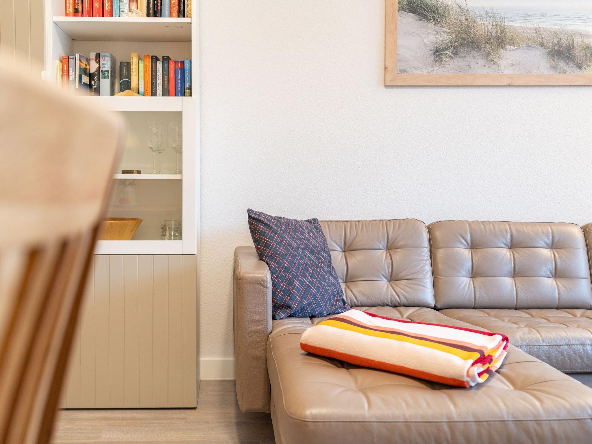 In dem 3-Raum-Appartement im Dachgeschoss können bis zu 4 Personen auf 62 Quadratmetern ihre erholsame Urlaubszeit gemeinsam verbringen. Der gemütliche Wohn-, Koch- und Essbereich ist in warmen Tönen gehalten. Die integrierte Küchenzeile bietet dank Geschirrspüler, Kühlschrank mit Gefrierfach, Backofen, Mikrowelle, Wasserkocher, Toaster, Kaffeemaschine und vielen Extras jeglichen Kochkomfort. Ein bequemes Sofa, ein Sessel, Flat TV sowie ein Esstisch für vier Personen laden zum Entspannen und geselligem Beisammensein ein.