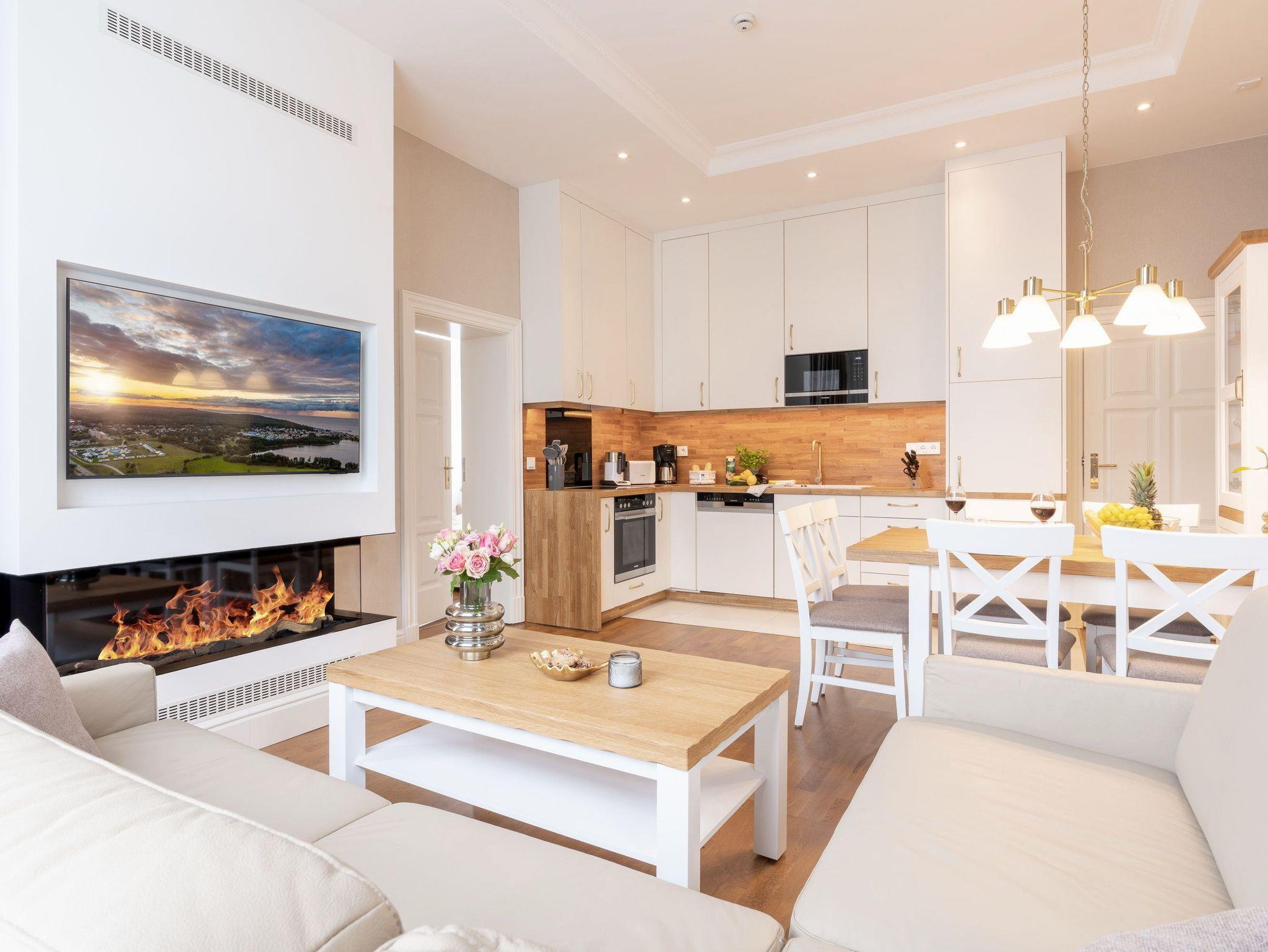 Das helle Drei-Zimmer-Appartement im Hochparterre bietet 60?Quadratmeter Raum zum Wohlfühlen. Der großzügige Wohnbereich mit elegantem Gaskamin lädt zum gemeinsamen Kuscheln, Lesen oder einfach Entspannen ein. Auf der bequemen Couch können Sie den Tag ausklingen lassen, während der Flat-TV Unterhaltung für Groß und Klein bietet. Hochwertiges Echtholzparkett und langlebige Designer-Tapeten aus den USA verleihen dem Appartement einen warmen, stilvollen Charakter.