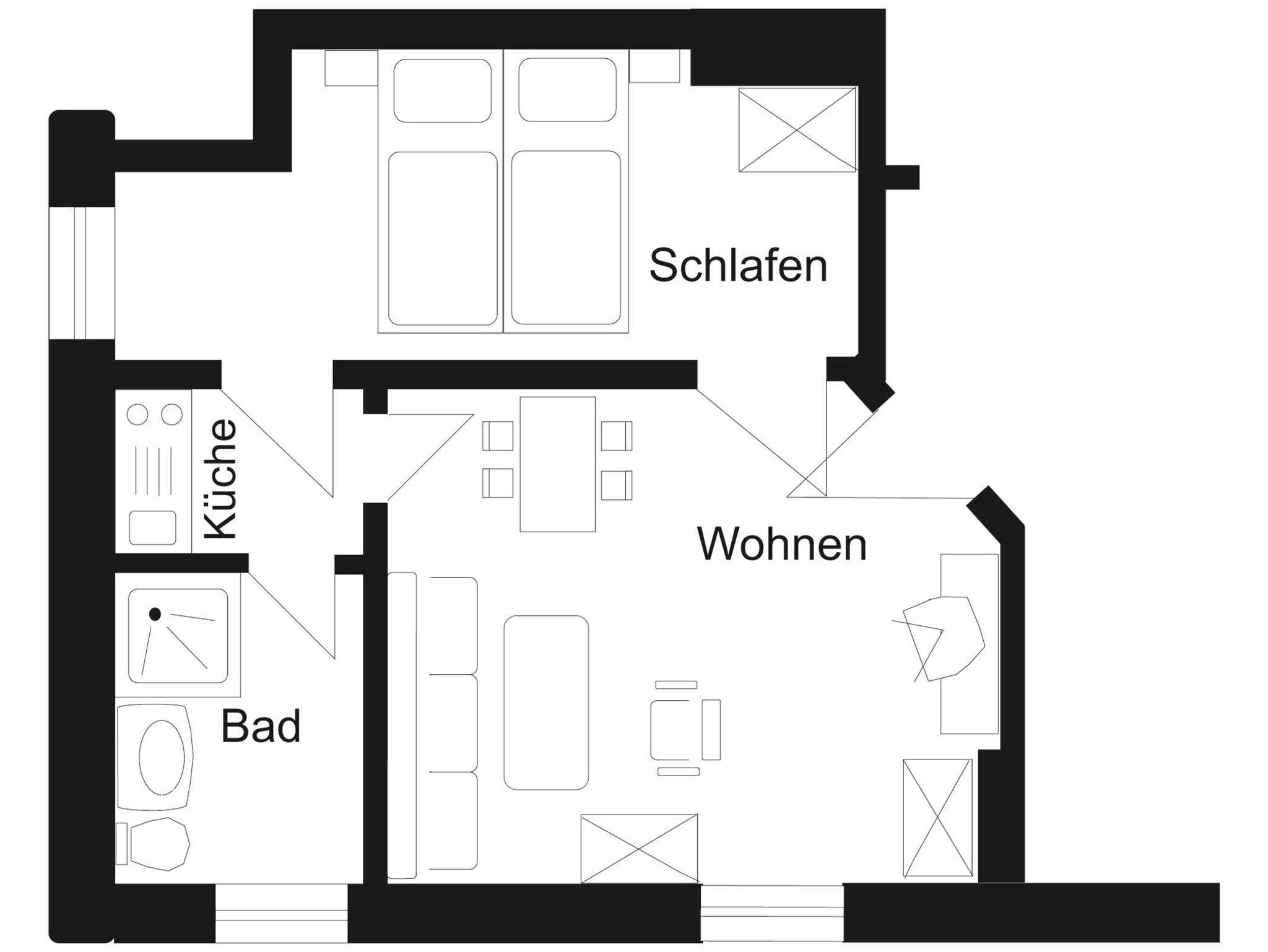 Für 1-3 Personen, 33-40 qm, Pantry- bzw. Mini-Küche, DU/WC, im EG oder 2. OG, Blick Richtung Stadt/Hof. Zimmergrundrisse und Größe können leicht variieren.