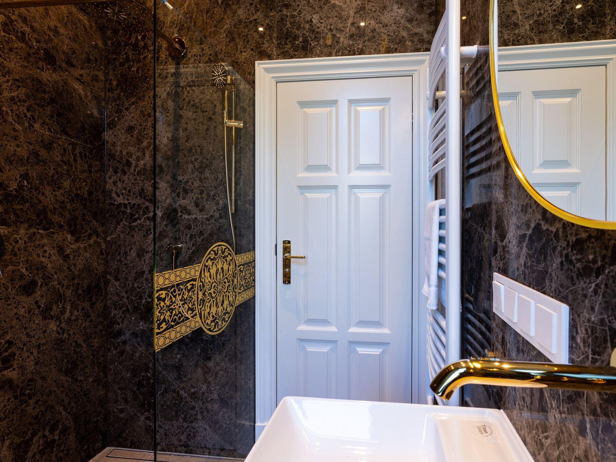 Das stilvoll gestaltete Badezimmer setzt Akzente durch großformatige dunkle Natursteinfliesen, helle Badkeramik sowie Armaturen und Accessoires in edlem Messing und ist mit einer bodengleichen Dusche ausgestattet für einen erholsamen Start in den Tag.
