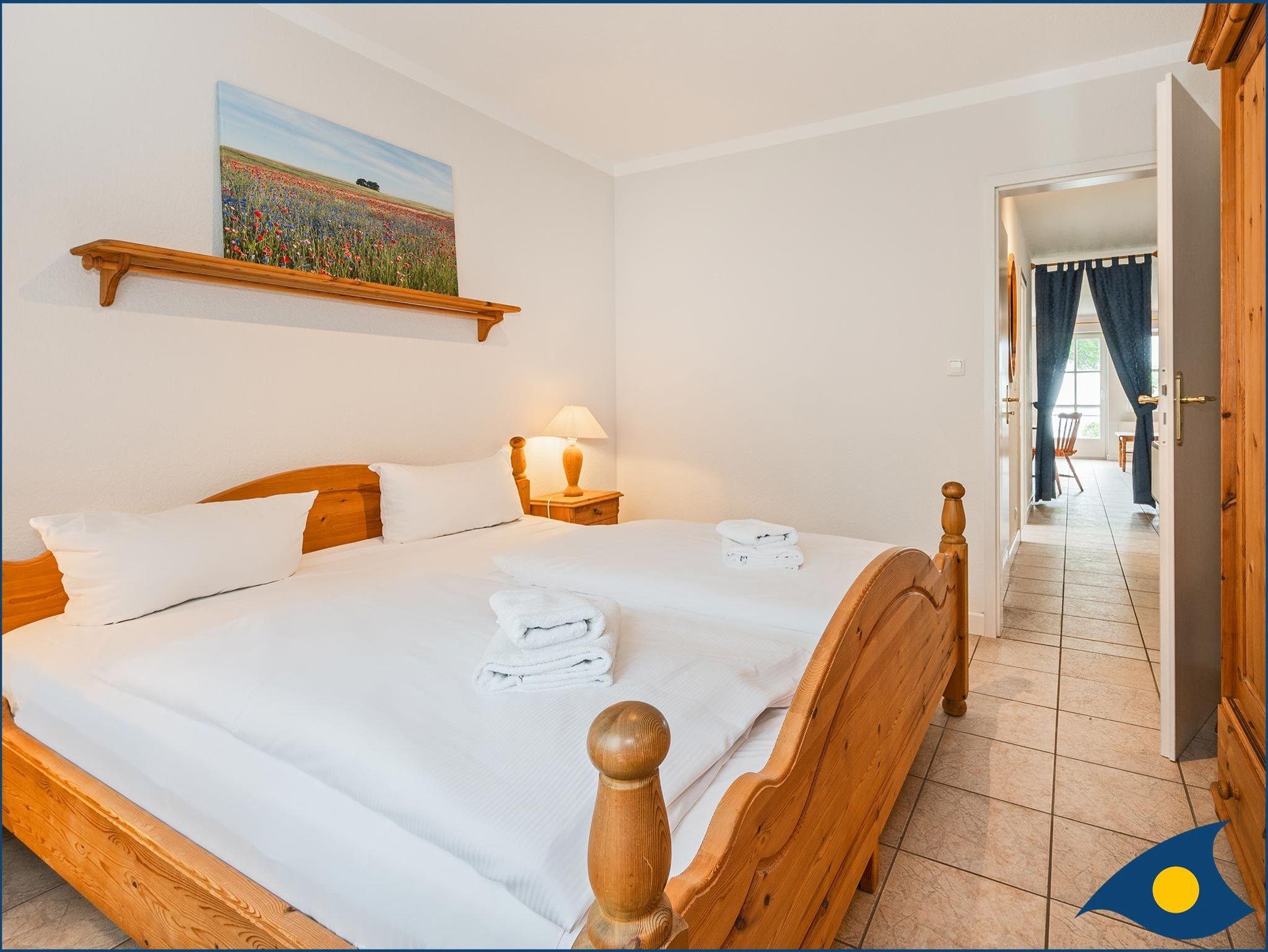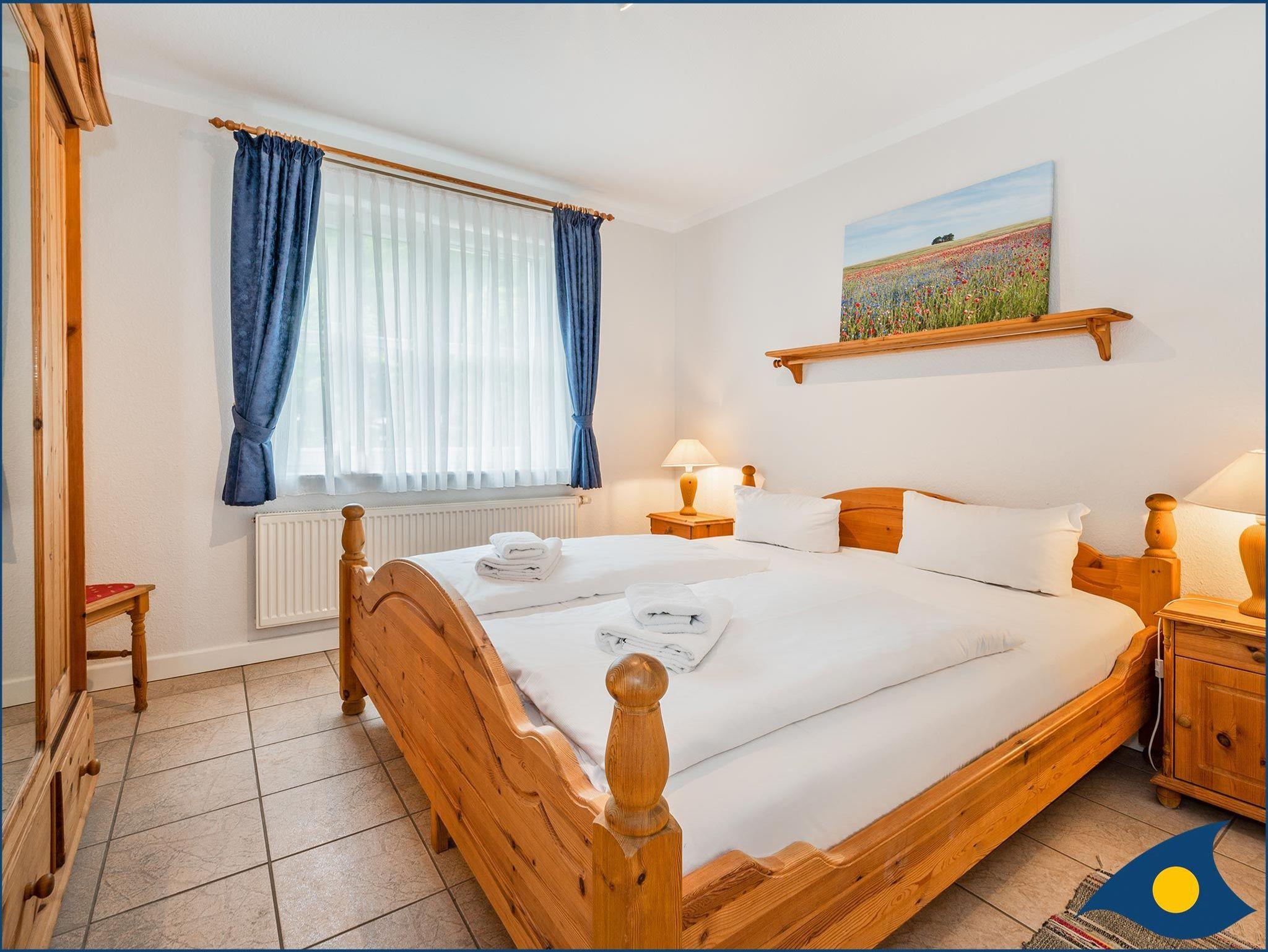 Das Schlafzimmer mit dem großen Holzbett sorgt für erholsamen Schlaf und bietet genügend Platz für Ihre Urlaubsgarderobe. Das Badezimmer ist mit einem WC, dem Handwaschbecken und einer Dusche ausgestattet.