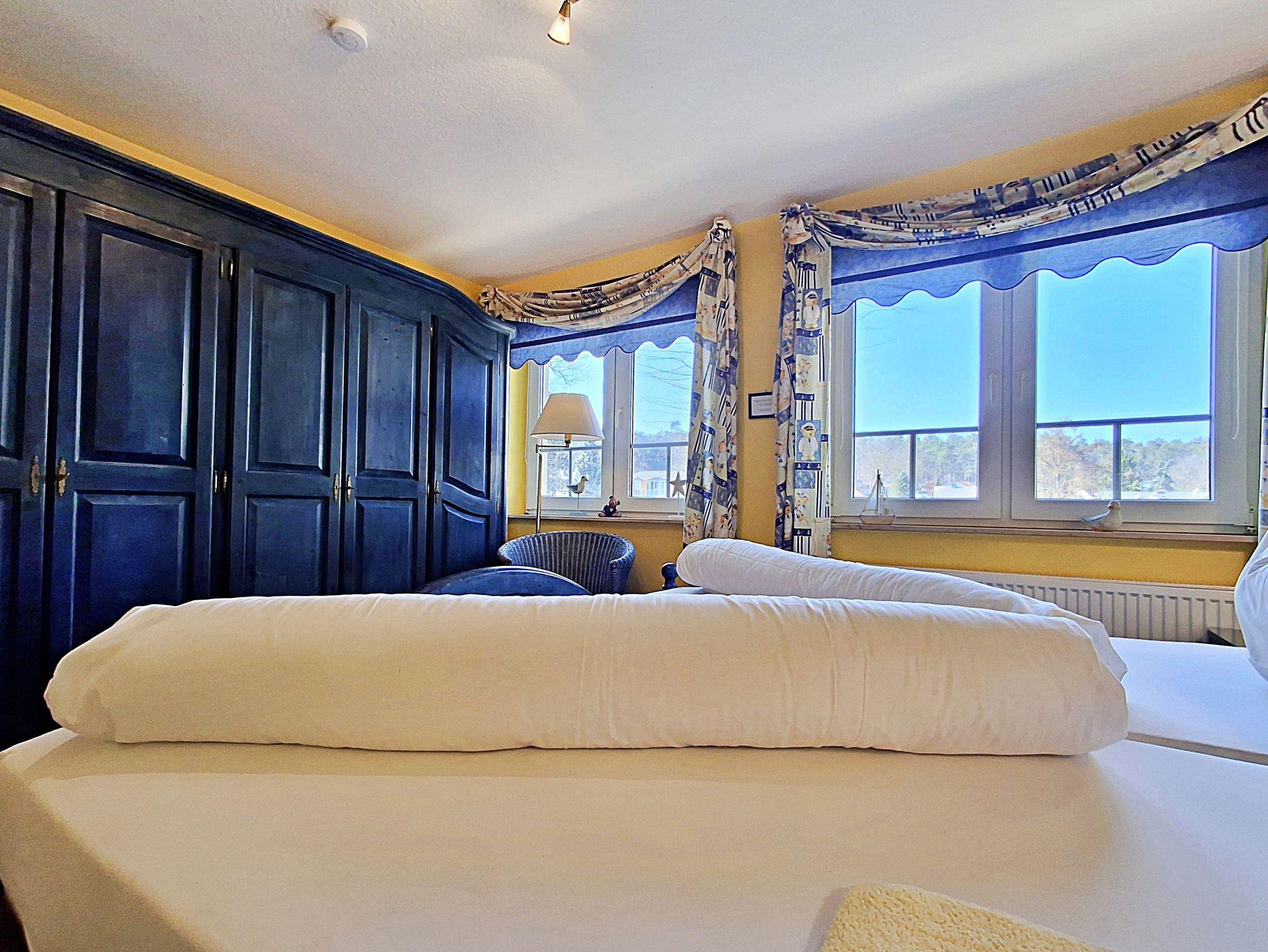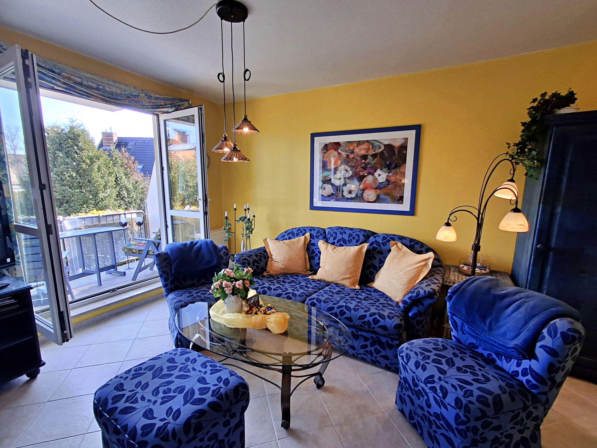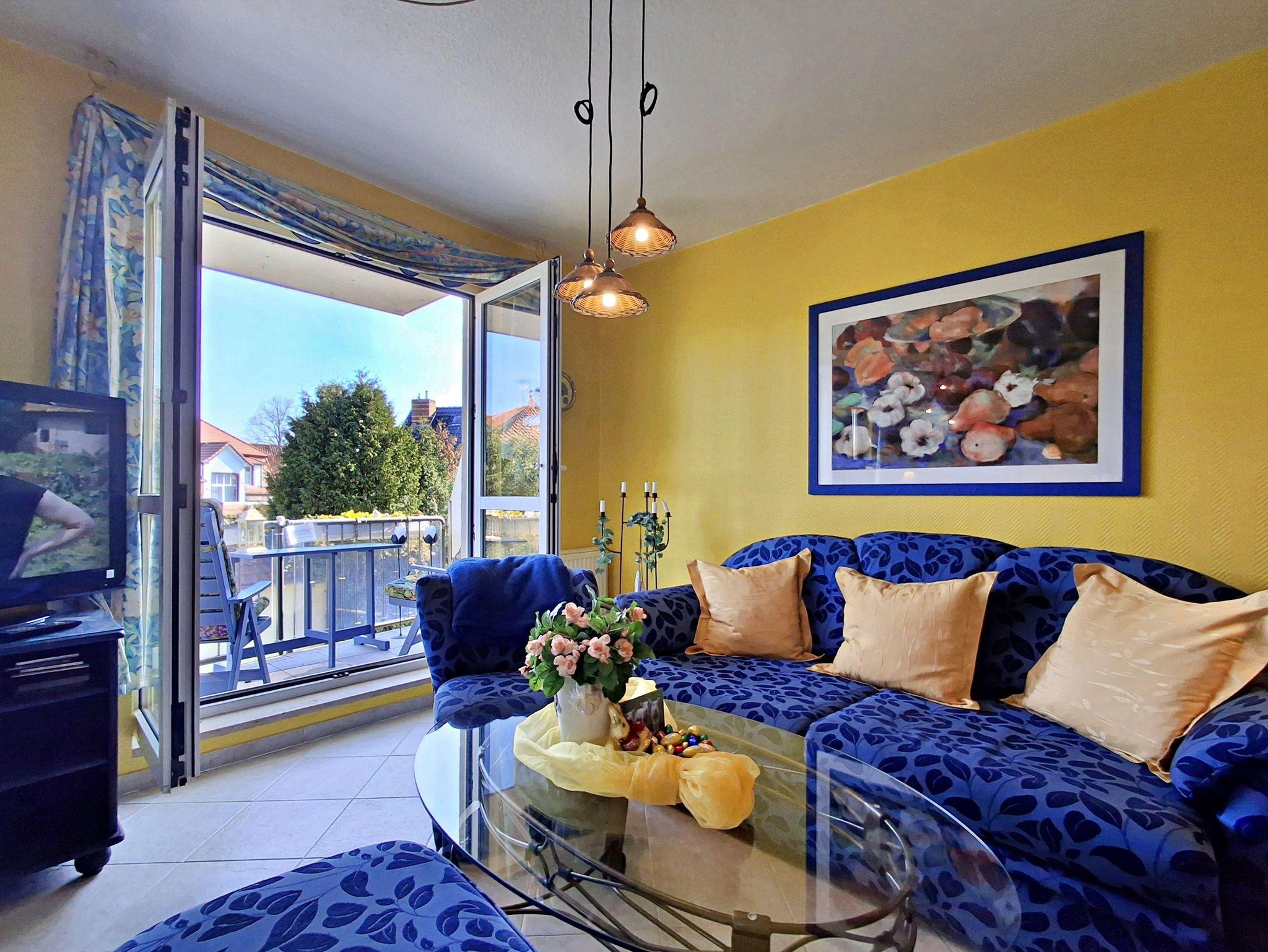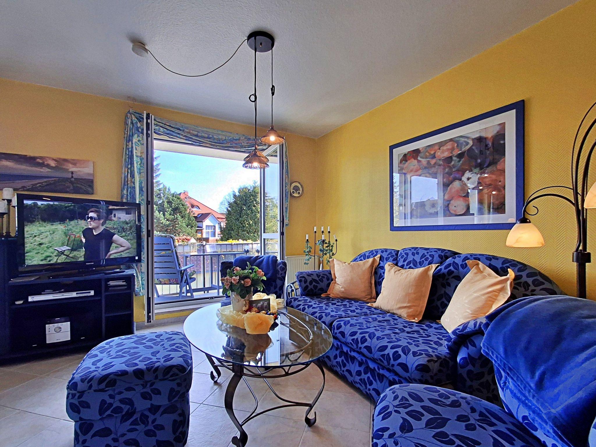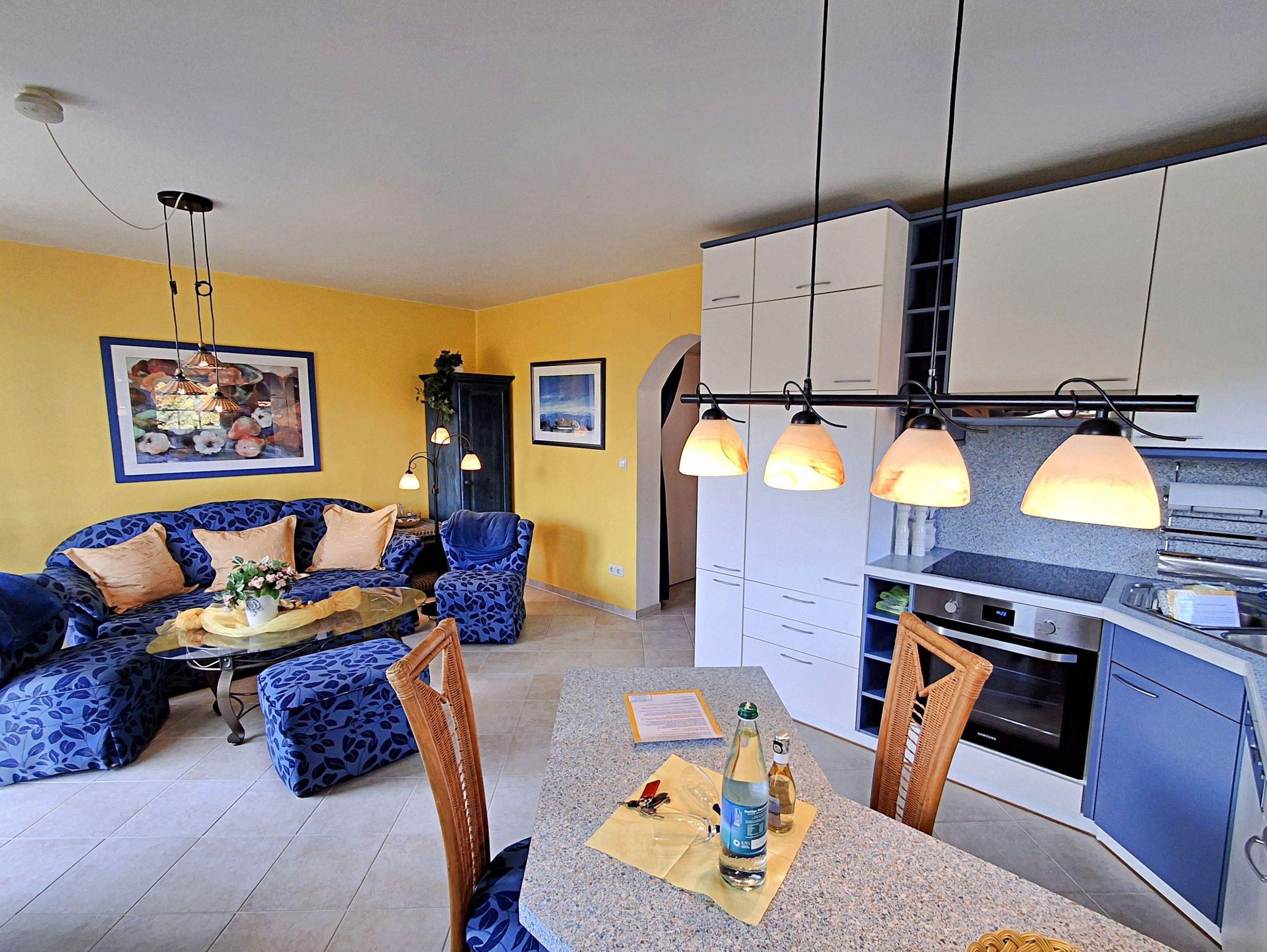 Moderne und komfortable 2-Raum-Ferienwohnung im 1. Obergeschoss (ca. 48 qm) mit sonnigem Balkon zur Ostseite - ideal für einen entspannten Aufenthalt. Alle Räume sind harmonisch in den Farben Blau, Weiß und Gelb gestaltet und schaffen eine freundliche Wohlfühlatmosphäre. Der helle Wohnbereich ist mit einer gepolsterten Doppelbettcouch, bequemen Sesseln, einem Schreibtisch, Kommoden, Schrank und Glastisch ausgestattet. Hier stehen Kabel-TV, Radio mit CD-Player sowie ein Telefon (gebührenpflichtig) zur Verfügung. Die offene Küche ist voll ausgestattet und lässt keine Wünsche offen: Geschirrspüler, Cerankochfeld, Backofen, Mikrowelle, Kaffeemaschine, Espressomaschine, Wasserkocher, Toaster sowie ausreichend Geschirr stehen für Sie bereit. Das gemütliche Schlafzimmer mit Doppelbett, Nachttischen, großem Kleiderschrank, praktischen Ablagemöglichkeiten und einem Sessel sorgt für zusätzlichen Komfort. Das Tageslicht-Badezimmer bietet Dusche/WC, Haartrockner sowie zusätzliche Ablagemöglichkeiten.