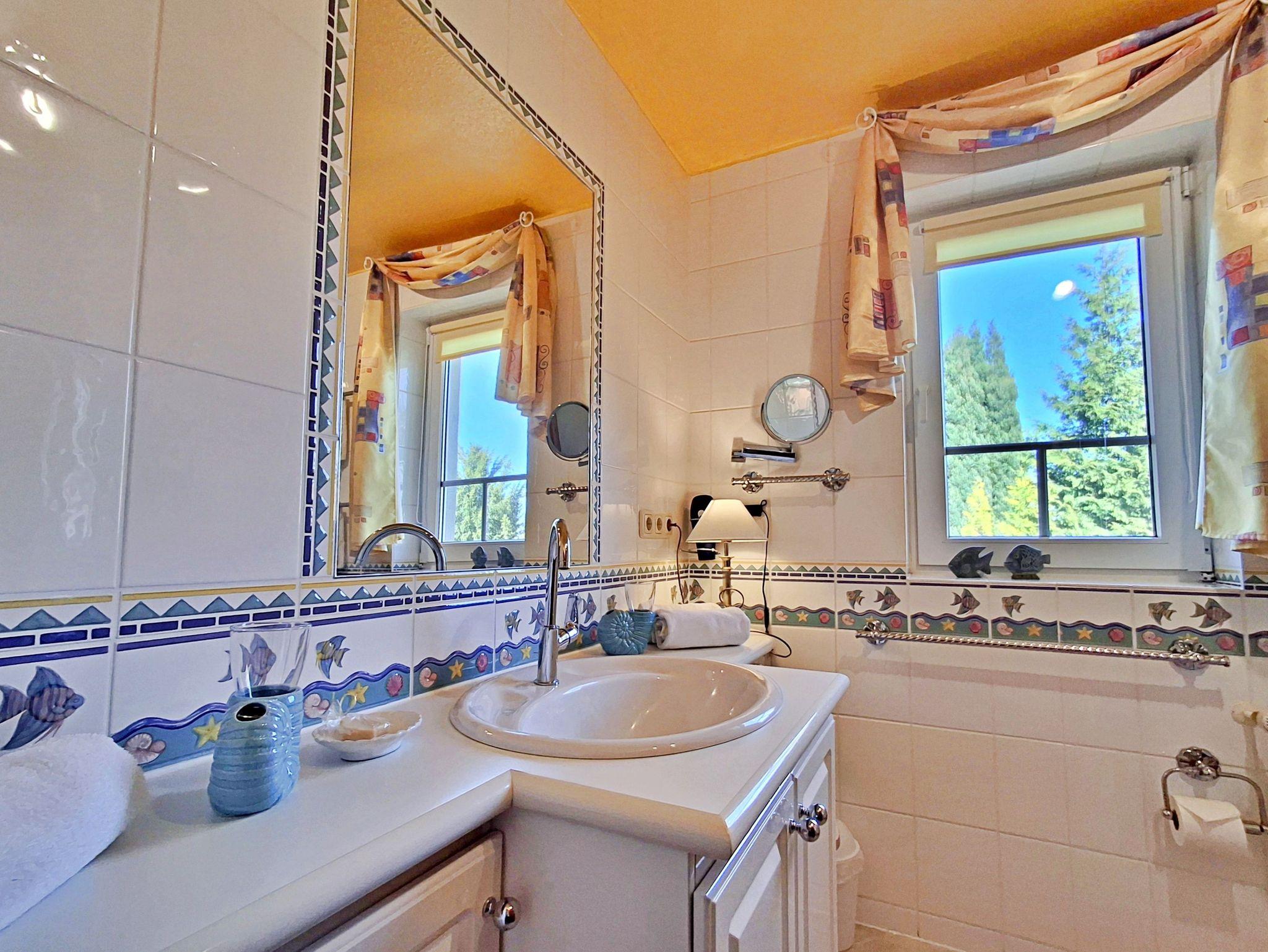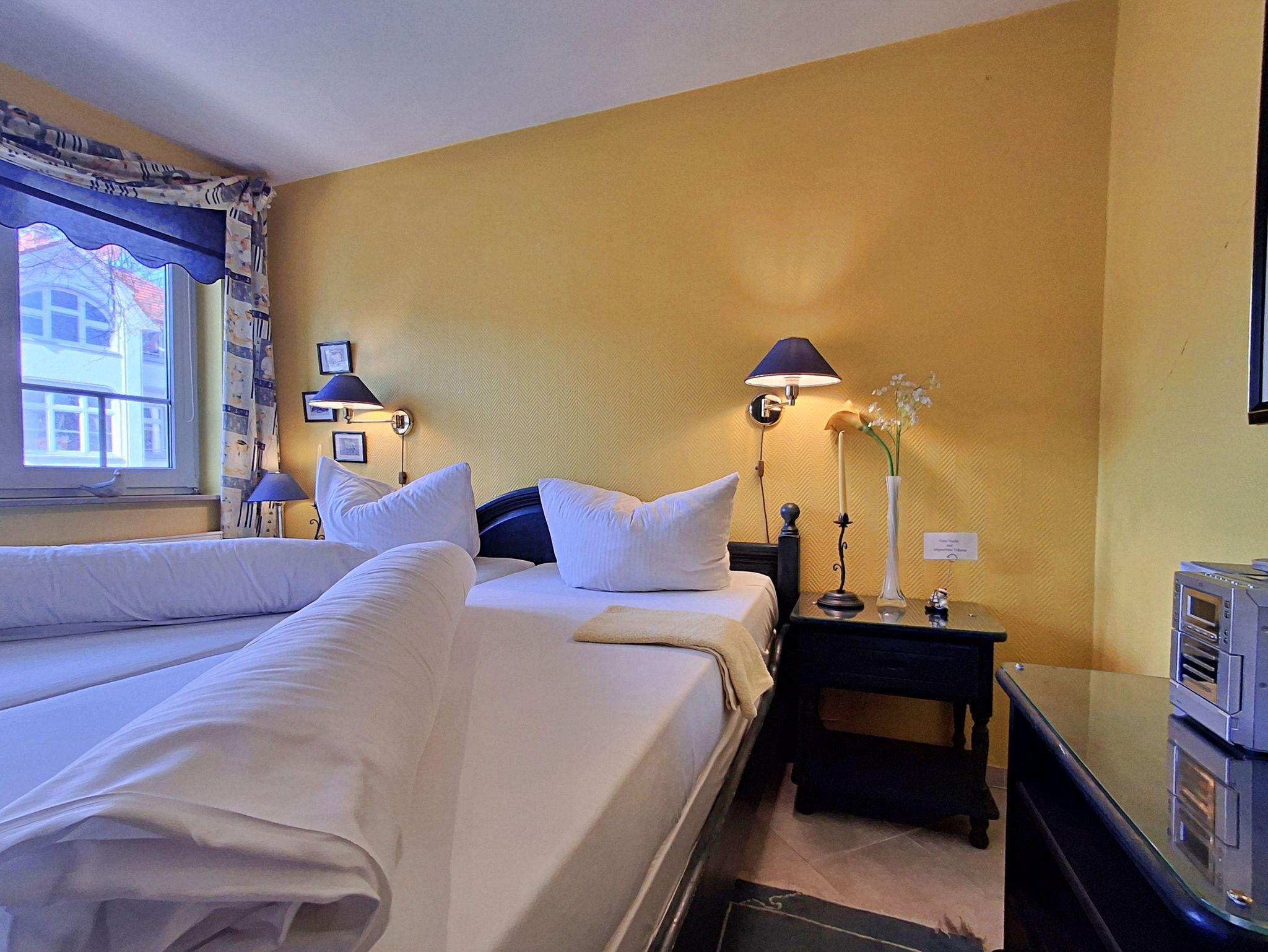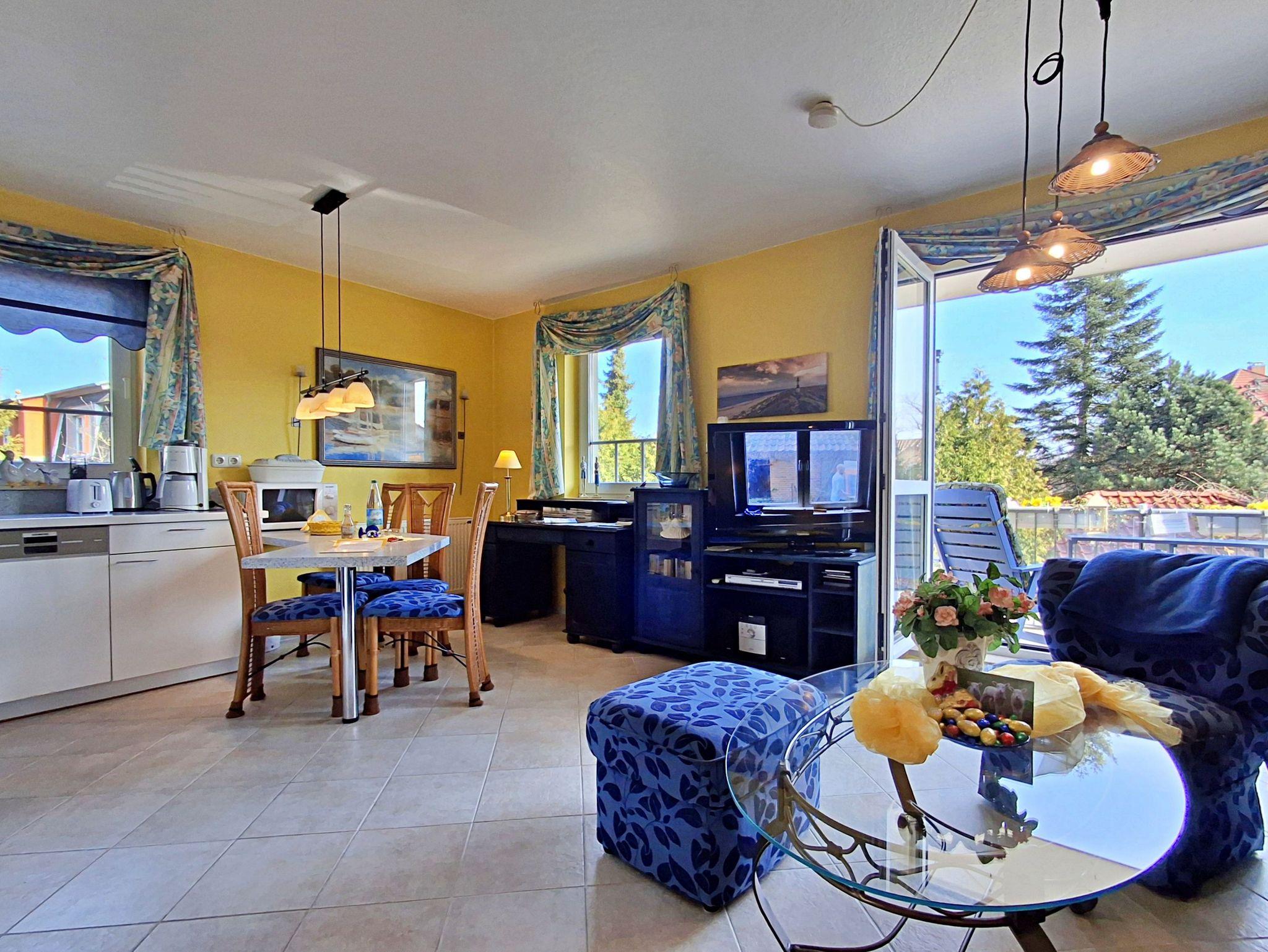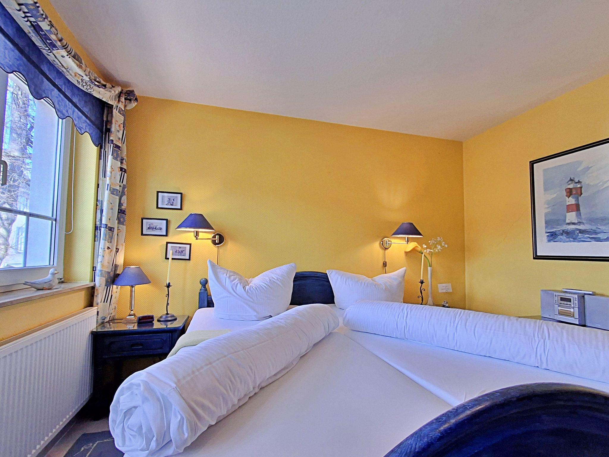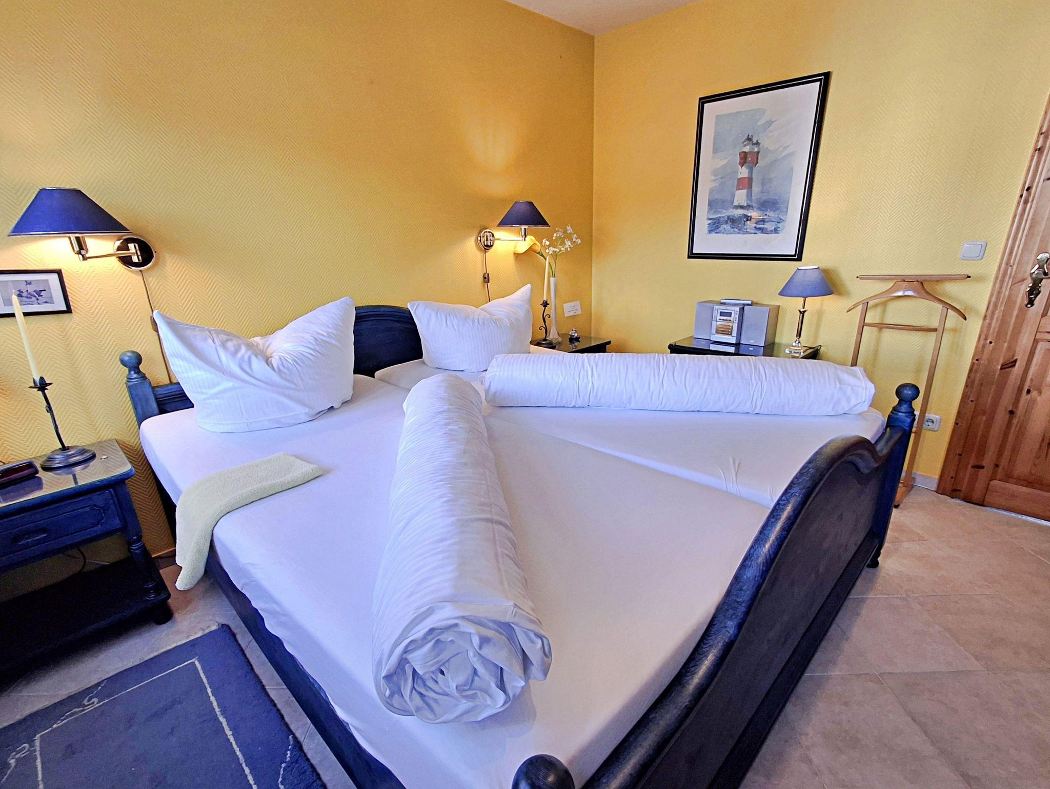Moderne und komfortable 2-Raum-Ferienwohnung im 1. Obergeschoss (ca. 48 qm) mit sonnigem Balkon zur Ostseite - ideal für einen entspannten Aufenthalt. Alle Räume sind harmonisch in den Farben Blau, Weiß und Gelb gestaltet und schaffen eine freundliche Wohlfühlatmosphäre. Der helle Wohnbereich ist mit einer gepolsterten Doppelbettcouch, bequemen Sesseln, einem Schreibtisch, Kommoden, Schrank und Glastisch ausgestattet. Hier stehen Kabel-TV, Radio mit CD-Player sowie ein Telefon (gebührenpflichtig) zur Verfügung. Die offene Küche ist voll ausgestattet und lässt keine Wünsche offen: Geschirrspüler, Cerankochfeld, Backofen, Mikrowelle, Kaffeemaschine, Espressomaschine, Wasserkocher, Toaster sowie ausreichend Geschirr stehen für Sie bereit. Das gemütliche Schlafzimmer mit Doppelbett, Nachttischen, großem Kleiderschrank, praktischen Ablagemöglichkeiten und einem Sessel sorgt für zusätzlichen Komfort. Das Tageslicht-Badezimmer bietet Dusche/WC, Haartrockner sowie zusätzliche Ablagemöglichkeiten.
