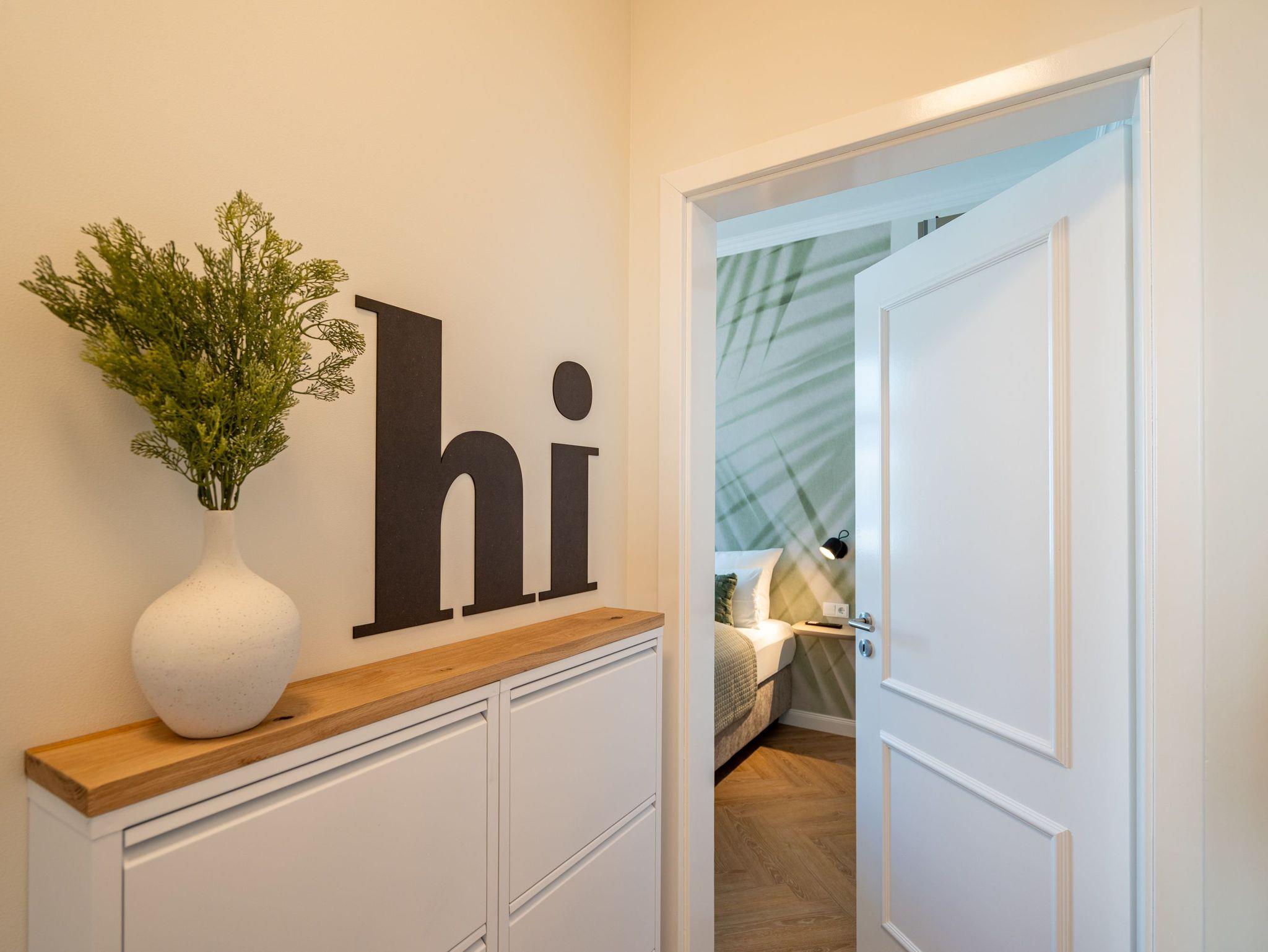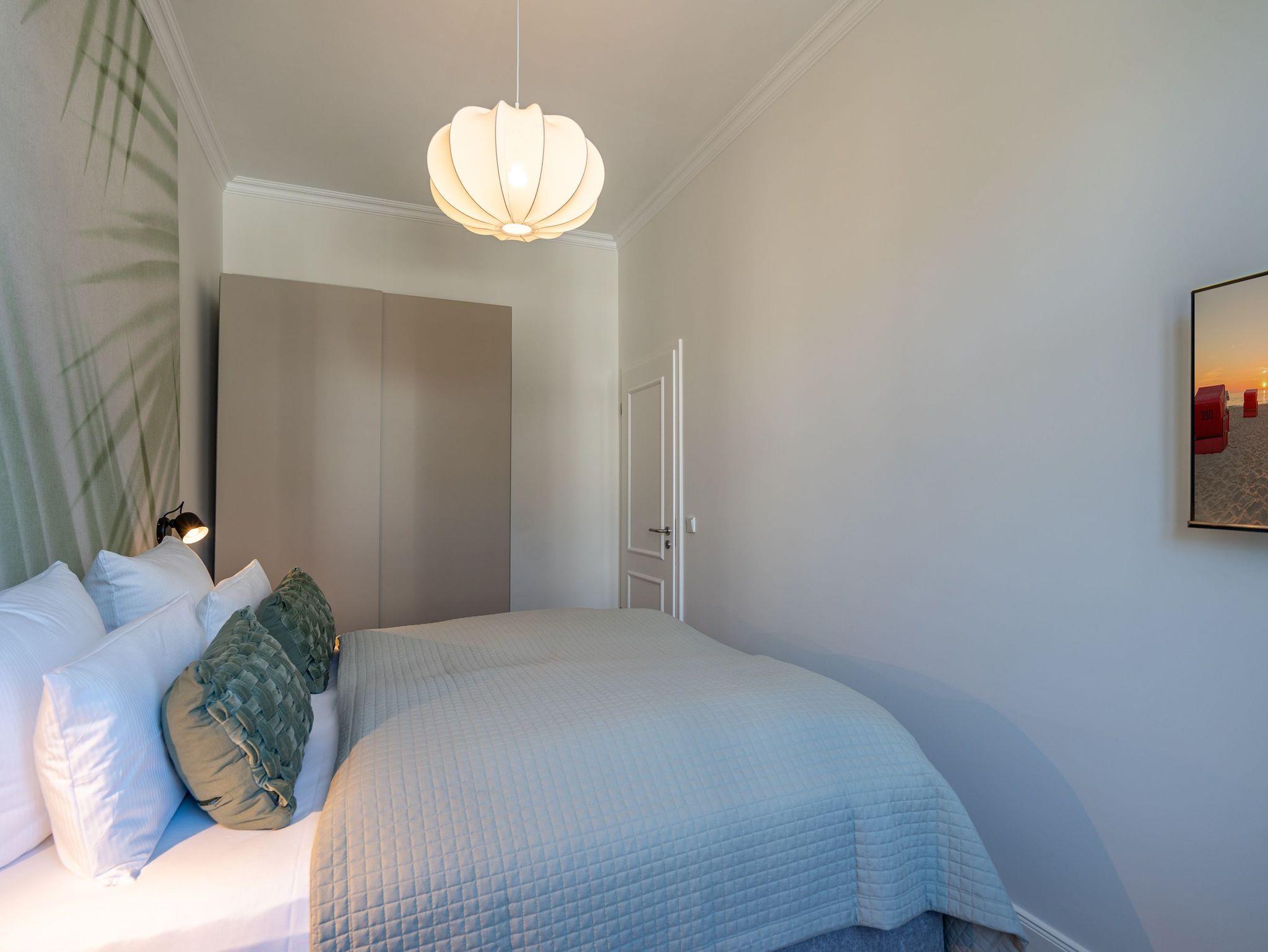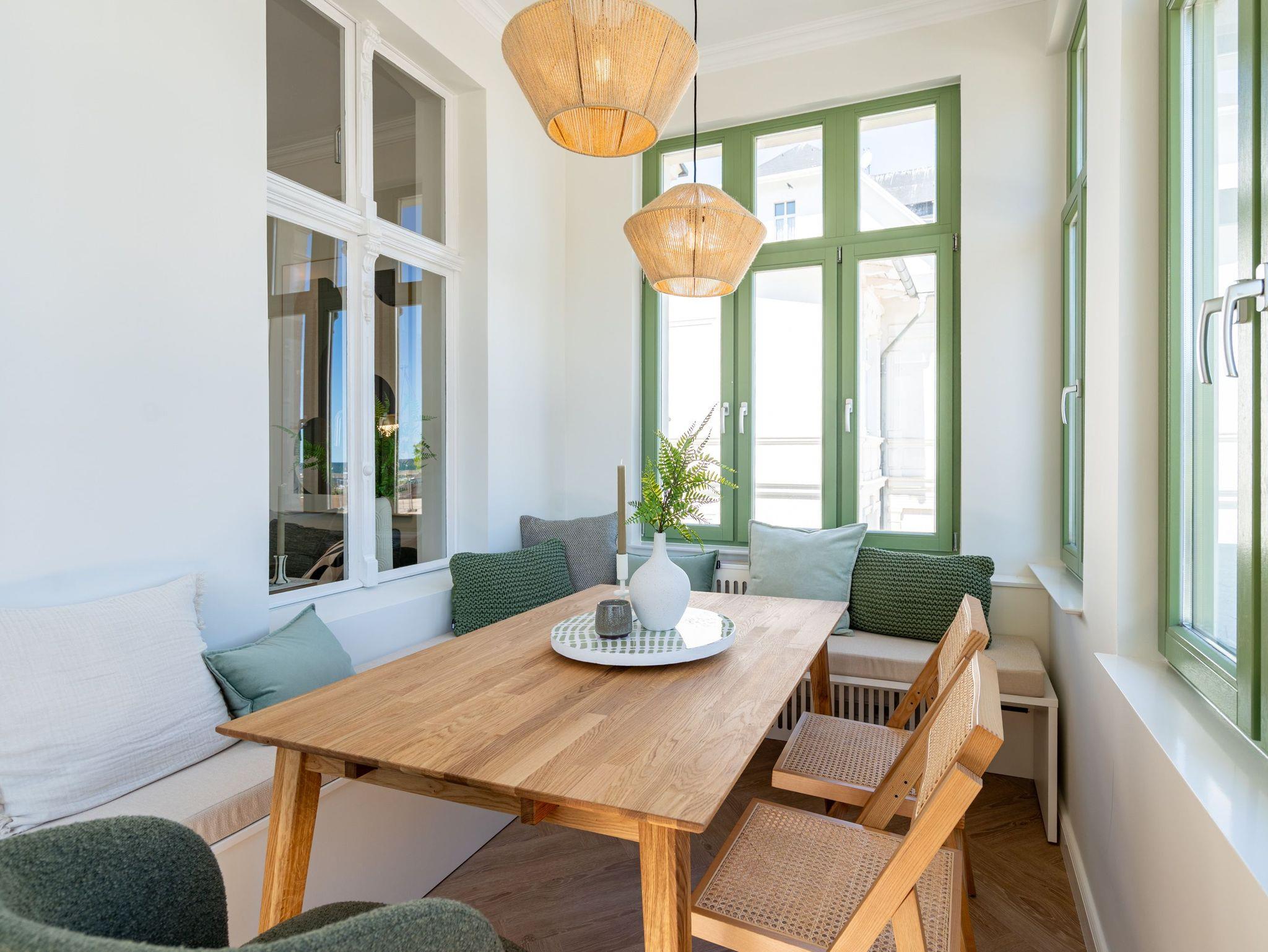 Das stilvolle 3-Raum-Appartement Nr. 13 in der Villa Frohsinn lädt mit großzügigen 70 qm Wohnfläche in der 2. Etage zum Entspannen und Genießen ein. Ideal geeignet für 4 Personen, bietet diese liebevoll eingerichtete Wohnung modernen Komfort und maritimen Charme. Der offene Wohnbereich empfängt Sie mit einer gemütlichen Sitzgruppe. Ein Flat-TV und ein stimmungsvoller Elektro-Kamin mit Fernbedienung sorgen auch an kühleren Abenden für wohlige Atmosphäre. Direkt angrenzend befindet sich die voll ausgestattete Küche mit allem, was Sie für eine bequeme Selbstverpflegung benötigen ? darunter ein moderner Induktionsherd, ein Mikrowellen-Kombigerät, Spülmaschine und ein Kühlschrank mit Gefrierfach. Ein besonderes Highlight ist die charmante Veranda mit Meerblick, auf der ein Esstisch mit Ecksitzbank zu gemütlichen Mahlzeiten einlädt. Von hier gelangen Sie auf den Nord-Balkon, der mit einem Tisch, vier Stühlen und zwei Sonnenliegen den idealen Ort zum Entspannen unter freiem Himmel bietet. Für erholsamen Schlaf sorgen zwei separate Schlafzimmer, jeweils ausgestattet mit komfortablen Boxspringdoppelbetten (1x 2,00 x 1,80 m / 1x 2,10 x 1,80 m), Kleiderschränken und eigenen Flat-TVs. In einem der Schlafzimmer findet zudem bei Bedarf ein Kinderreisebett (kostenpflichtig zubuchbar) Platz. Abgerundet wird das komfortable Wohnangebot durch zwei innenliegende Bäder, jeweils mit Dusche, WC und Waschtisch, sowie kostenfreiem WLAN und einem eigenen PKW-Außenstellplatz Nr. 13.