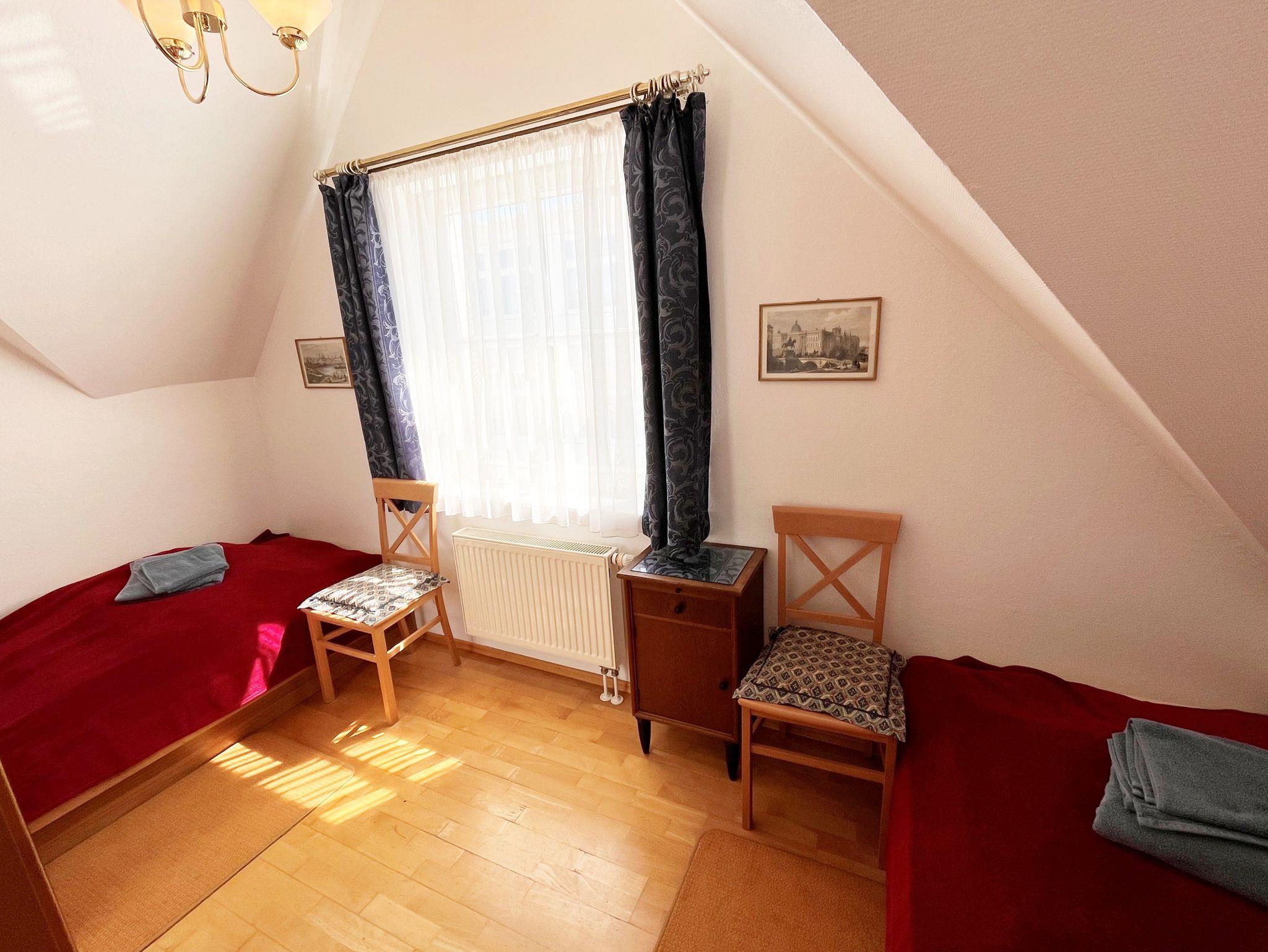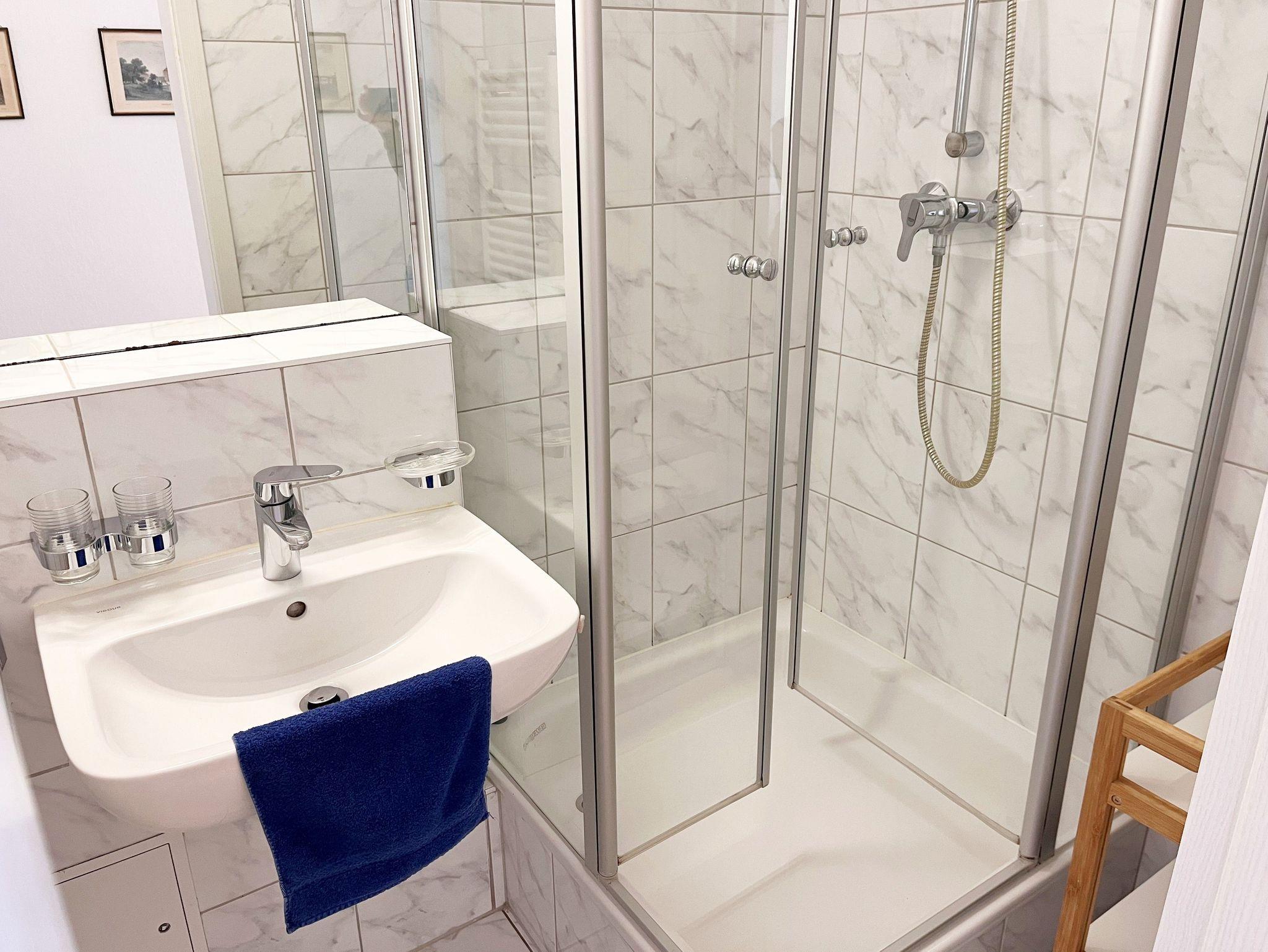 Die ca. 60 qm große Drei-Raum-Giebelwohnung im Obergeschoss des Hauses heißt Sie mit einem traumhaften, direkten Meerblick willkommen. Der helle, offene Wohn-, Ess- und Kochbereich lädt mit einer großzügigen Sitzecke, einem gemütlichen Essplatz sowie einer voll ausgestatteten Küchenzeile zum Wohlfühlen und Verweilen ein. Zwei separate Schlafzimmer sorgen für erholsamen Schlaf: eines mit einem komfortablen Doppelbett, das zweite mit zwei Einzelbetten - ideal für Familien oder Freunde. Ein Bad mit Dusche sowie ein separates WC bieten zusätzlichen Komfort. Vom Wohnzimmer aus betreten Sie den Balkon und genießen hier den unvergleichlichen Blick auf das Meer - der perfekte Ort für entspannte Stunden und unvergessliche Urlaubsmomente.