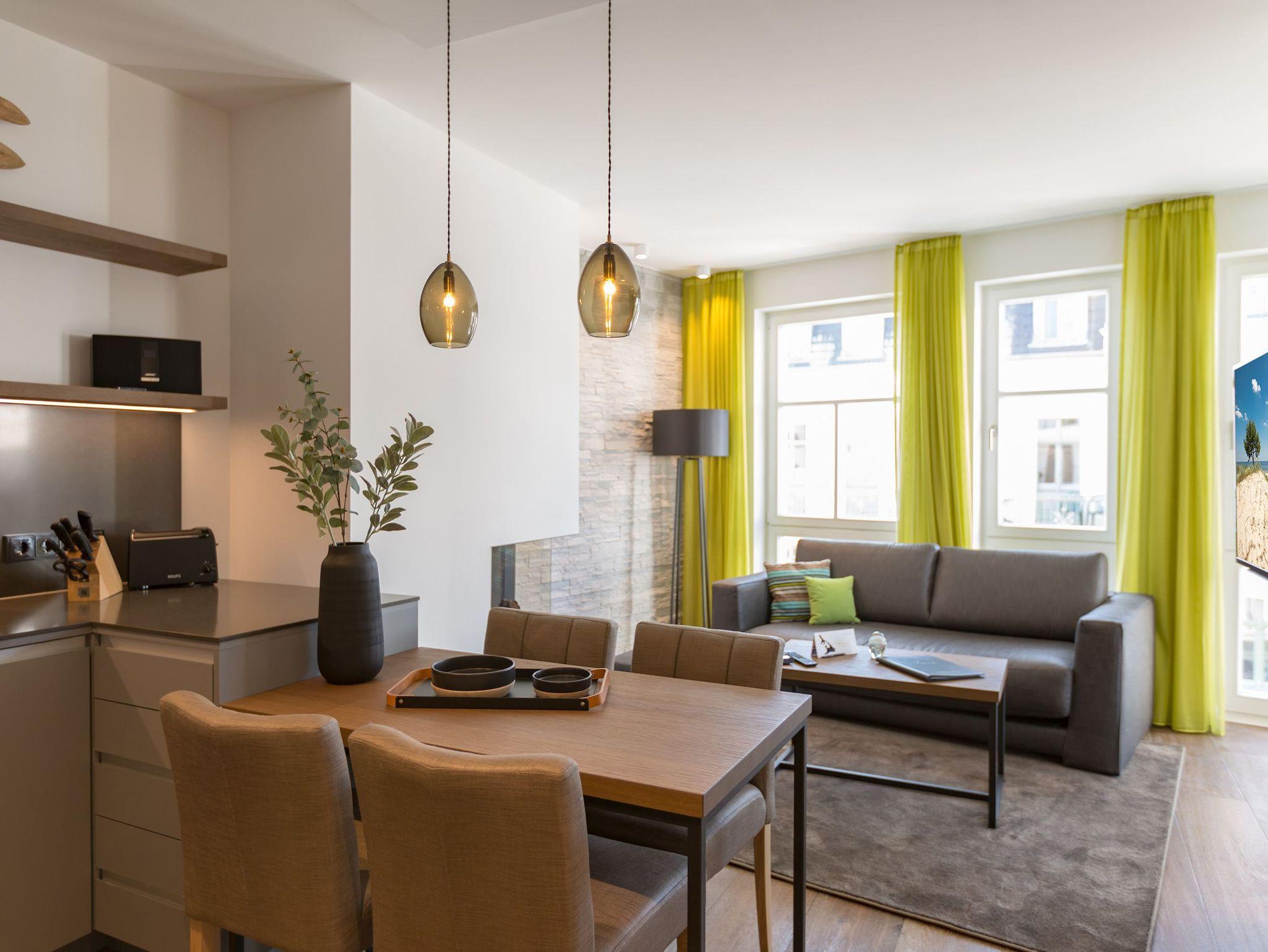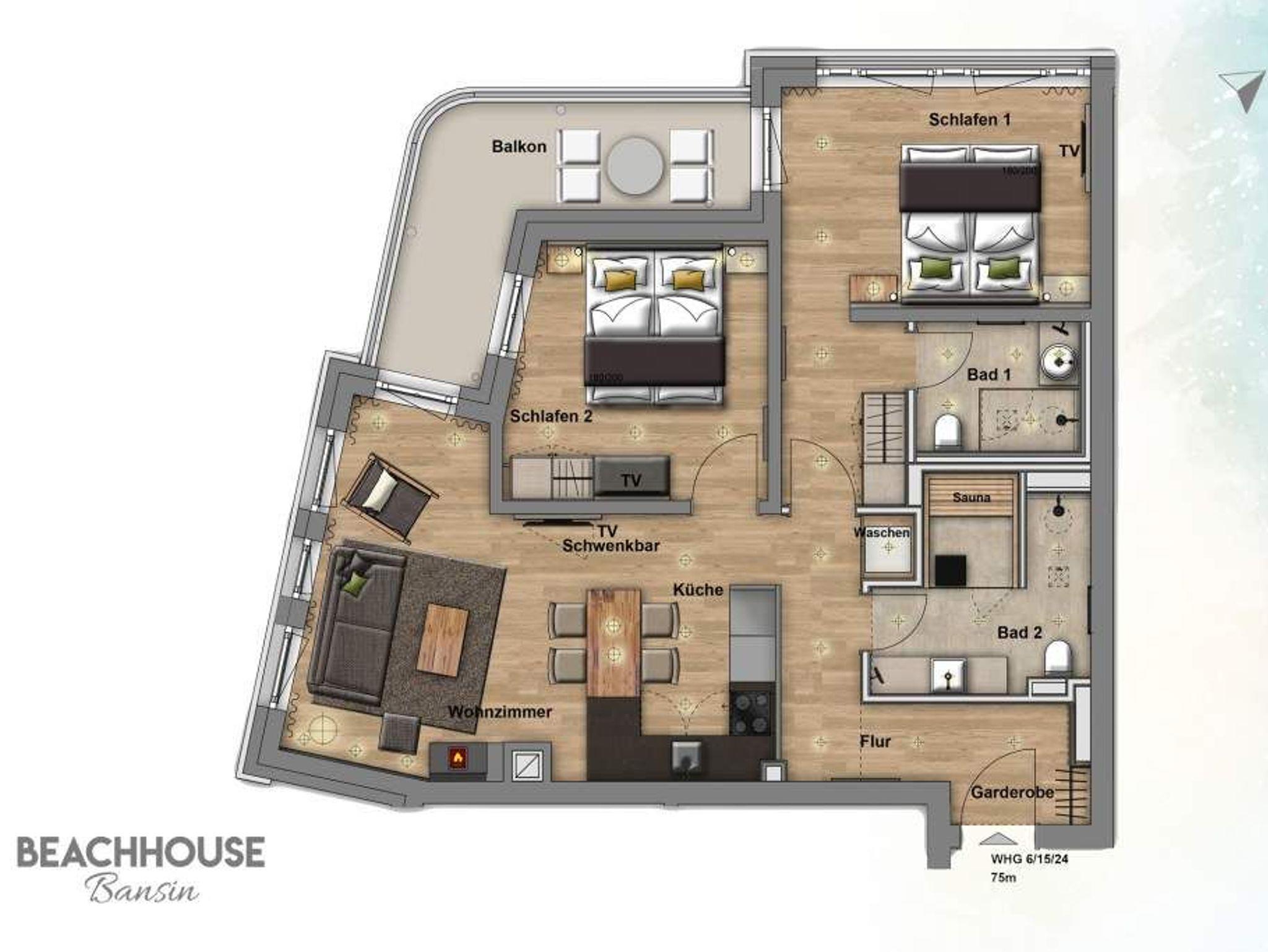 Ein Urlaubsdomizil zum wahrhaften Ausspannen und Erholen ist das Appartement Nummer 15 im 2. Stock des Bansiner Beachhouses. Viel Eleganz und stylische Möbel empfangen die bis zu vier Ostseeliebhaber und ein Kleinkind (bis drei Jahre im Kinderreisebett) in den drei Zimmern auf 69 Quadratmetern. Auf dem umlaufenden Balkon (9 Quadratmeter groß) können Sie Ostseeluft schnuppern und bei einem kühlen Getränk das Farbenspiel des Sonnenuntergangs über den Dächern der alten Bädervillen genießen. Aus allen drei Zimmern haben Sie Zugang auf den Balkon. So können Sie schon morgens, frisch gestärkt, nach einer erholsamen Nacht in einem der beiden Boxspringdoppelbetten (1,80 m x 2,00 m) raus an die frische Luft treten. In den beiden Schlafzimmern finden Sie in den großen Schränken auch reichlich Platz zum Ablegen Ihrer Urlaubsgarderobe. Ebenfalls zur Ausstattung gehört in jedem Zimmer ein Flat-TV. Einen besonders großen finden Sie im wunderschönen und eleganten Wohn-Esszimmer. Neben einer Hi-Fi-Anlage mit Bluetooth ist er zuständig für spannendes und entspannendes Home-Entertainment. Das WLAN für Ihre Lieblingsmusik ist kostenfrei. Vom bequemen Sofa aus haben Sie aber auch freien Blick auf den Gas-Kamin, mit dem Sie es sich auf Knopfdruck gemütlich machen können. Die Designer-Liebe steckt bekanntlich im Detail. Und so werden Sie in diesem Appartement alles aufs Feinste und bis ins Kleinste aufeinander abgestimmt finden. Vom Accessoires über die Lampen oder die Wandgestaltung bis hin zu den Design-Möbeln ist das Konzept auf exklusiven Wohnkomfort zugeschnitten. Zum Wohn-Esszimmer hin öffnet sich die voll ausgestattete Küche. Markengeräte und Geschirr erleichtern das Kochen und Backen und machen das Essen am großen und schönen Esstisch zum vergnüglich kulinarischen Erlebnis. Doch zu einem entspannenden Urlaub gehört auch die körperliche Wellness. In der Finnischen Sauna im Masterbad können Sie Stressgedanken schnell vergessen. An kühlen und tristen Tagen ist sie eine echte Wohlfühl-Oase. Das Urlaubsdomizil ist gleich mit zwei Bädern ausgestattet. In beiden finden Sie eine ebenerdige Regendusche, einen Waschtisch und ein WC. In einem kleinen Hauswirtschaftsraum können Sie Ihre Wäsche im Wasch-Trockner reinigen. Für den Rund-um-soglos-Urlaub haben wir für Sie die Betten schon bezogen und Handtücher bereit gelegt. In der modernen Tiefgarage ist für Sie der Stellplatz Nr. 15 im Doppelparker unten (max. Höhe 1,85 m, max. Länge 5,10 m, max. Breite 2,50 m, max. Last 2.600 kg) reserviert.
