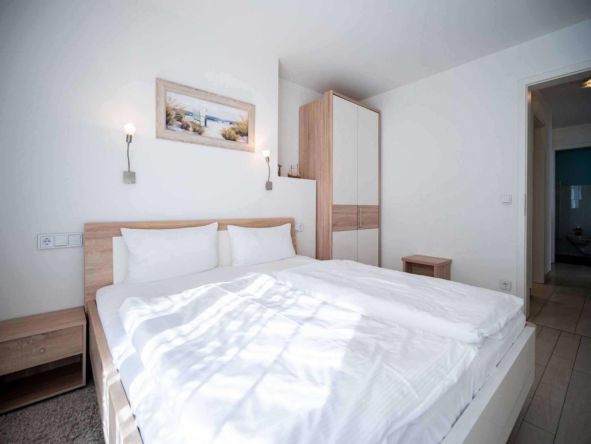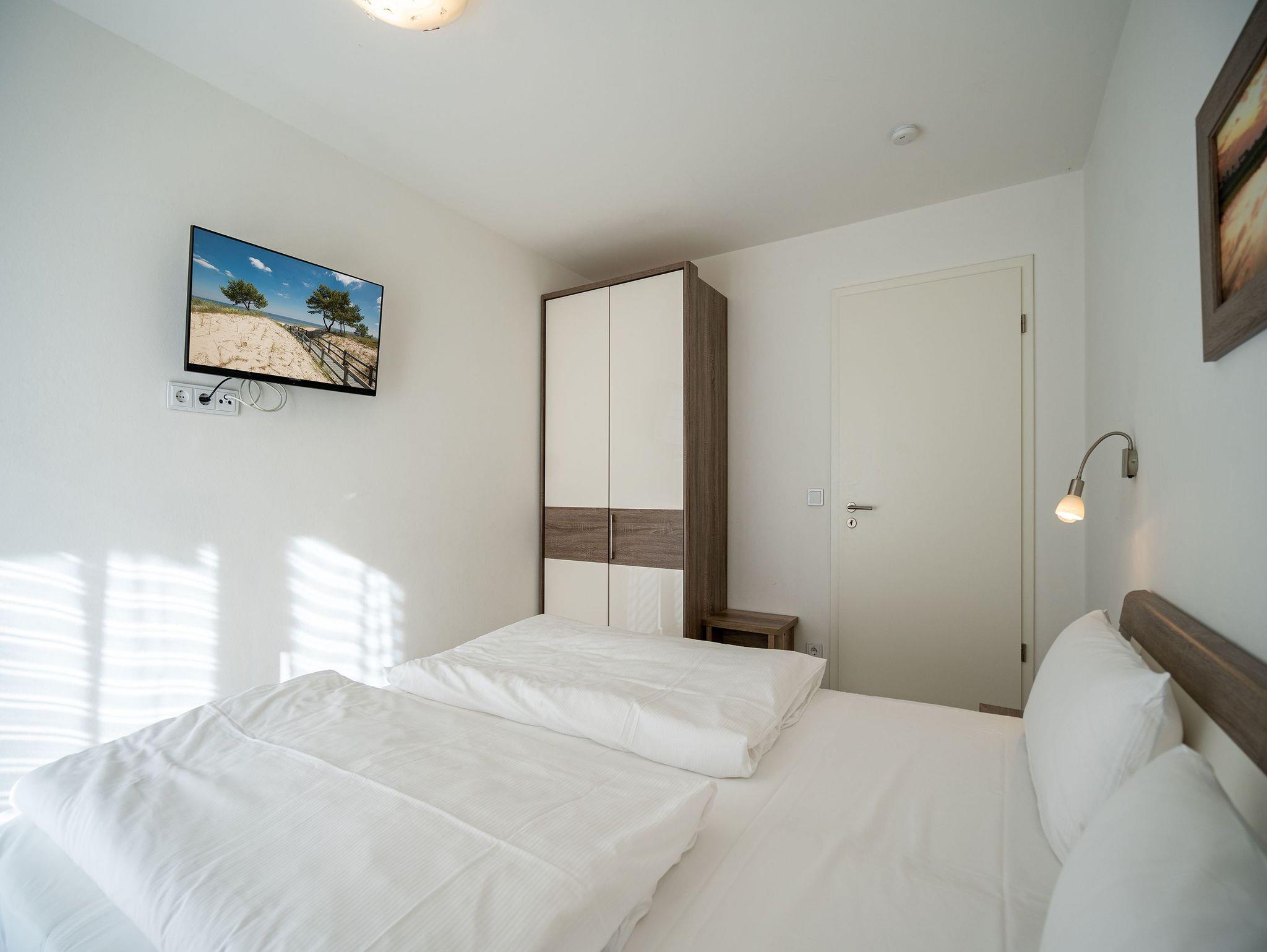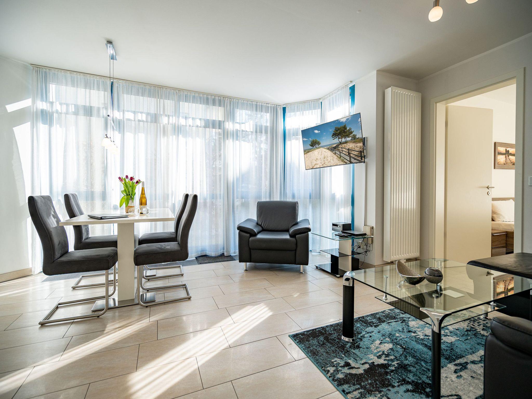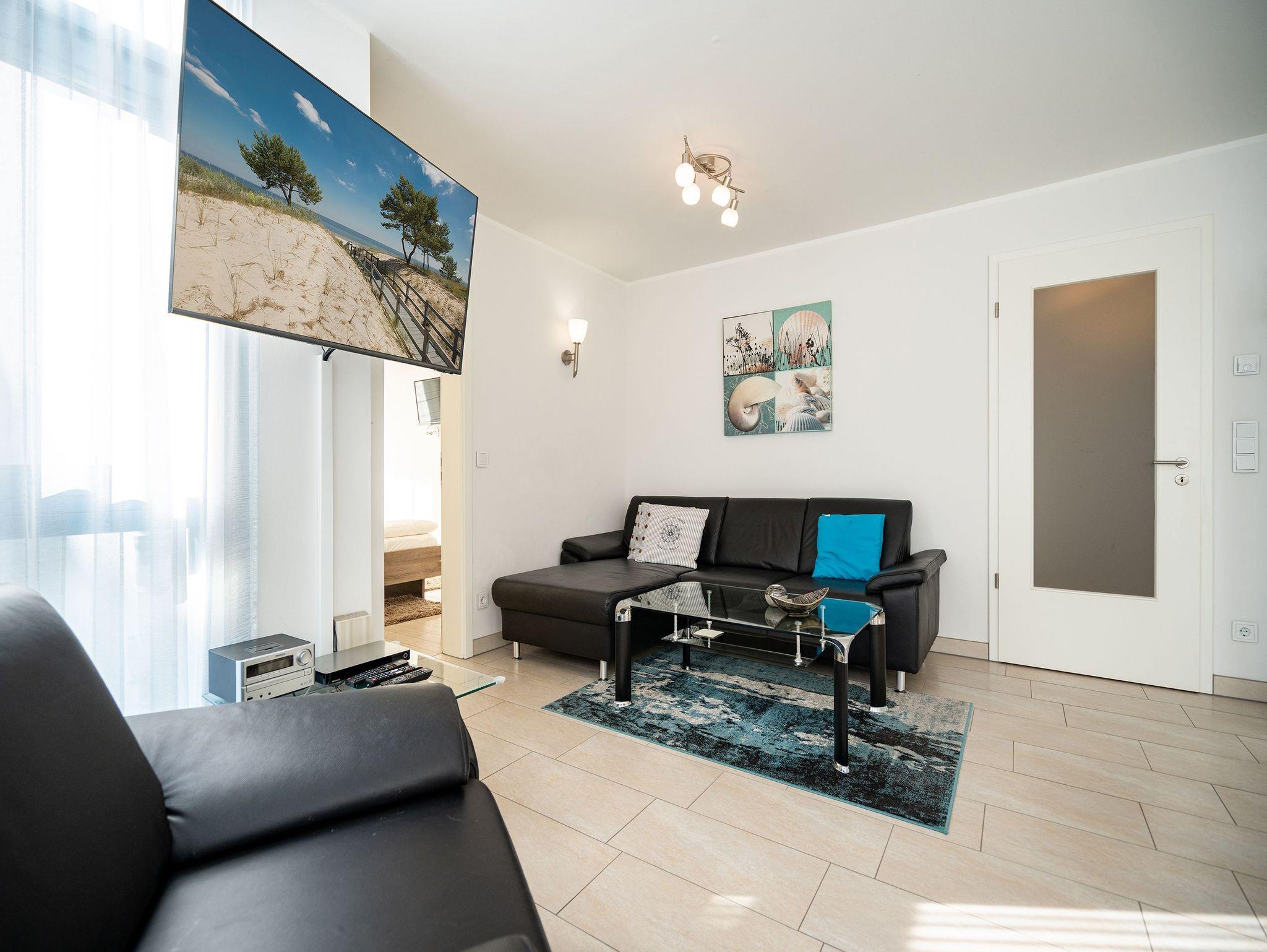 Willkommen in dieser geschmackvoll eingerichteten 3-Raum-Ferienwohnung im Erdgeschoss des Hauses Baltic. Die moderne Möblierung, die harmonisch aufeinander abgestimmten Farben und die liebevoll ausgewählten Dekorationen schaffen ein einladendes Ambiente auf 68 Quadratmetern. Mit zwei Schlafzimmern, die jeweils mit komfortablen Doppelbetten ausgestattet sind und eines davon zusätzlich über einen Smart-TV verfügt, ist diese Wohnung ideal für bis zu vier Personen. Der gemütliche Wohnbereich mit einer bequemen Ledersitzgruppe lädt zum Entspannen ein und grenzt an die offene, komplett ausgestattete Küche mit Essplatz. Ein weiterer Smart-TV sowie ein Blu-Ray-Player mit iPod-Dockingstation bieten Unterhaltungsmöglichkeiten für gemütliche Abende. Das moderne Bad mit Echtglasdusche sorgt für ein angenehmes Frischegefühl, und ein zusätzliches Gäste-WC bietet zusätzlichen Komfort. Wenn Sie keine Lust auf den Strand haben, können Sie die Sonne auf einer der beiden großzügigen Terrassen genießen ? eine nach Süden und eine nach Osten ausgerichtet. Bequeme Gartenmöbel laden hier zum Verweilen ein. Für Ihren Komfort sind die Betten bei Ihrer Anreise bereits bezogen. Alle Räume mit Fenstern, also die beiden Schlafzimmer und das Wohnzimmer, sind mit elektronischen Außenrollläden ausgestattet. Ein eigener PKW-Stellplatz (Nr. 11) befindet sich direkt am Haus und das kostenfreie WLAN im gesamten Haus sorgt dafür, dass Sie immer online bleiben können. Zudem steht Ihnen eine Waschmaschine im Abstellraum zur Verfügung. Freuen Sie sich auf einen unbeschwerten und komfortablen Aufenthalt in unserer Ferienwohnung im Haus Baltic.