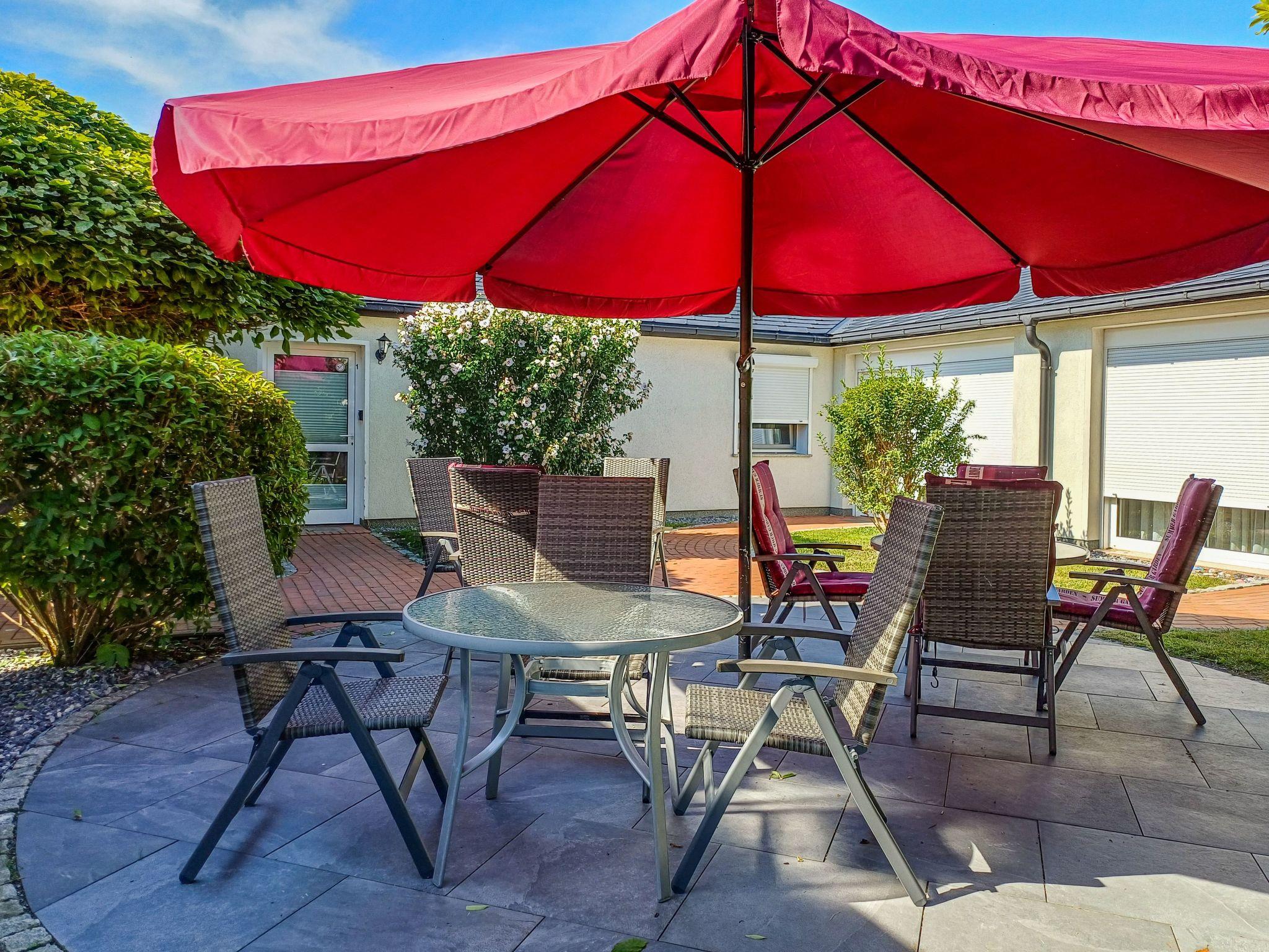 Im Außenbereich lädt eine ausgestattete Terrasse mit bequemen Gartenmöbeln und einem großen Sonnenschirm dazu ein, den Tag mit einem Frühstück in der Morgensonne zu beginnen oder die Abendstunden in Ruhe ausklingen zu lassen. Die Terrasse bietet den perfekten Rahmen für entspannte Momente unter freiem Himmel.