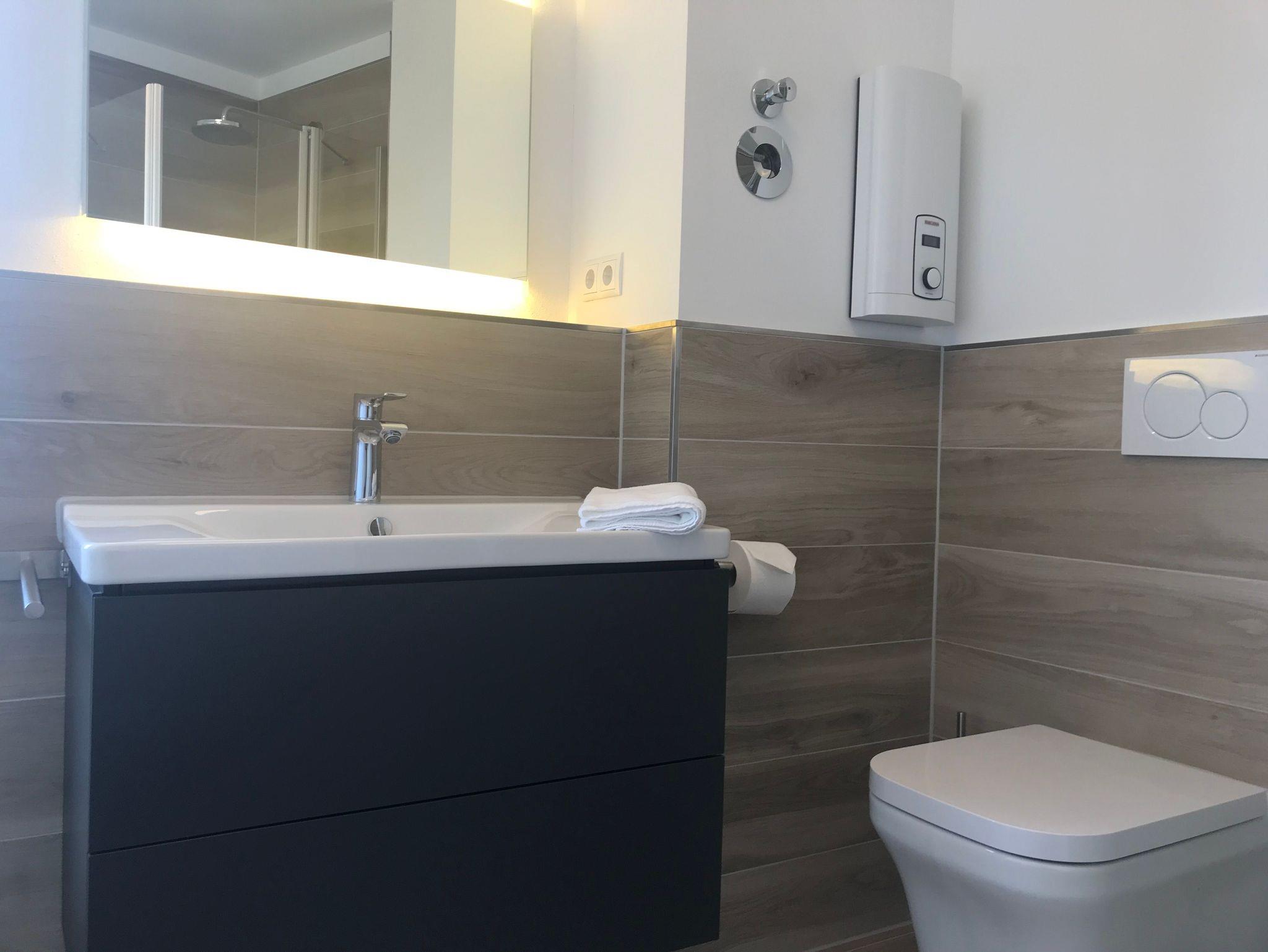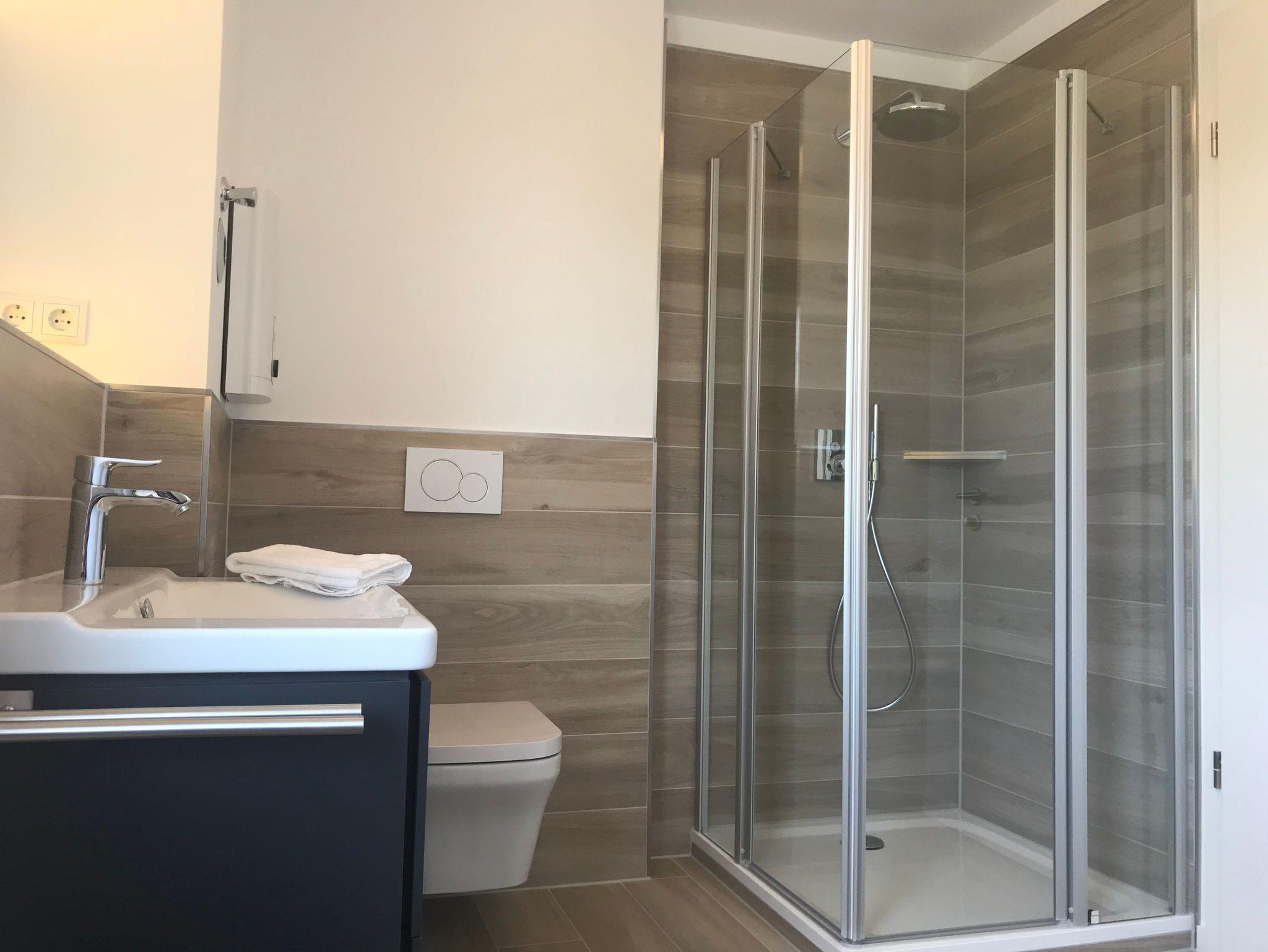 Bad mit ebenerdiger Dusche, Klimaanlage, kostenfreier überdachter Parkplatz