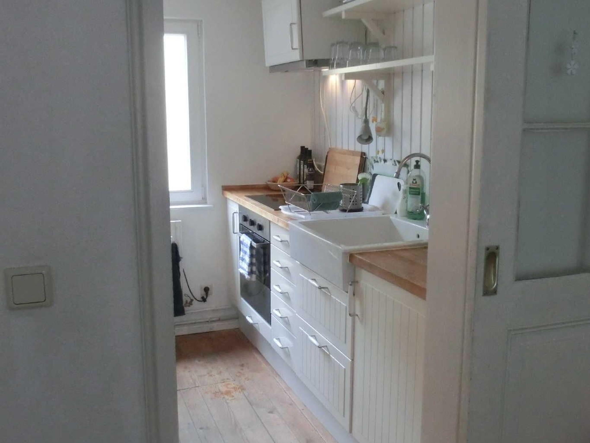 Komplett eingerichtete Küche mit großem ausklappbaren Esstisch, Spüle, Kühl,- und Gefrierkombination, Wasserkocher, Toaster, Kaffeemaschine, 4 Induktionskochfelder, Porzellan, Gläser, Besteck, Töpfe, Bügeleisen, Geschirr- und Küchentücher.