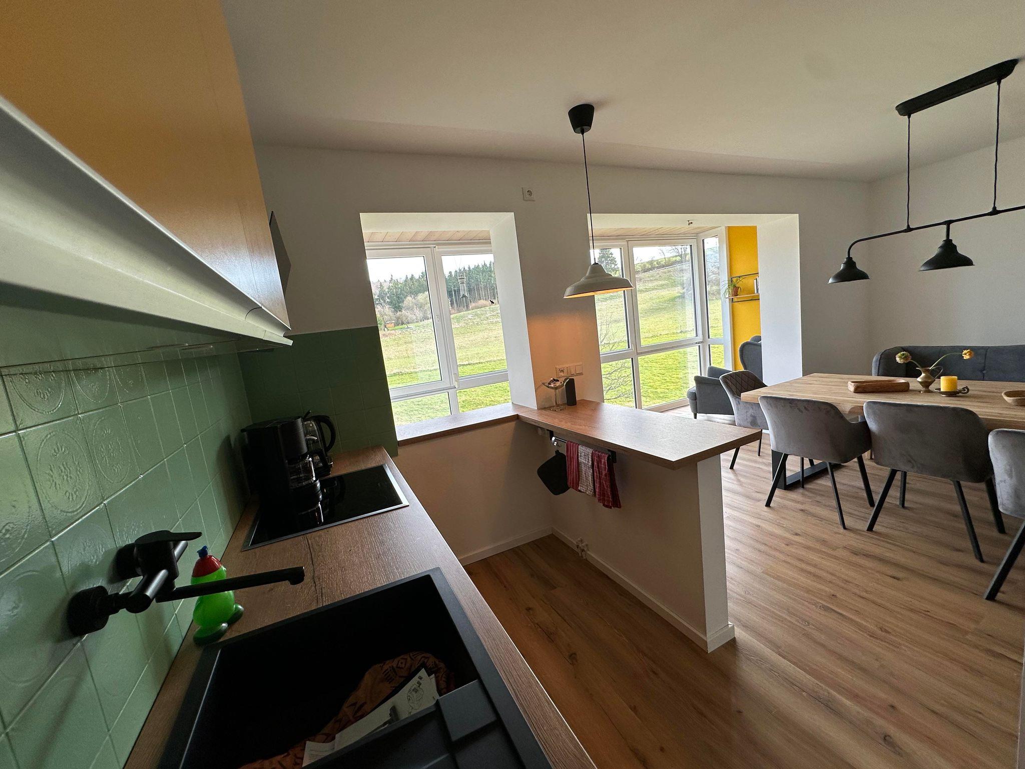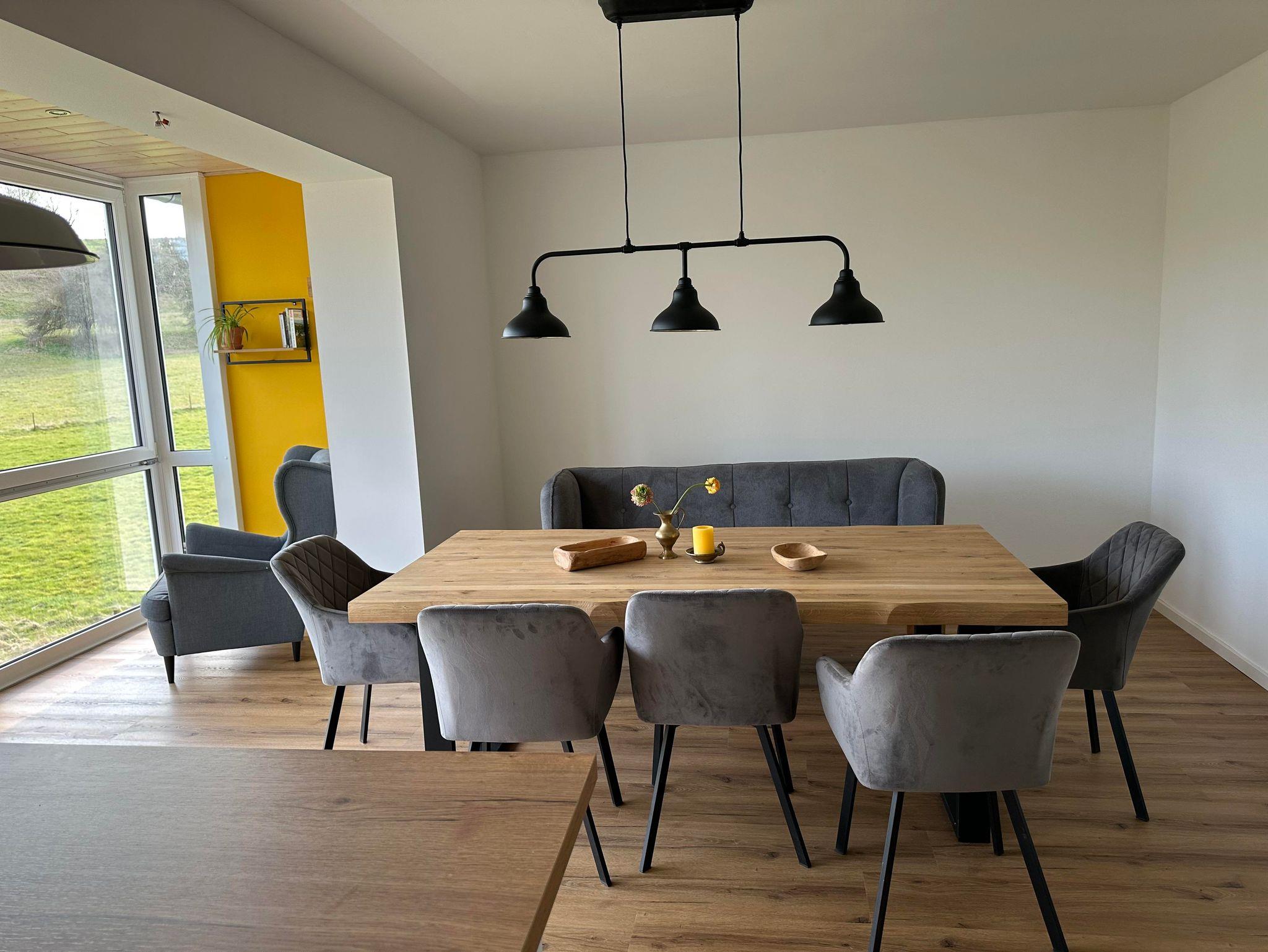 In der großzügigen Koch- und Wohnküche mit Wintergarten und großartigem Blick in die Landschaft, finden Sie einen großen Tisch mit min. 8 Sitzplätzen. Ein Hochstuhl von Stokke ist vorhanden.