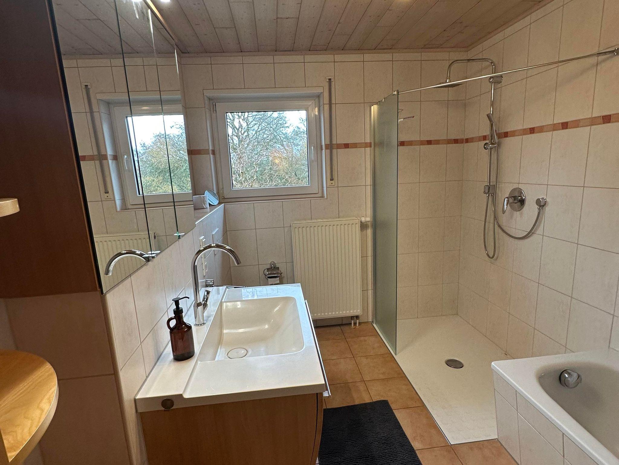Das barrierefreie Badezimmer verfügt über eine große Dusche, Badewanne, WC. Ein Föhn ist vorhanden.