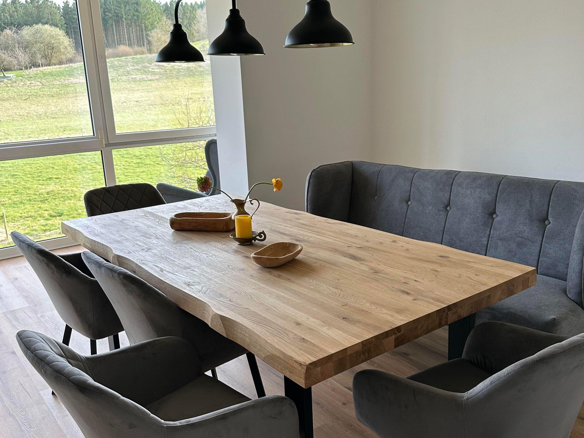 In der großzügigen vollausgestatteten Wohnküche mit Wintergarten, mit Blick in die Landschaft, befindet sich ein großer Esstisch mit 5 Stühlen, einer Sitzbank und einem TrippTrapp Hochstuhl.
