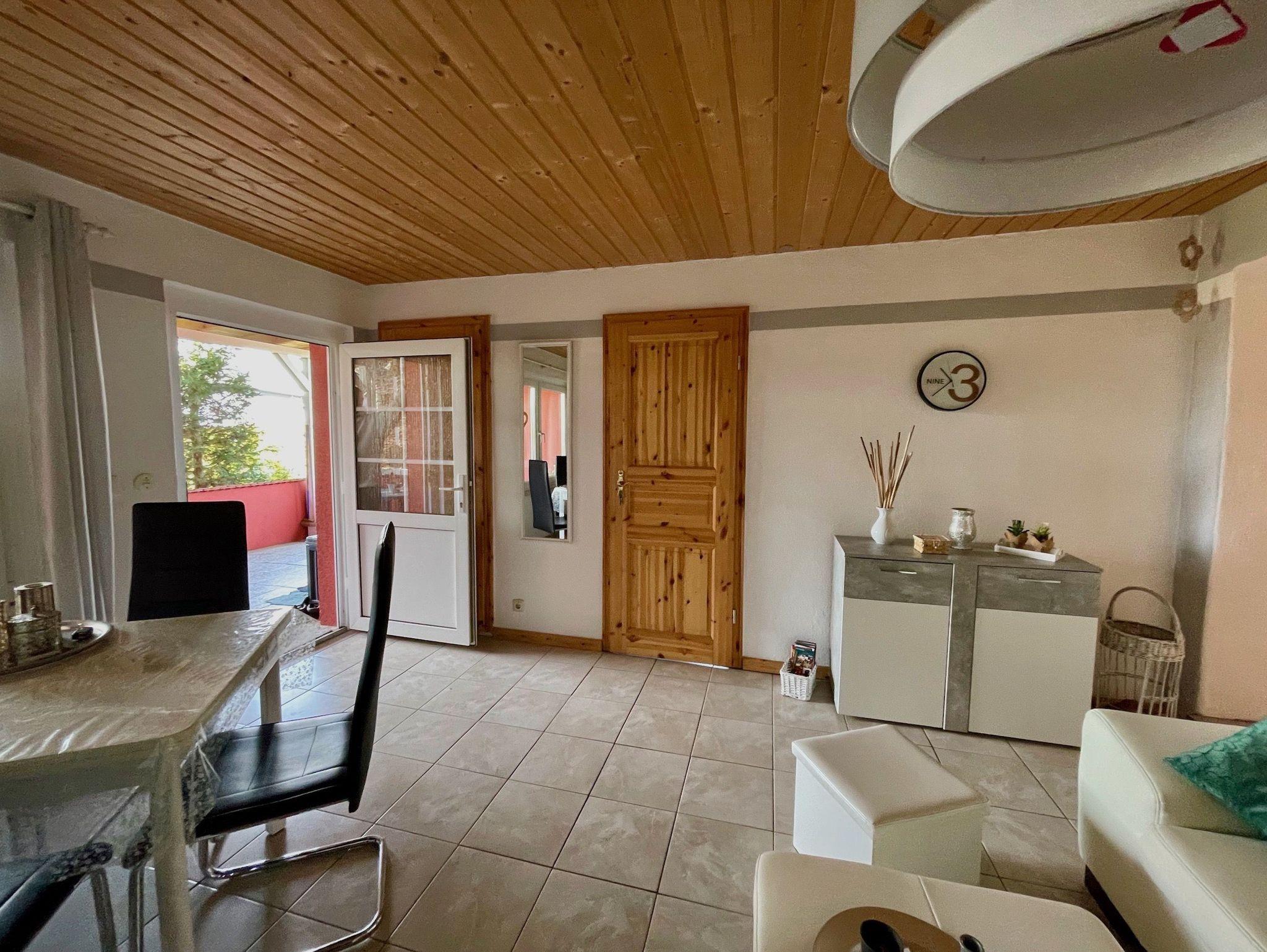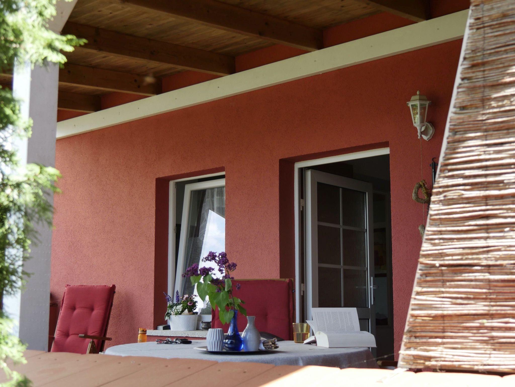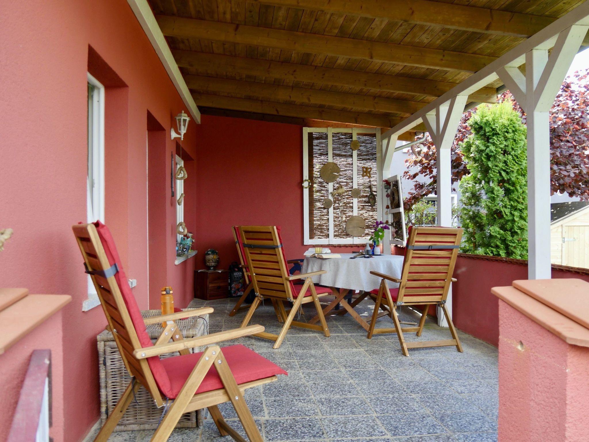 Die überdachte Terrasse mit der gemütlichen kleinen Sitzgruppe mit 4 Stühlen lädt zu einem entspannten Frühstück oder einem ruhigen Abend mit Blick Richtung See ein.