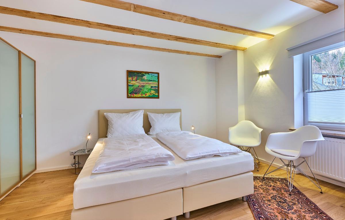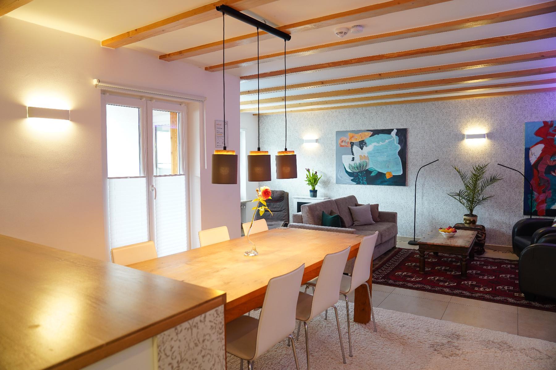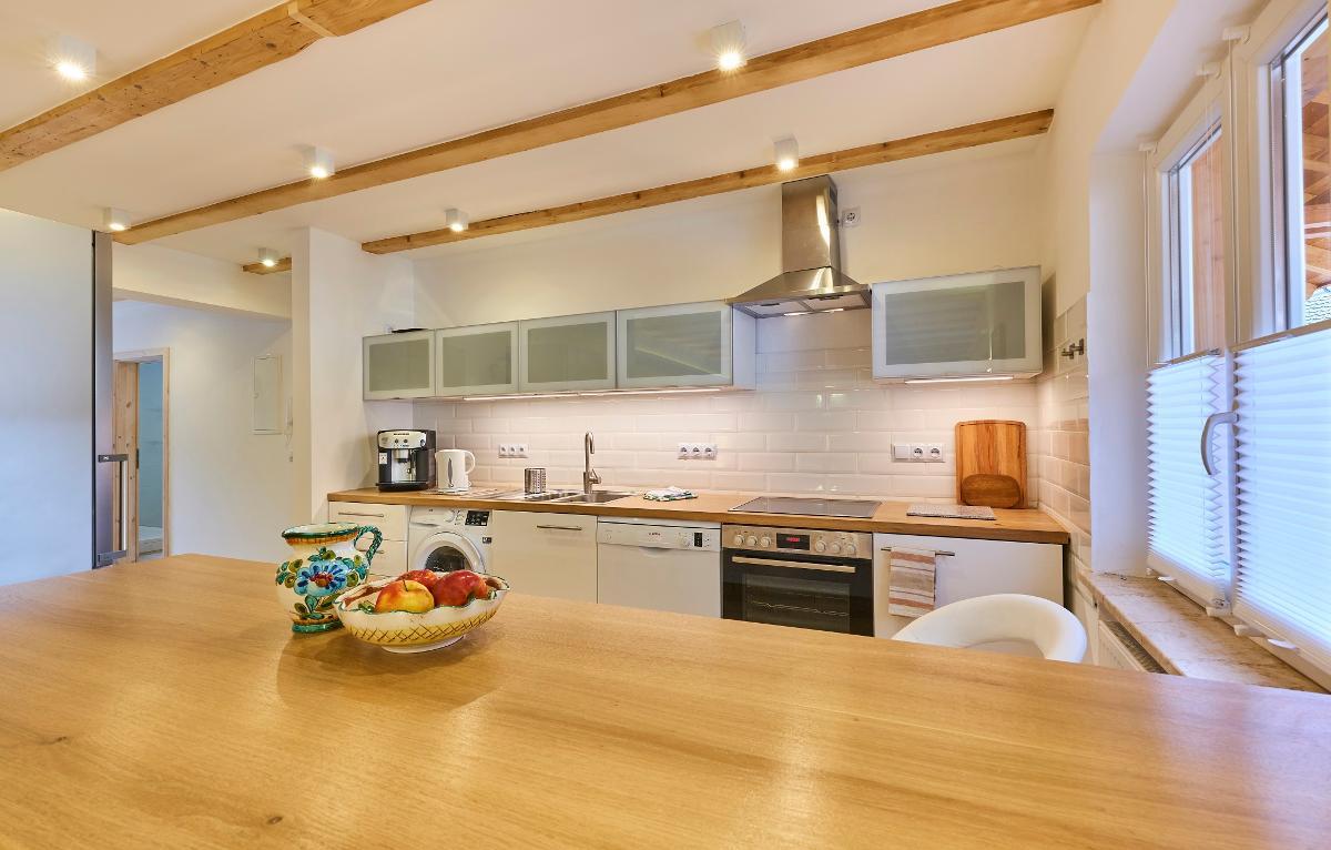 Eine weitgehend offen gestaltete Loft mit großem Wohn-Essbereich und Zugang zum Südbalkon. Zwei Schlafzimmer (mit Doppelbett und zwei Einzelbetten) liegen auf der Rückseite des Hauses zur kleinen Defernik hin gelegen, deren leichtes Rauschen zu hören ist. Das Bad verfügt über eine eigene Sauna. Die komplett eingerichtete Küche verfügt über einen Kühlschrank mit Gefrierfach, Wasch- und Spülmaschine und natürlich ein Kaffeevollautomat. Die Wohnung ist ausgestattet mit vier Boxspringbetten, die bei Bedarf auch zu zwei Doppelbetten umgestellt werden können.