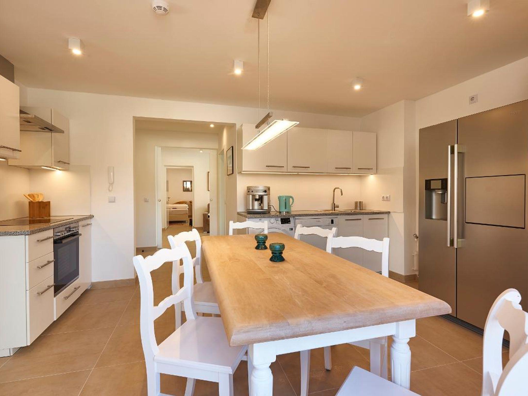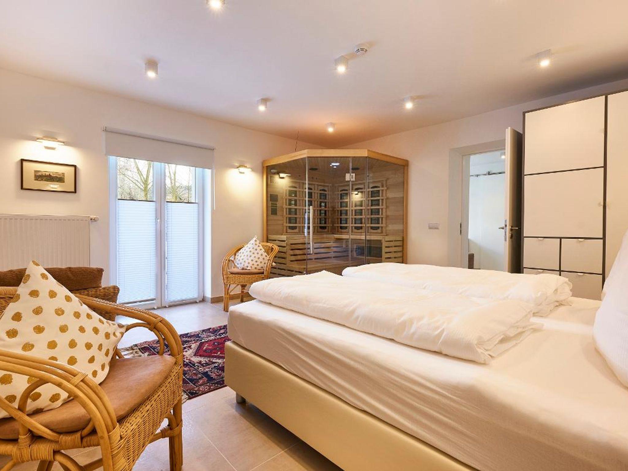 Egal, ob Sie sich als Paar eine Auszeit mit Wellness-Option gönnen oder mit Freunden Ihre Freizeit verbringen wollen, das flexible TERRASSEN LOFT bietet das richtige Ambiente. Das Wohnzimmer lädt mit TV, Elektrokamin und Schlafcouch zum Faulenzen ein. Die Wohnküche verfügt über amerikanischen Kühlschrank, Spül-, Wasch- und Kaffeevollautomaten und natürlich genügend Platz und Ausstattung, um kulinarisch zu Kochen. Das Schlafzimmer mit Infrarotkabine und Liegemöglichkeit spricht für sich. Das Durchgangszimmer mit Schlafcouch und TV können Sie je nach Bedarf zum Relaxen nach einem Wellnesserlebnis in der Infrarotkabine nutzen oder bietet eine Übernachtungsmöglichkeit für zwei Personen. Das chice Duschbad verfügt über Fußbodenheizung. Der amerikanische Kühlschrank sorgt für erfrischende Getränke, die Sie entweder auf der eigenen nach Osten hin ausgerichteten Terrasse von fast 40 Quadratmetern mit eigenem Grill oder auf einer Südterrasse genießen können. Von hier ist es nur ein Katzensprung zum Pool.