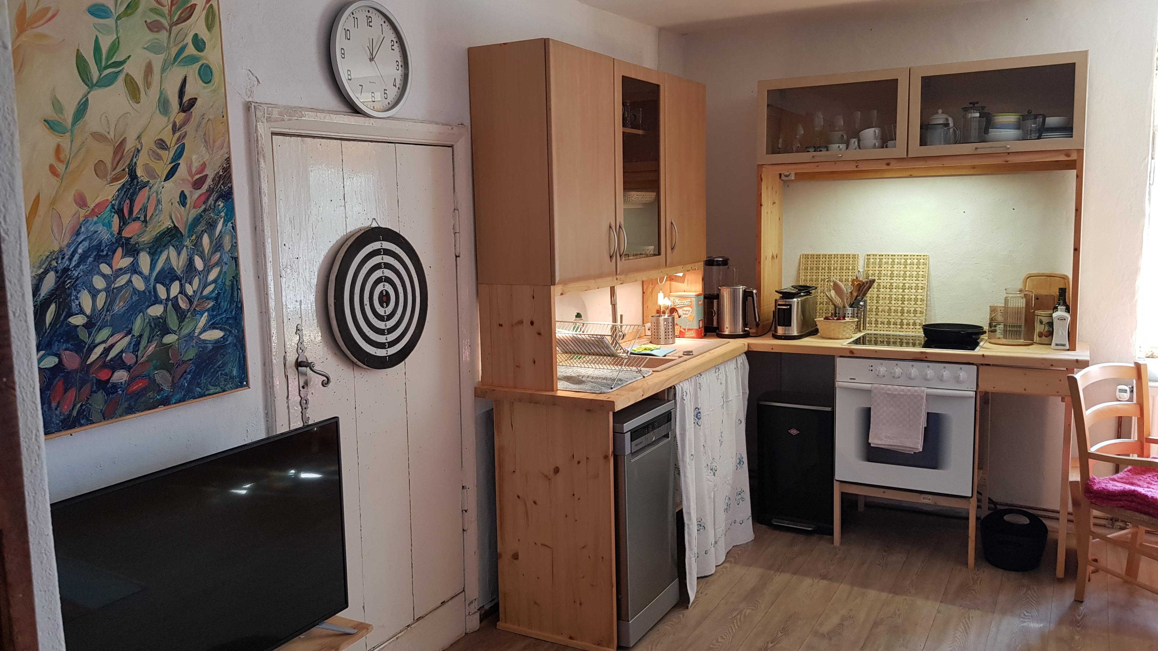 Die Wohnküche verfügt über eine Küchenzeile, einen Herd mit Ceranfeld, eine Spüle und einen Geschirrspüler, eine Kühl- & Gefrierkombination, einen Eßtisch, eine ausziehbare Couch und einen Sat.-Fernseher. Auf der Couch kann eine dritte Person (ein Kind) schlafen.