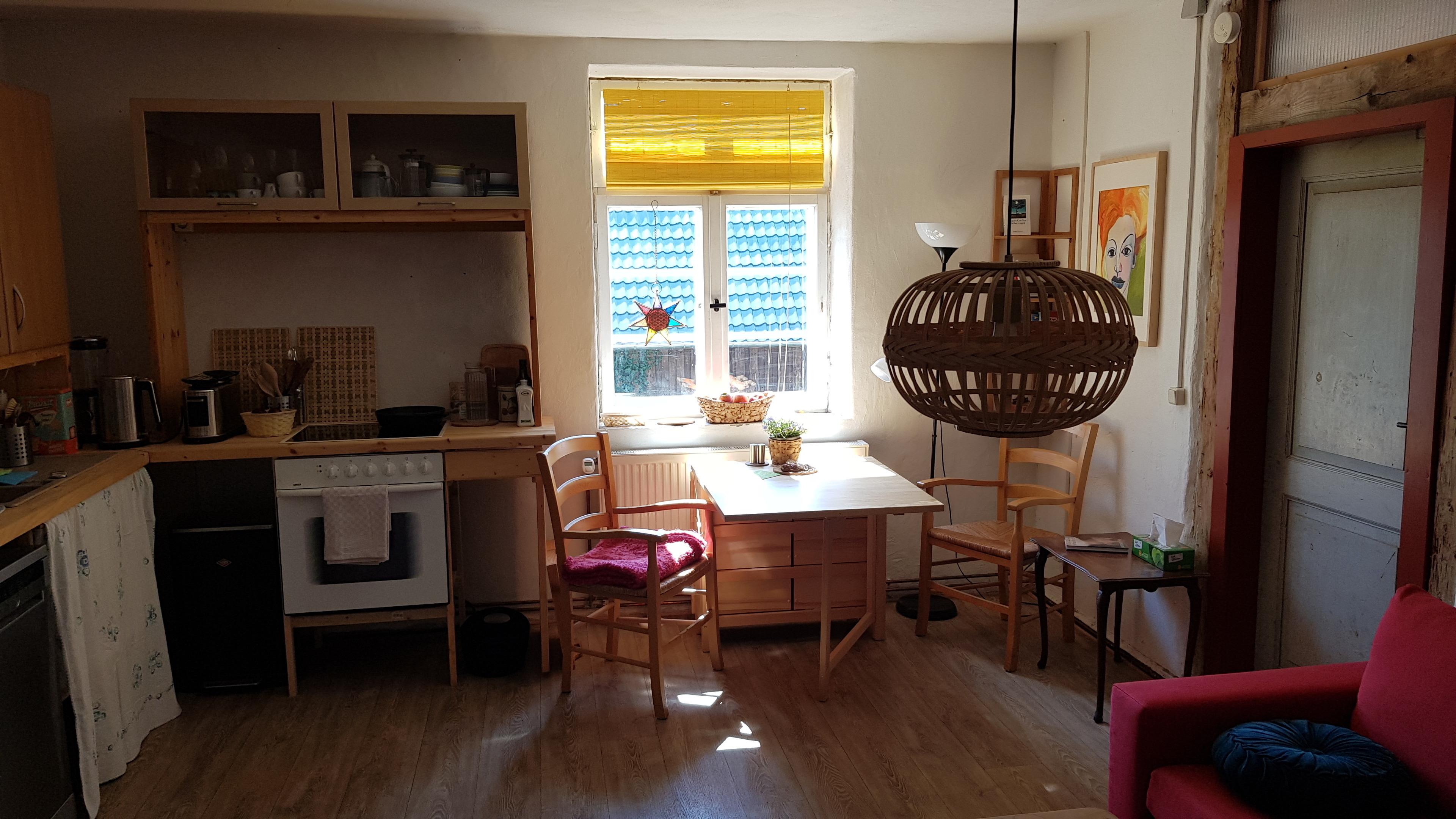 Zweiraumwohnung, 60 m² im 1. Stockwerk. Das Oberstübchen im Alten Pfarrhaus hat einen besonderen Charme mit alten Balken und Türen und bietet dennoch alle modernen Annehmlichkeiten. Das Haus ist umgeben von einem traumhaft großen Garten mit altem Baumbestand.