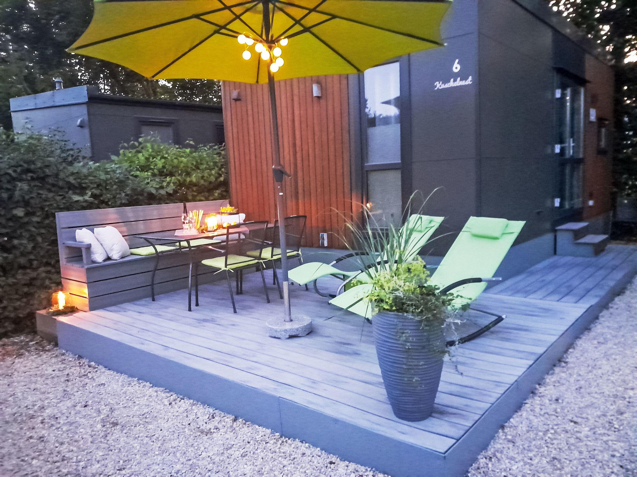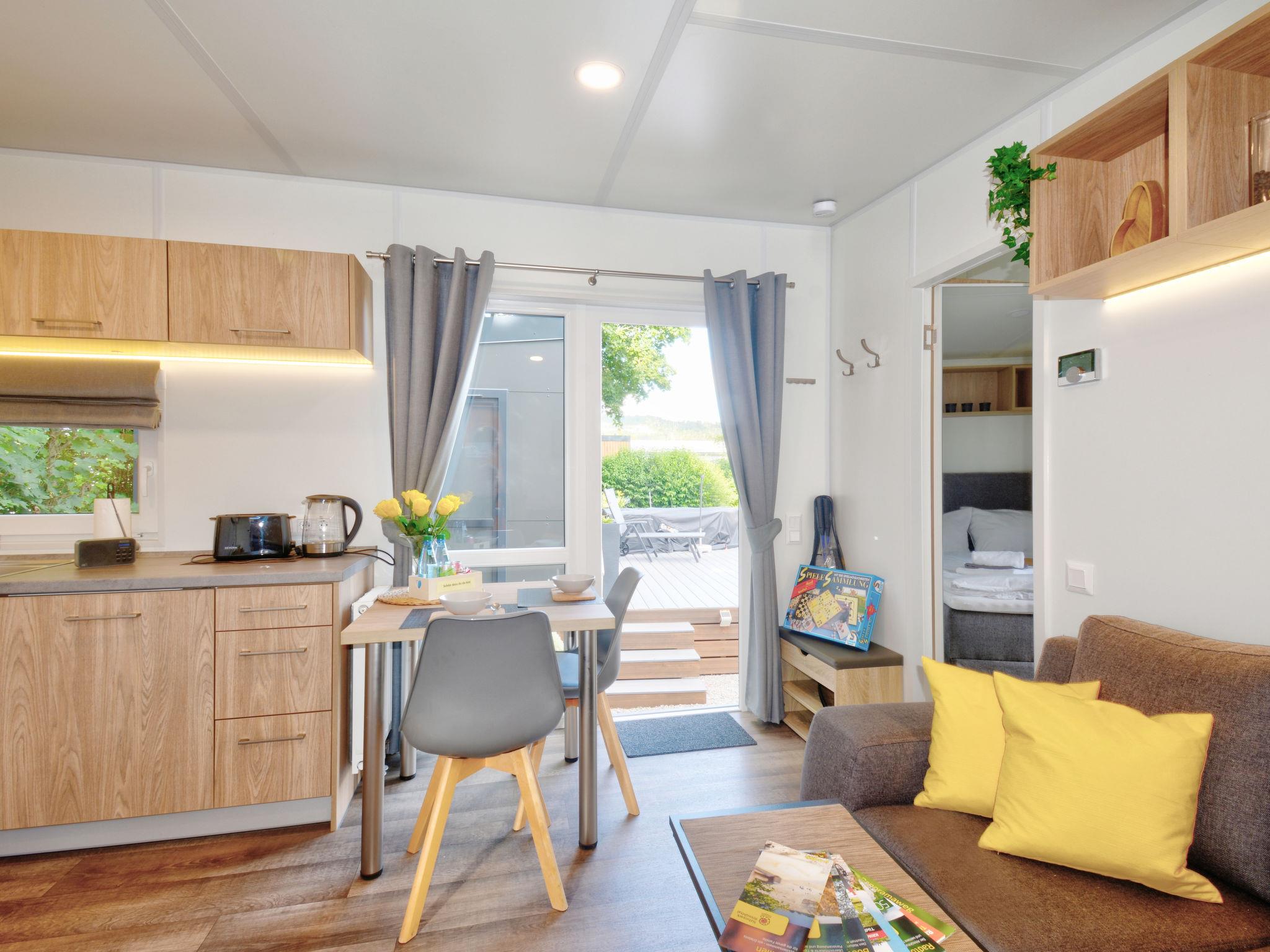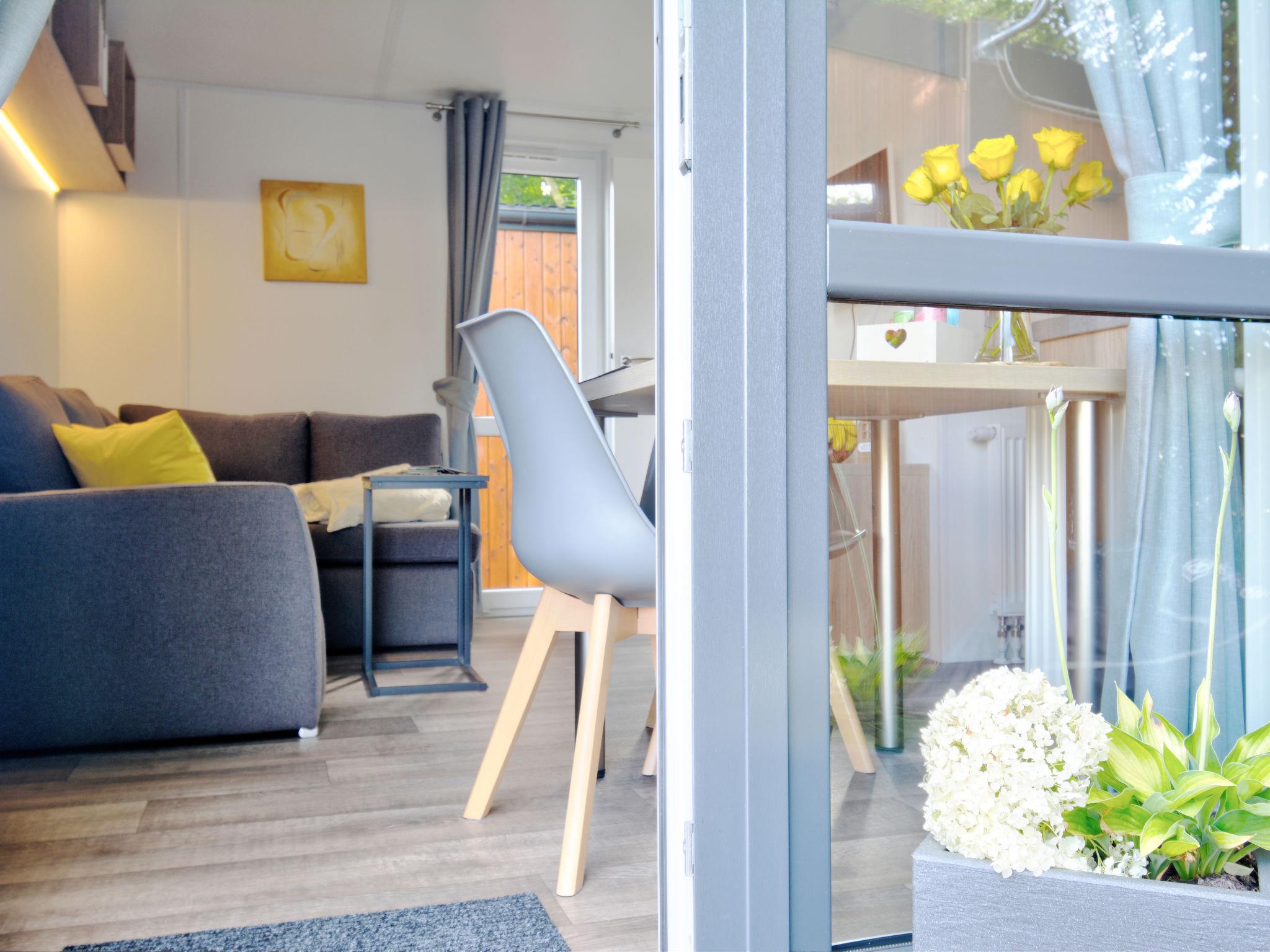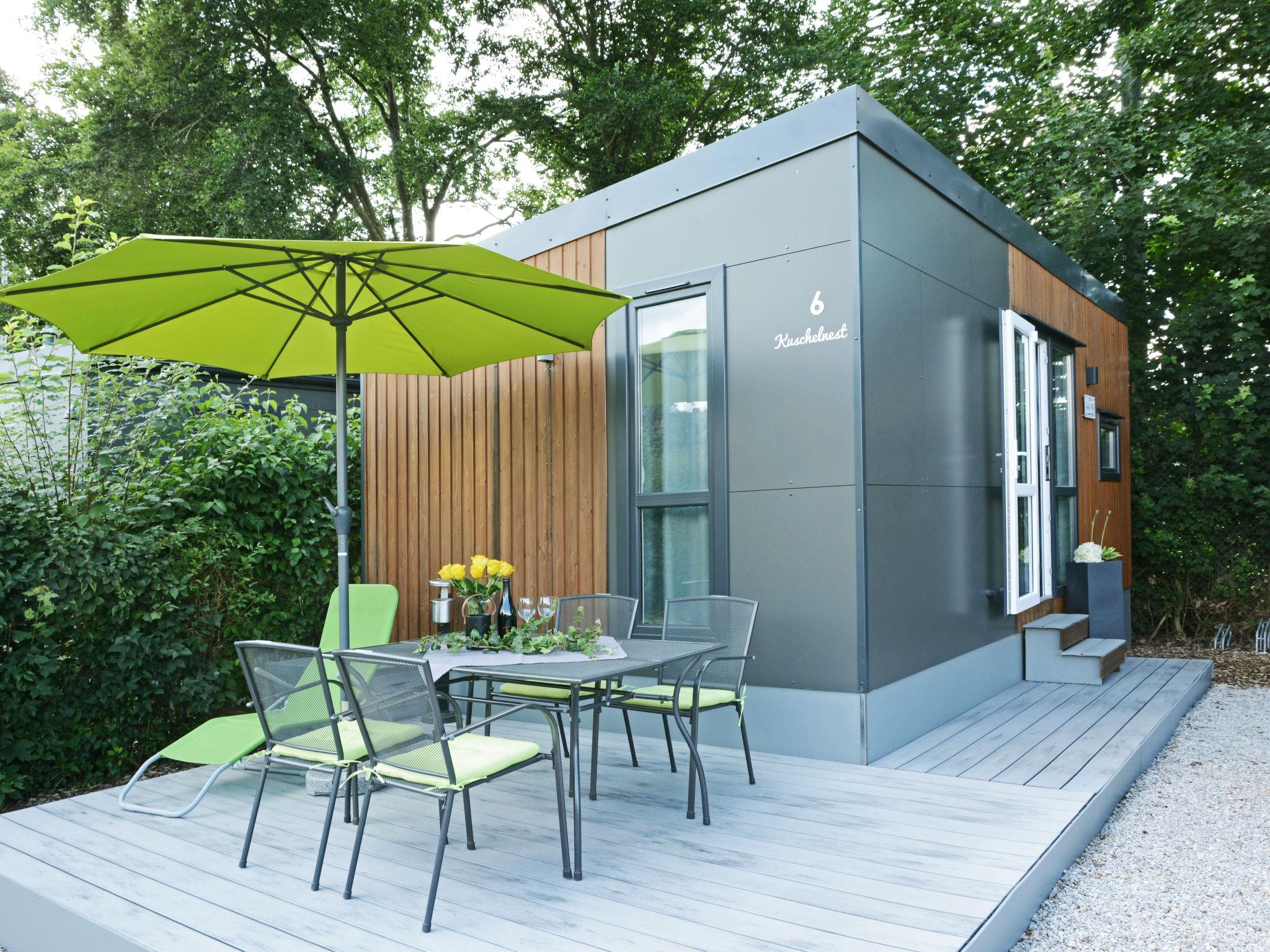 "Tiny Haus Kuschelnest", 2-Zimmer-Mobilheim 25 m2. Objekt geeignet für 2 Erwachsene + 2 Kinder. Gemütlich eingerichtet: Wohn-/Schlafzimmer mit 1 Diwanbett (120 cm, Länge 170 cm), Sat-TV. Ausgang zur Terrasse. 1 Zimmer mit 1 franz. Bett (140 cm, Länge 200 cm). Offene Küche (Backofen, Gasherd, 2 Flammen, Wasserkocher, elektrische Kaffeemaschine). Dusche/WC. G-Heizung. Terrasse. Terrassenmöbel. Parkplatz (1 Auto) beim Haus. Bitte beachten: Nichtraucher-Haus. Maximal 1 Haustier/Hund erlaubt.