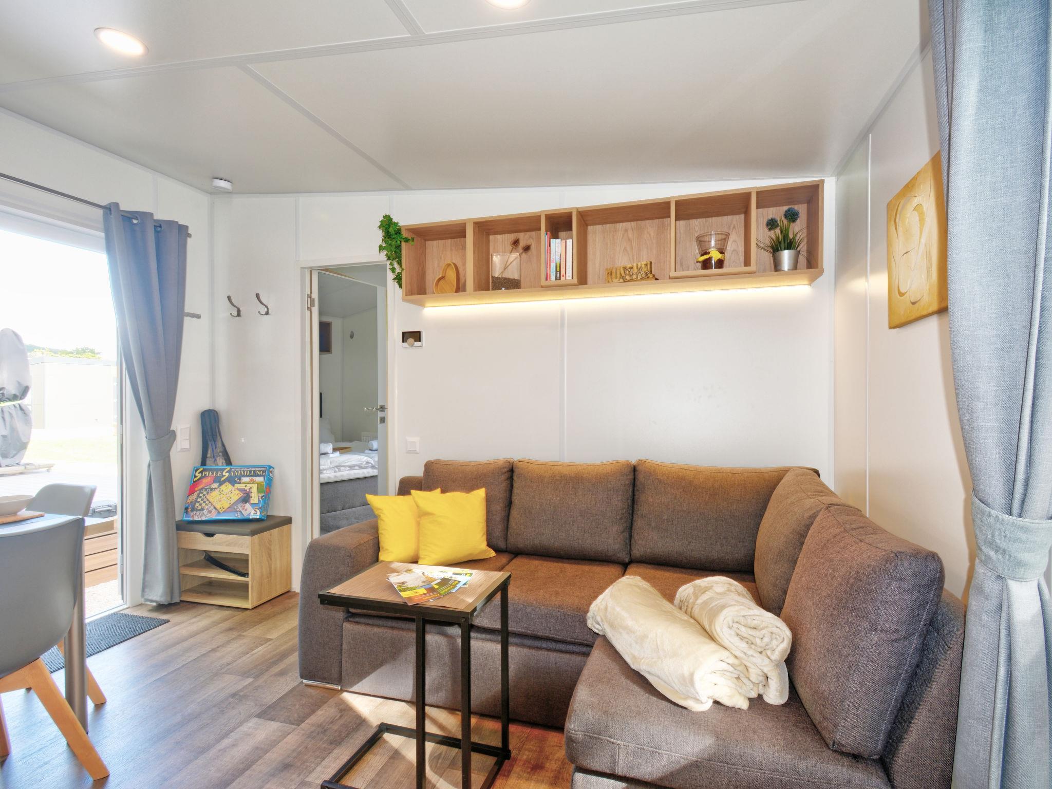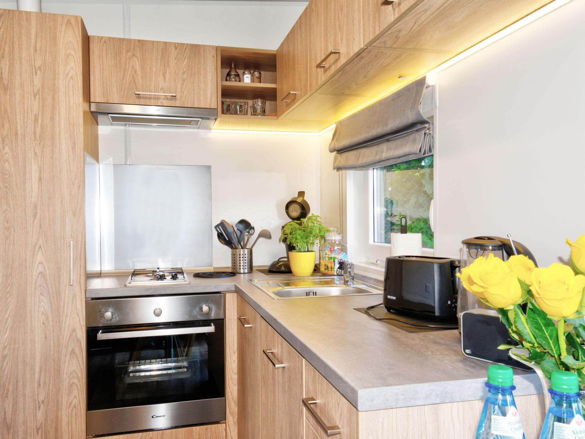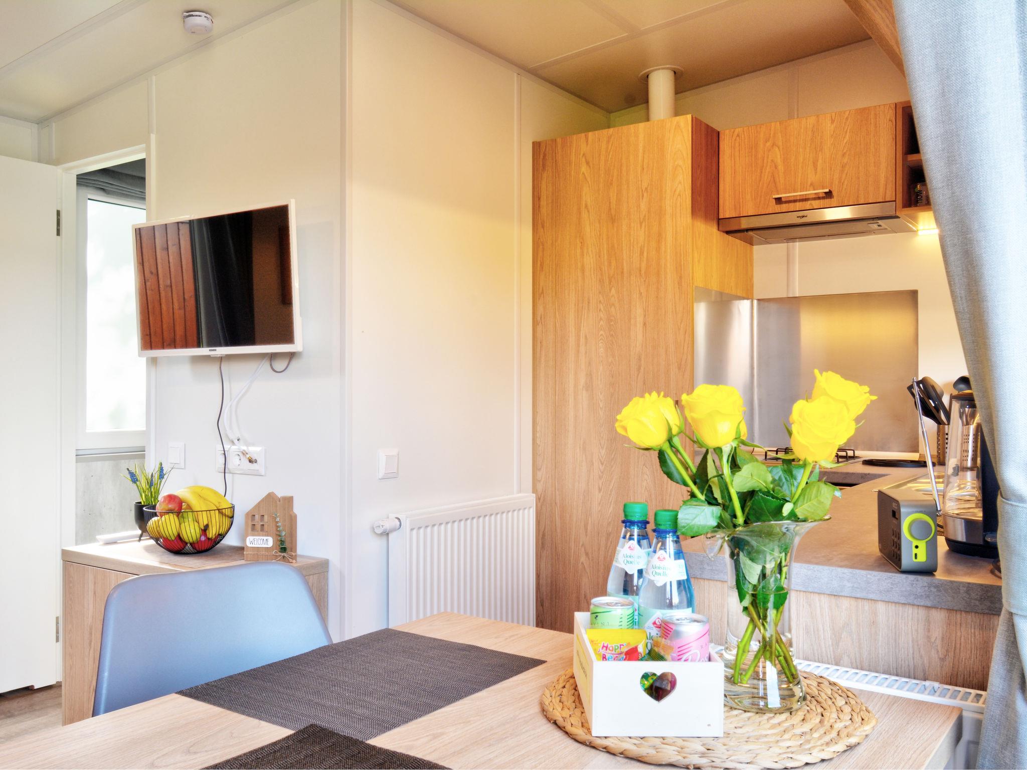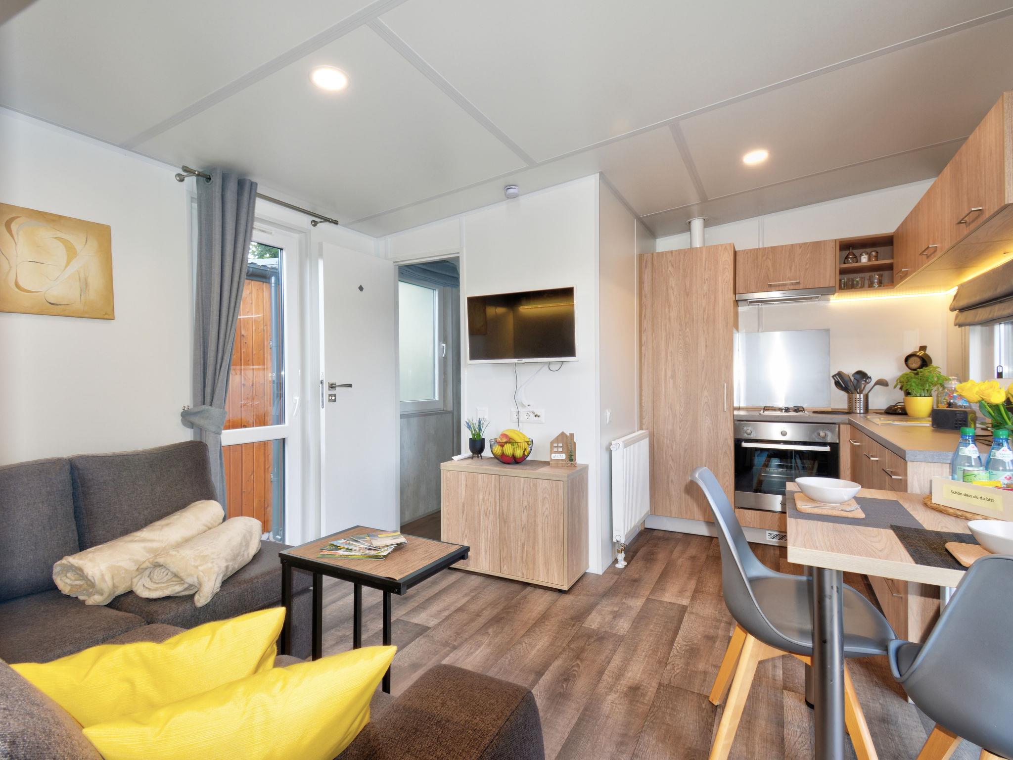 "Tiny Haus Kuschelnest", 2-Zimmer-Mobilheim 25 m2. Objekt geeignet für 2 Erwachsene + 2 Kinder. Gemütlich eingerichtet: Wohn-/Schlafzimmer mit 1 Diwanbett (120 cm, Länge 170 cm), Sat-TV. Ausgang zur Terrasse. 1 Zimmer mit 1 franz. Bett (140 cm, Länge 200 cm). Offene Küche (Backofen, Gasherd, 2 Flammen, Wasserkocher, elektrische Kaffeemaschine). Dusche/WC. G-Heizung. Terrasse. Terrassenmöbel. Parkplatz (1 Auto) beim Haus. Bitte beachten: Nichtraucher-Haus. Maximal 1 Haustier/Hund erlaubt.
