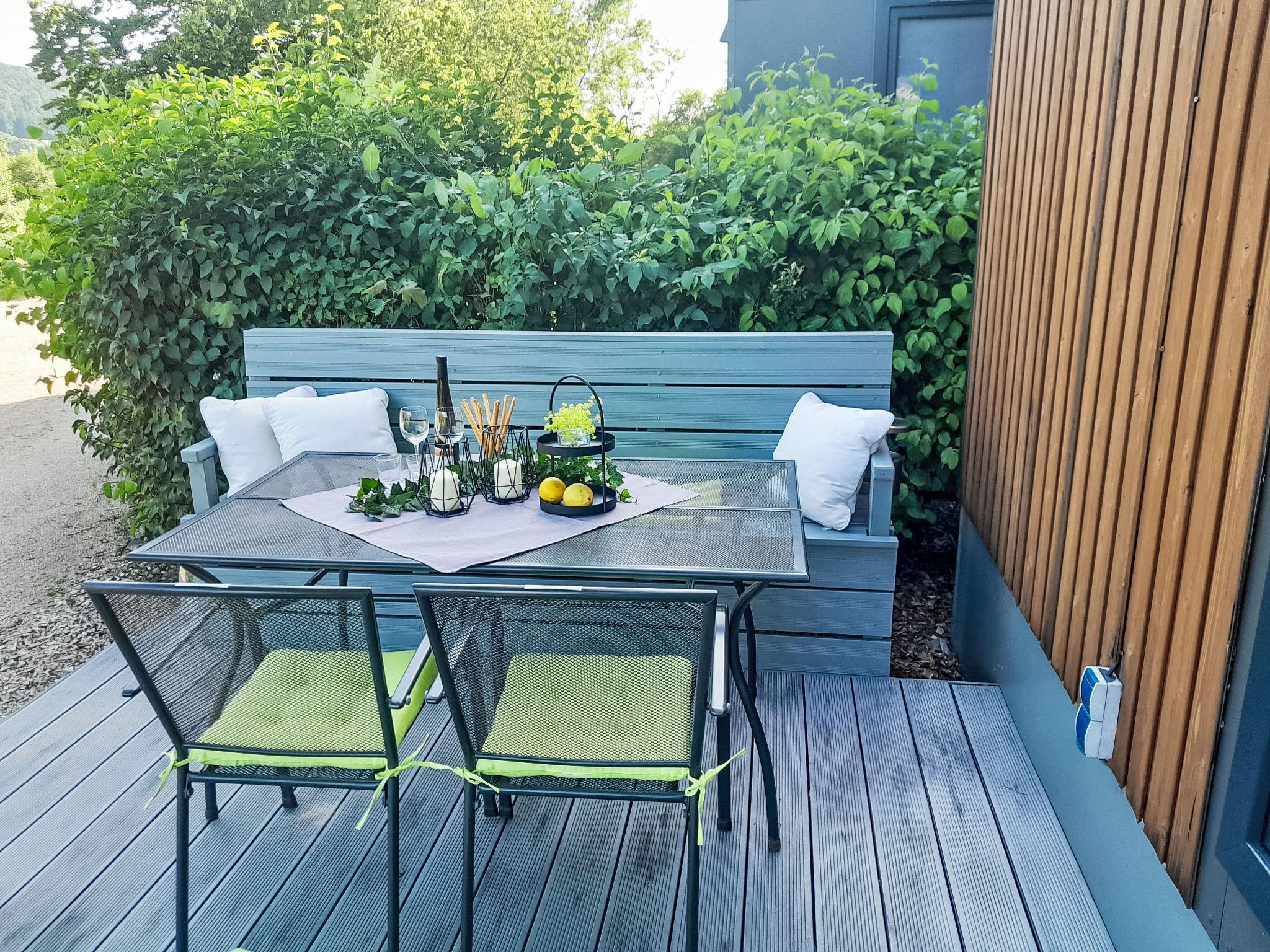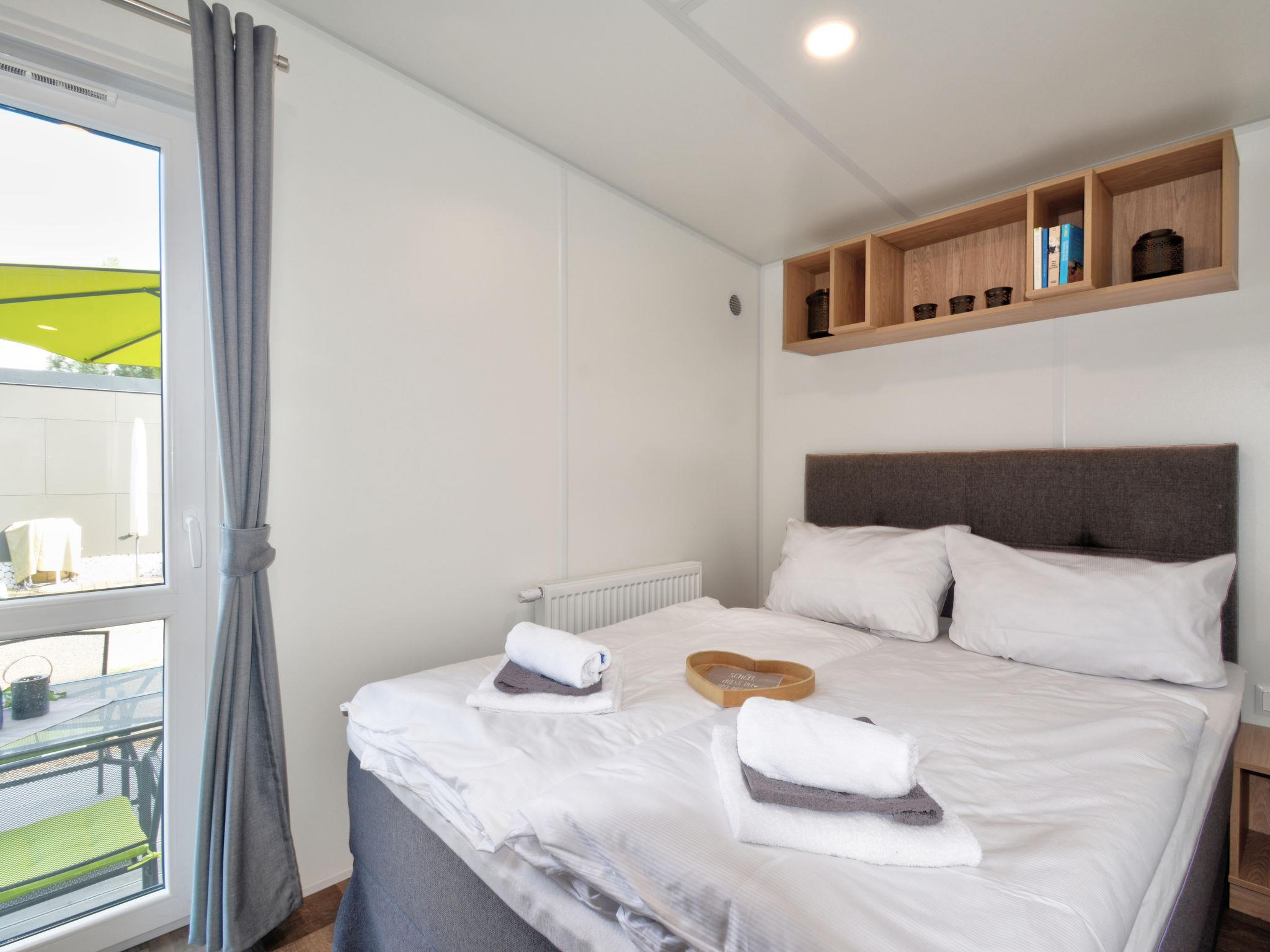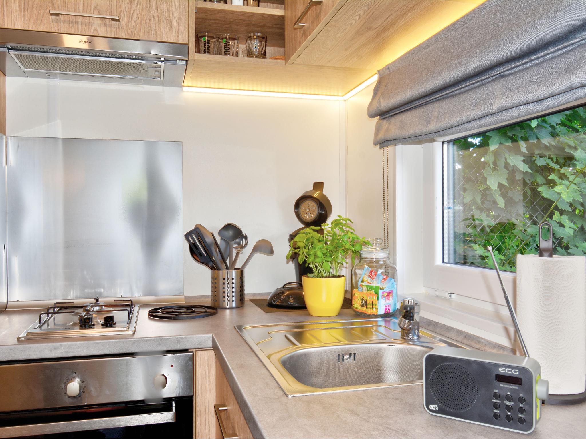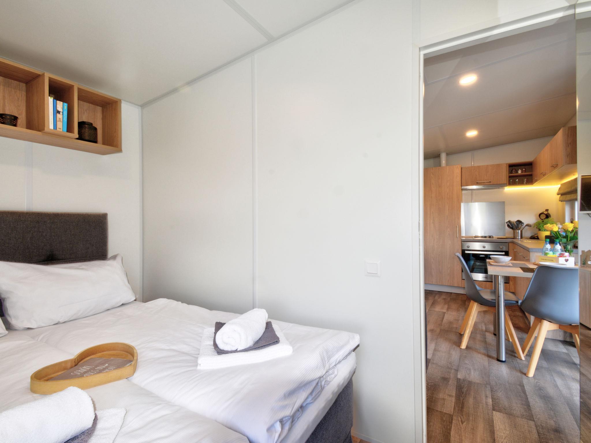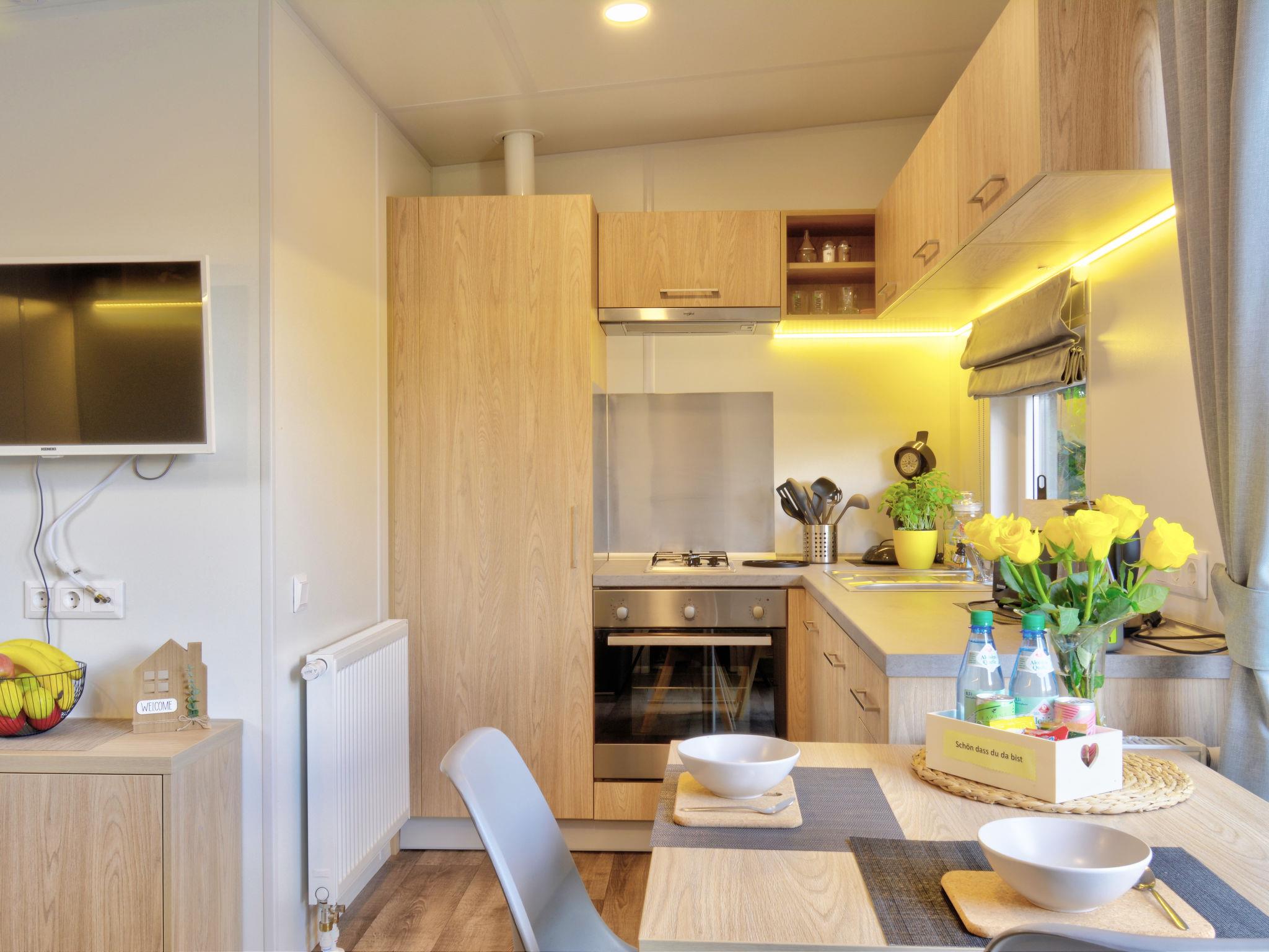 "Tiny Haus Kuschelnest", 2-Zimmer-Mobilheim 25 m2. Objekt geeignet für 2 Erwachsene + 2 Kinder. Gemütlich eingerichtet: Wohn-/Schlafzimmer mit 1 Diwanbett (120 cm, Länge 170 cm), Sat-TV. Ausgang zur Terrasse. 1 Zimmer mit 1 franz. Bett (140 cm, Länge 200 cm). Offene Küche (Backofen, Gasherd, 2 Flammen, Wasserkocher, elektrische Kaffeemaschine). Dusche/WC. G-Heizung. Terrasse. Terrassenmöbel. Parkplatz (1 Auto) beim Haus. Bitte beachten: Nichtraucher-Haus. Maximal 1 Haustier/Hund erlaubt.