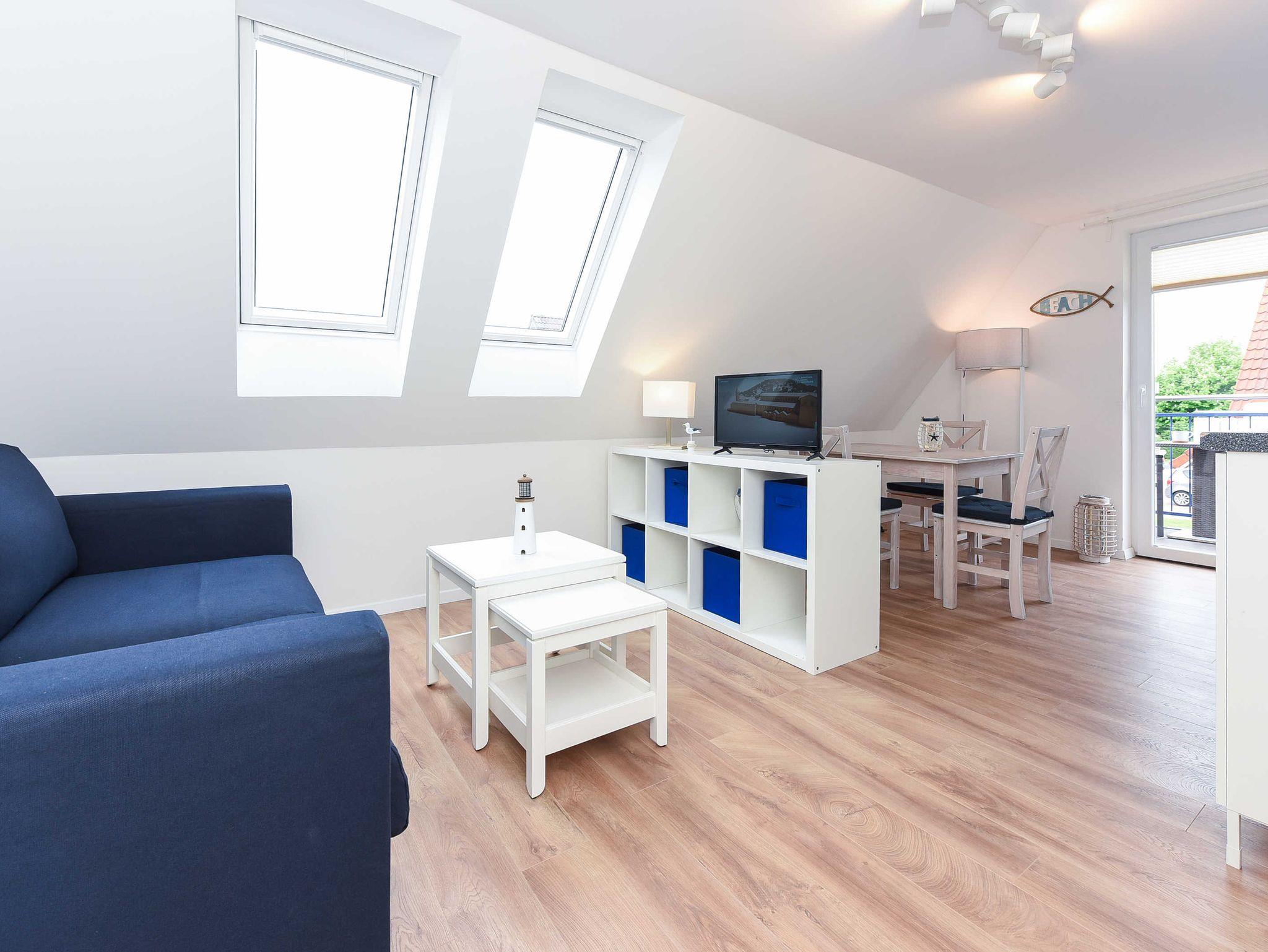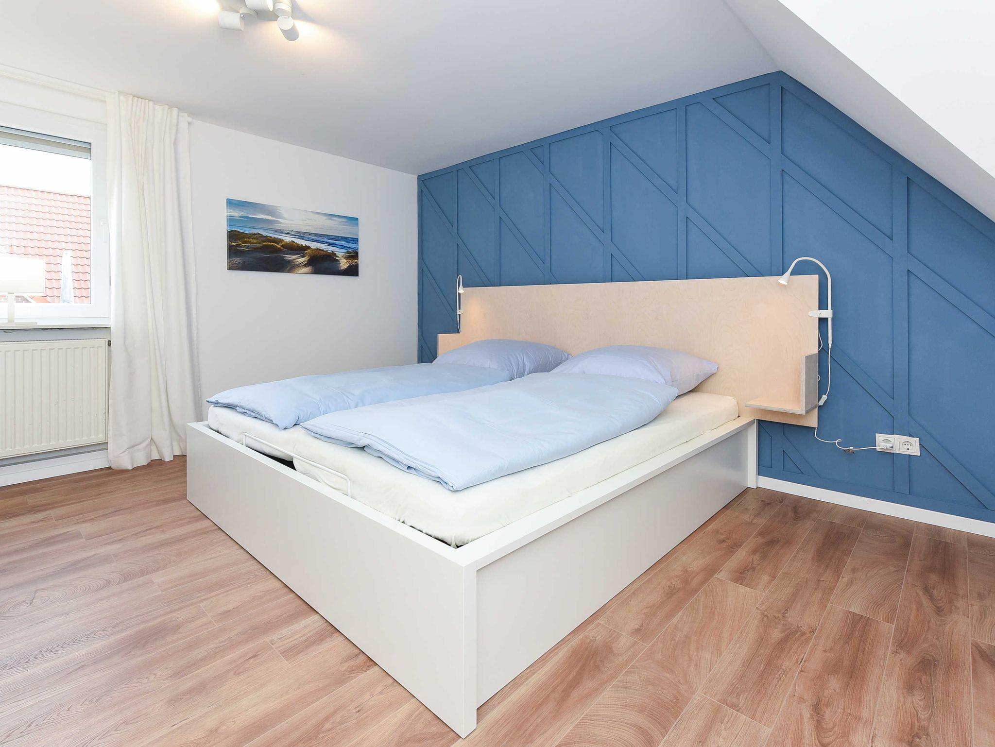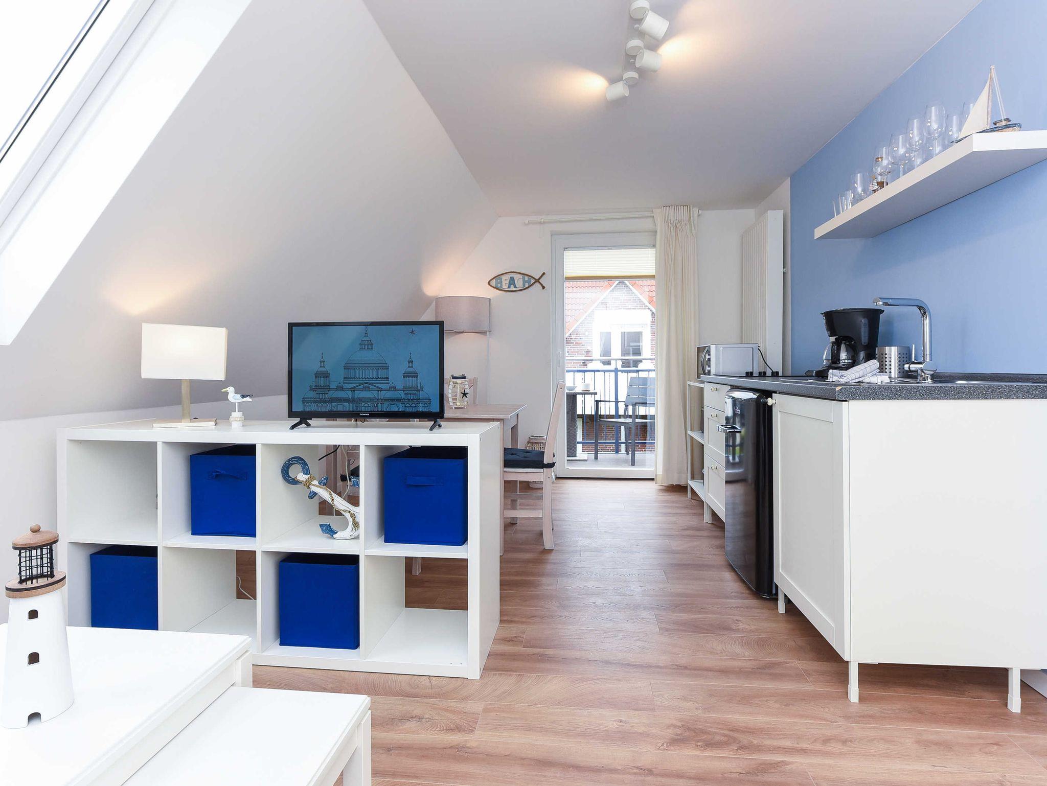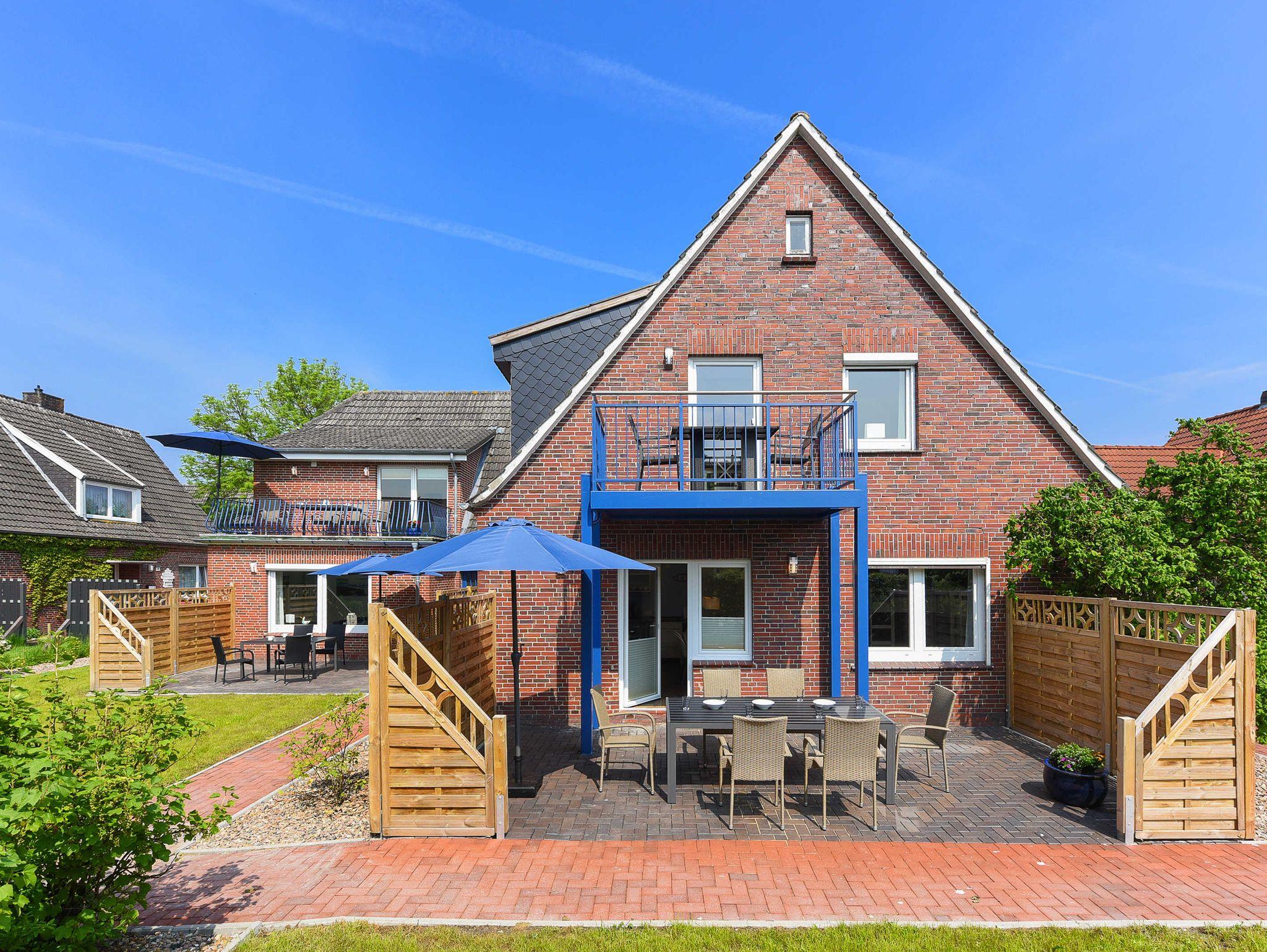 Helle, moderne Ferienwohnung im Blauen Haus Bensersiel, nur 200 m vom Nordseedeich entfernt, ideal für entspannte Nordseeurlaube.