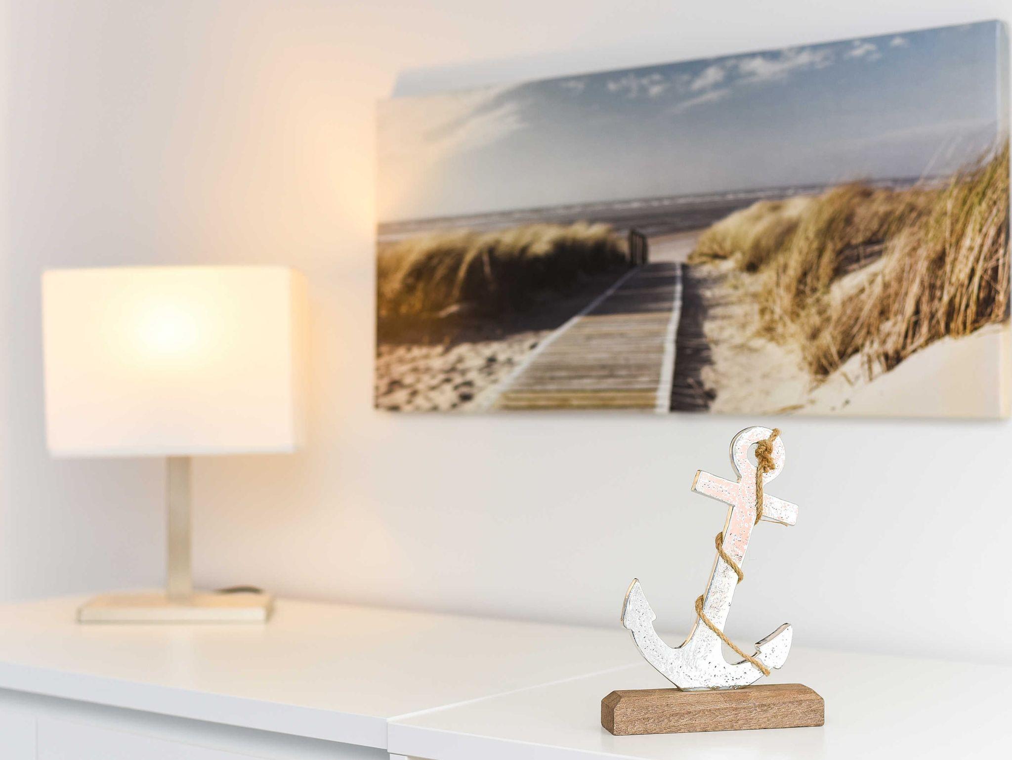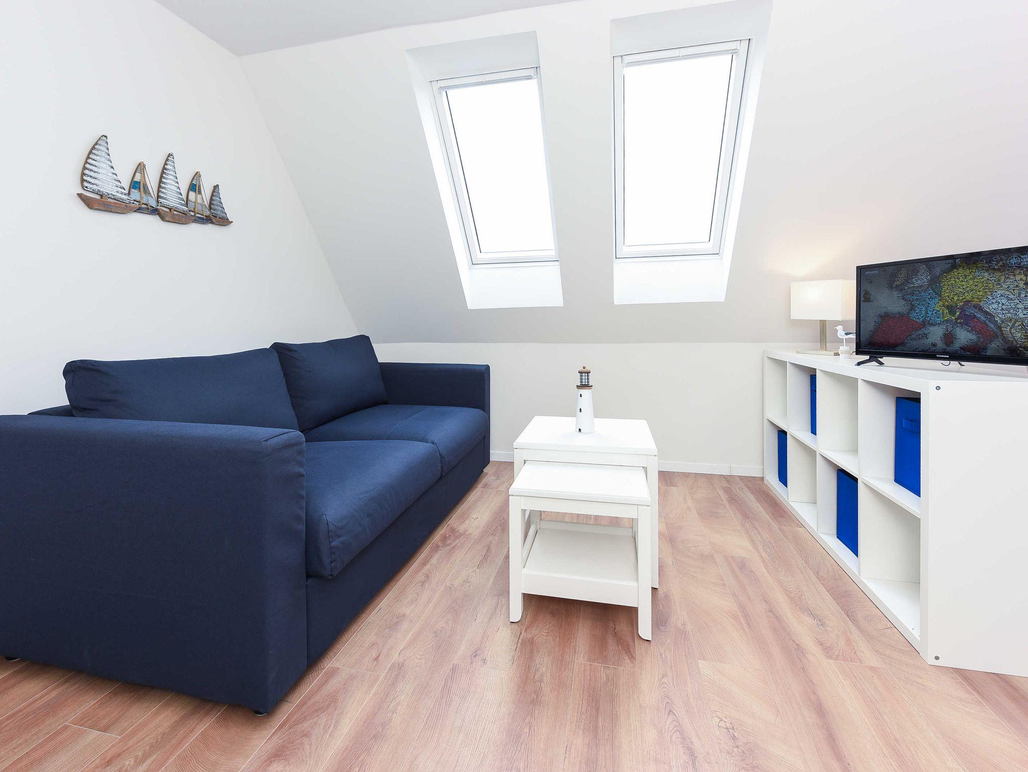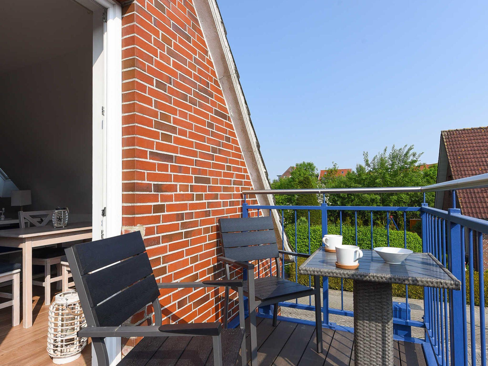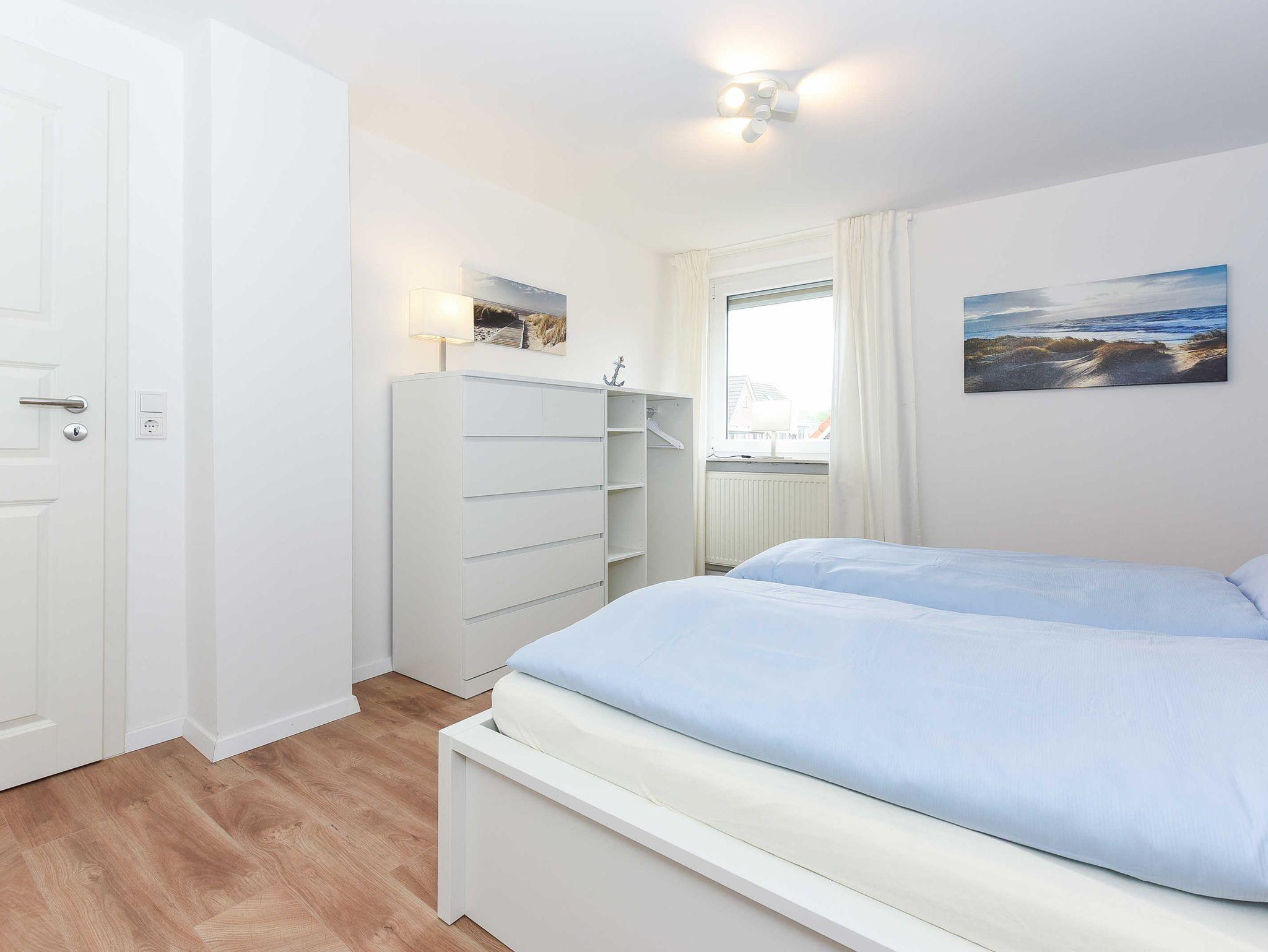Helle, moderne Ferienwohnung im Blauen Haus Bensersiel, nur 200 m vom Nordseedeich entfernt, ideal für entspannte Nordseeurlaube.