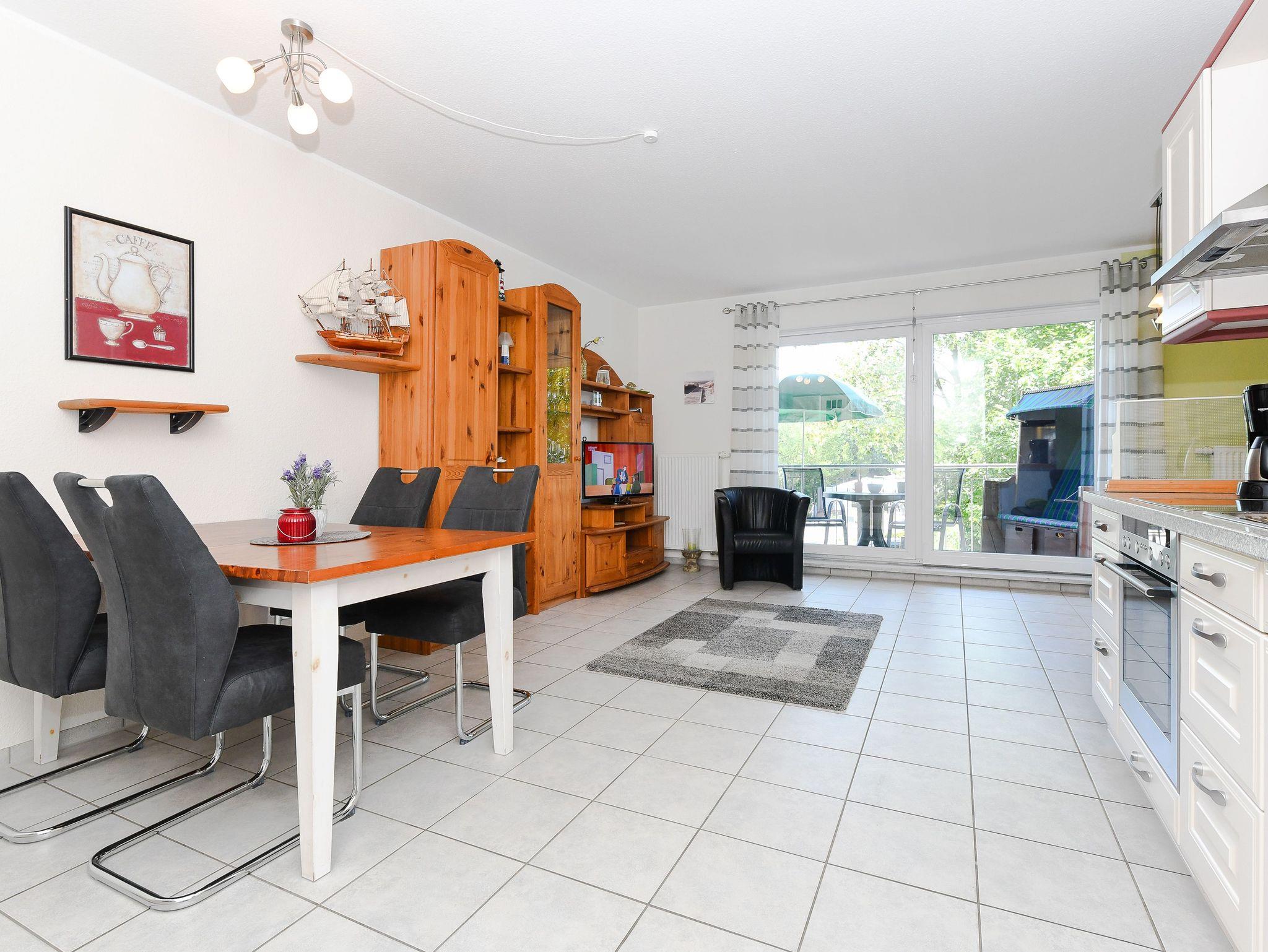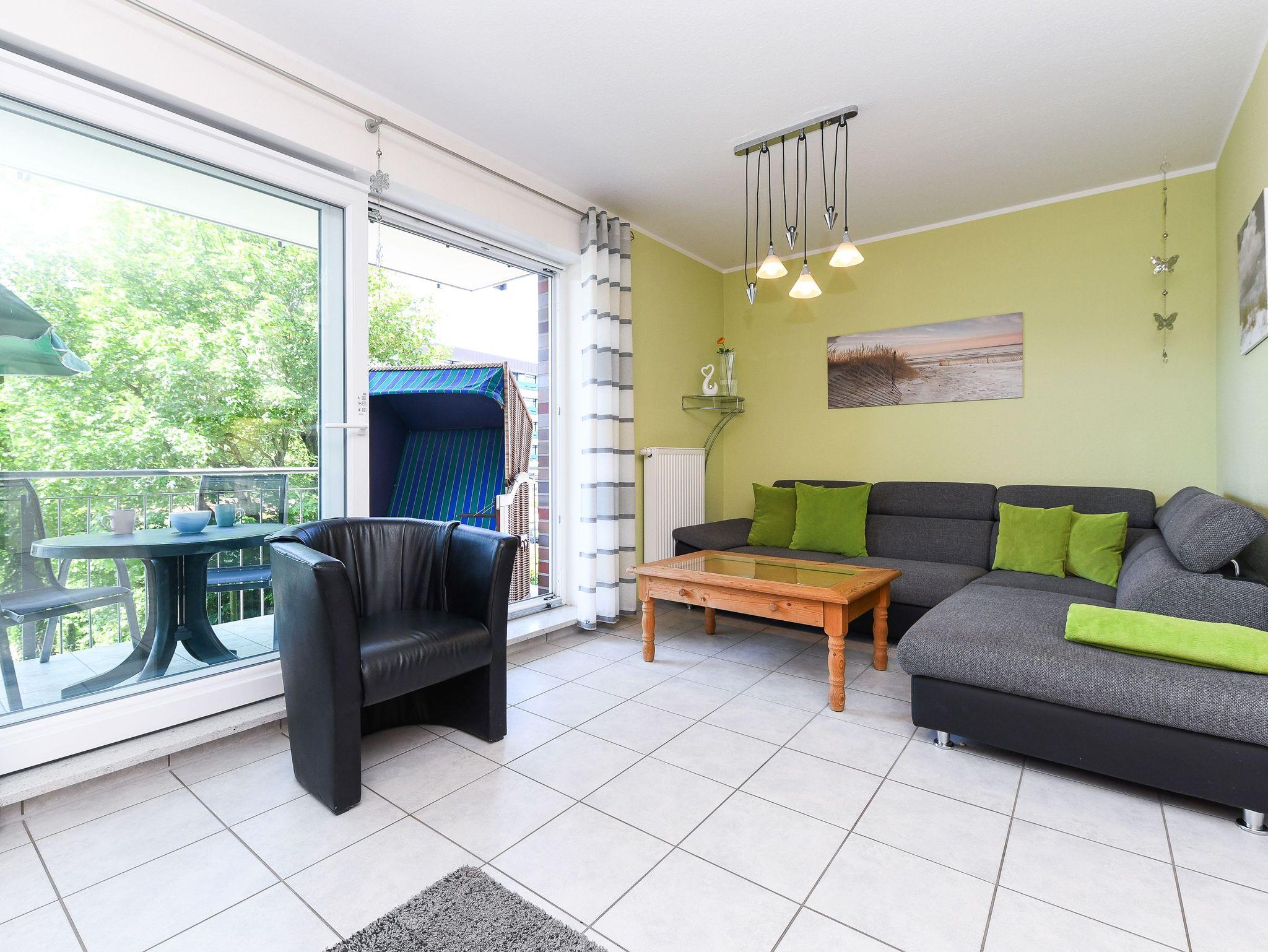 Moderne Ferienwohnung Friesengold im Nordseegartenpark mit Balkon und Blick auf Bensersiel und die Nordsee.