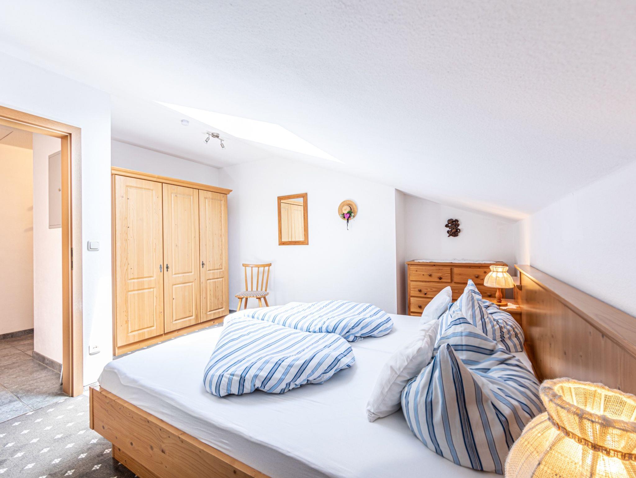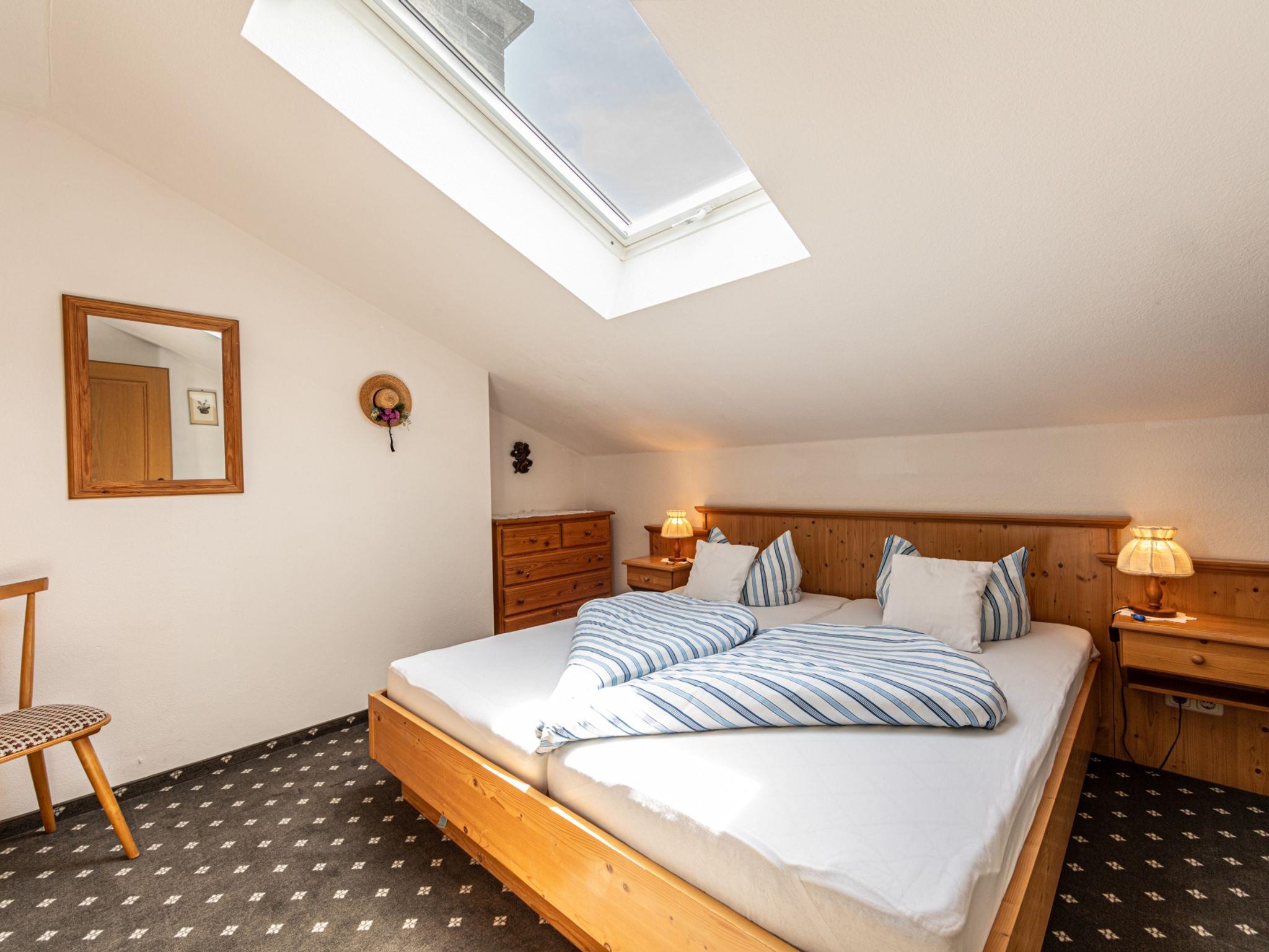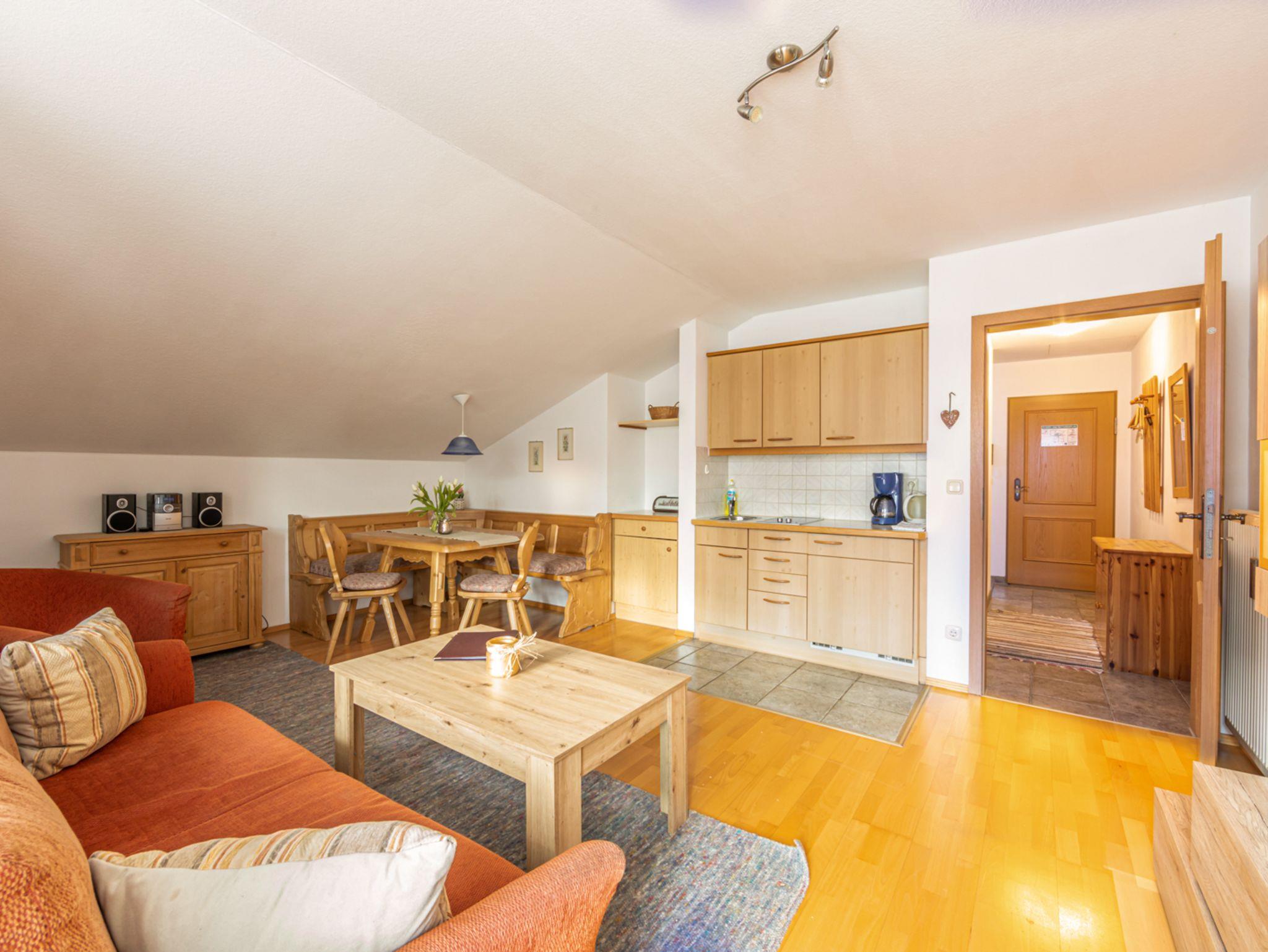 Die komfortable und gemütlich eingerichtete Ferienwohnung (ca. 48 qm) liegt im Dachgeschoß. Das Wohnzimmer ist mit Sat-TV, Radio und einem Balkon ausgestattet. Außerdem verfügt es eine Essecke und eine Küchenzeile mit einem 2-Plattenherd, einem Kühlschrank / Eisfach, einer Kaffeemaschine, einem Toaster und einem Wasserkocher.