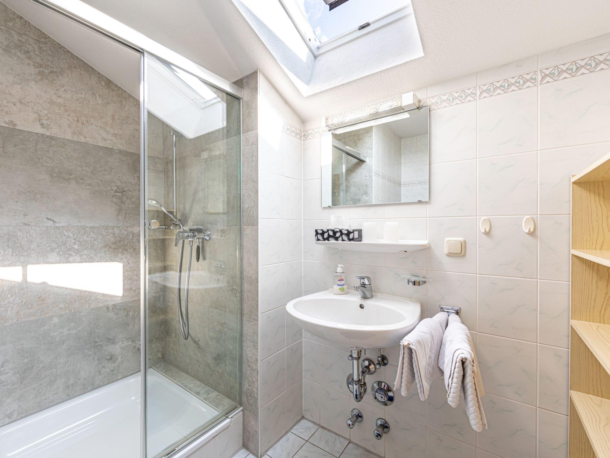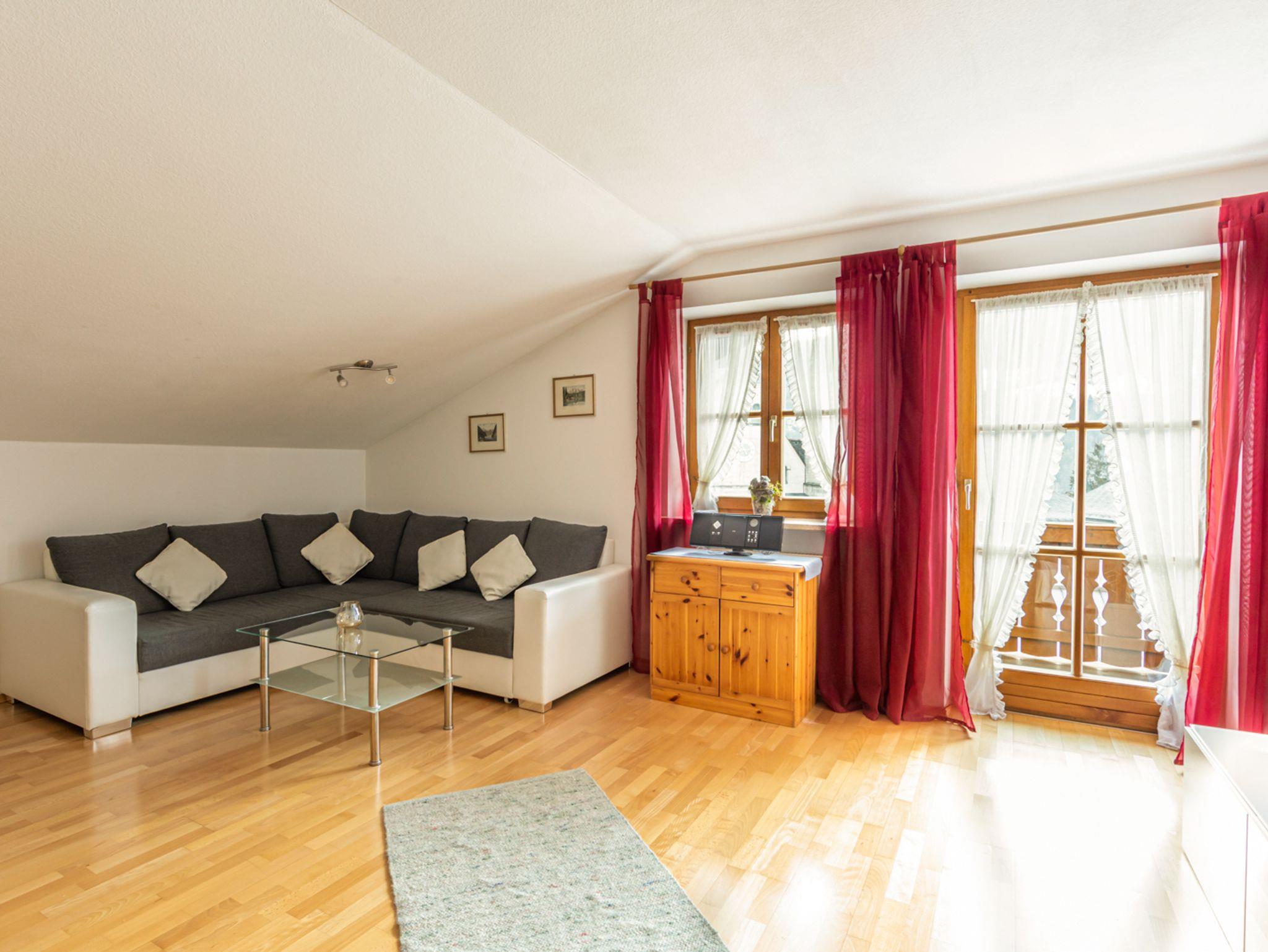 Die komfortable und gemütlich eingerichtete Ferienwohnung (ca. 44 qm) liegt im Dachgeschoß. Das Wohnzimmer ist mit Sat-TV, Radio und einem Balkon ausgestattet. Außerdem verfügt es eine Essecke und eine Küchenzeile mit einem 2-Plattenherd, einem Kühlschrank / Eisfach, einer Kaffeemaschine, einem Toaster und einem Wasserkocher.