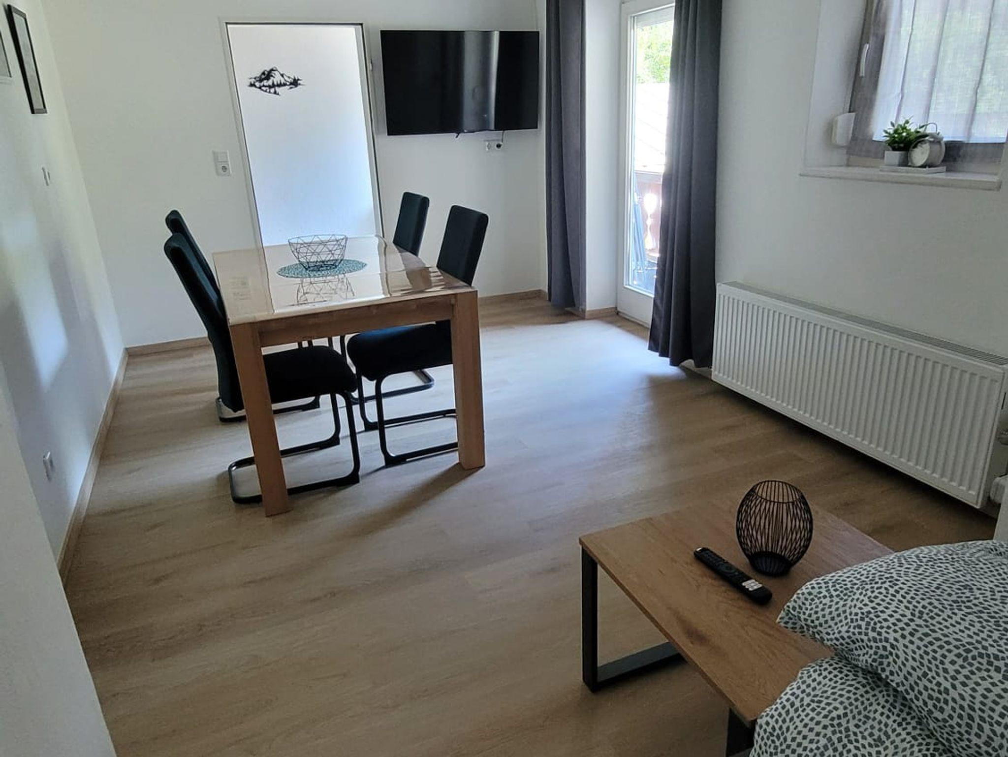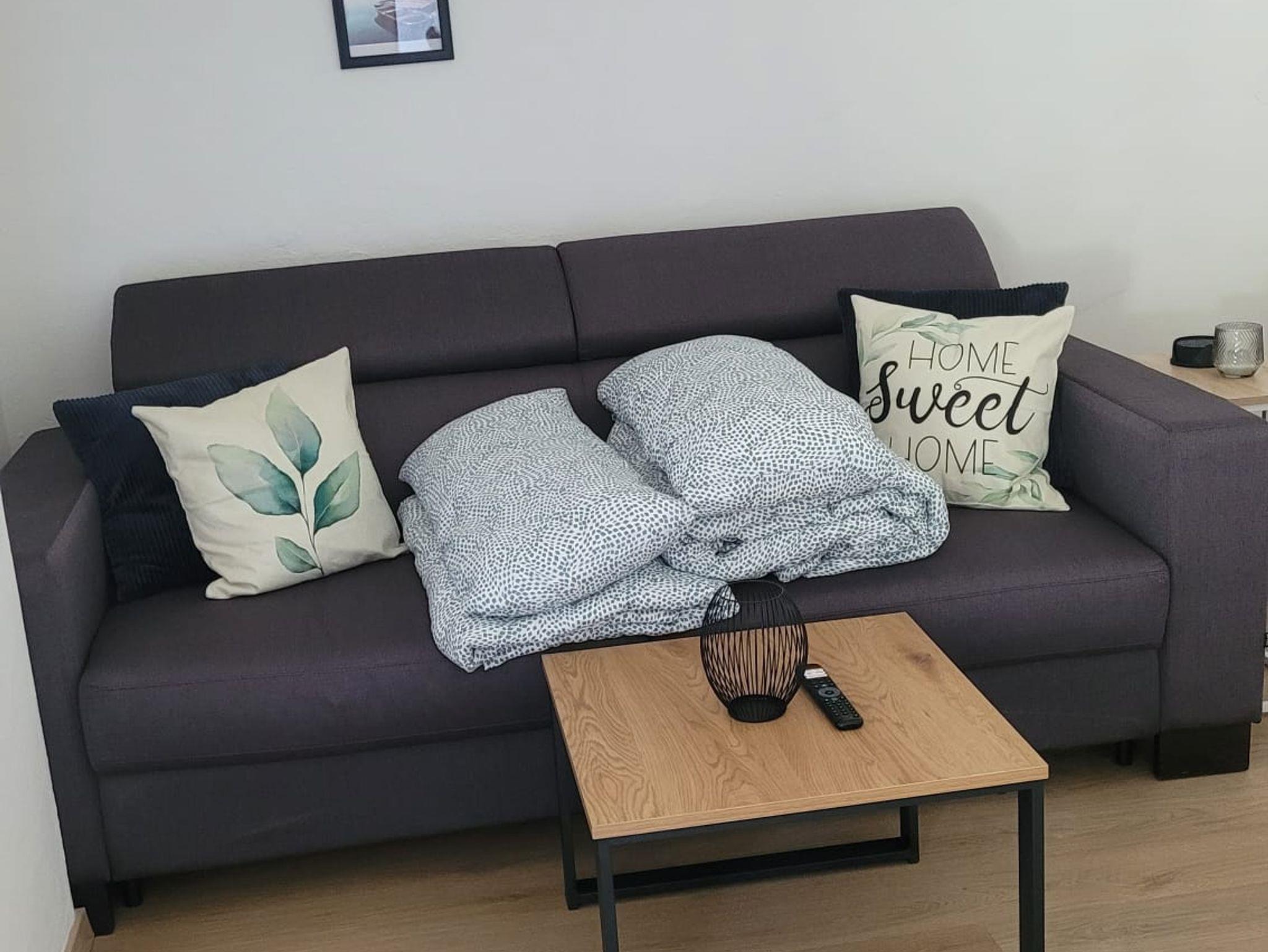 Im Wohnzimmer sorgt ein gemütlicher Essbereich für gesellige Stunden. Das Sofa im Wohnzimmer kann bei Bedarf als Schlafsofa ausgezogen werden und bietet somit zwei zusätzliche Schlafplätze. Hier können Sie entspannte Abende verbringen und die angenehme Atmosphäre genießen.