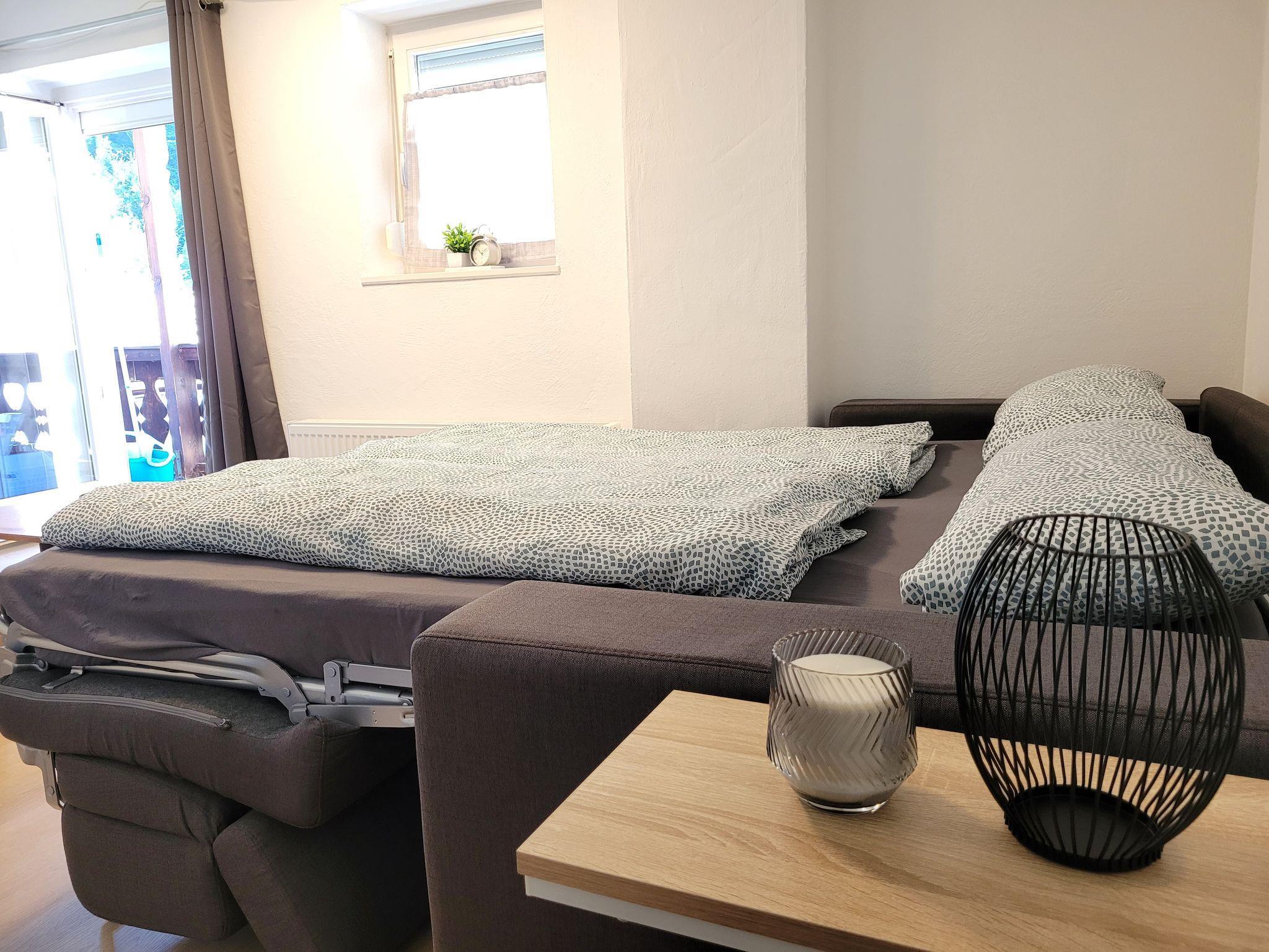 Es bietet einen ruhigen Rückzugsort, ideal für eine erholsame Nacht. Das Sofa im Wohnzimmer kann bei Bedarf ebenfalls als Schlafmöglichkeit genutzt werden, sodass insgesamt zwei Schlafplätze zur Verfügung stehen.