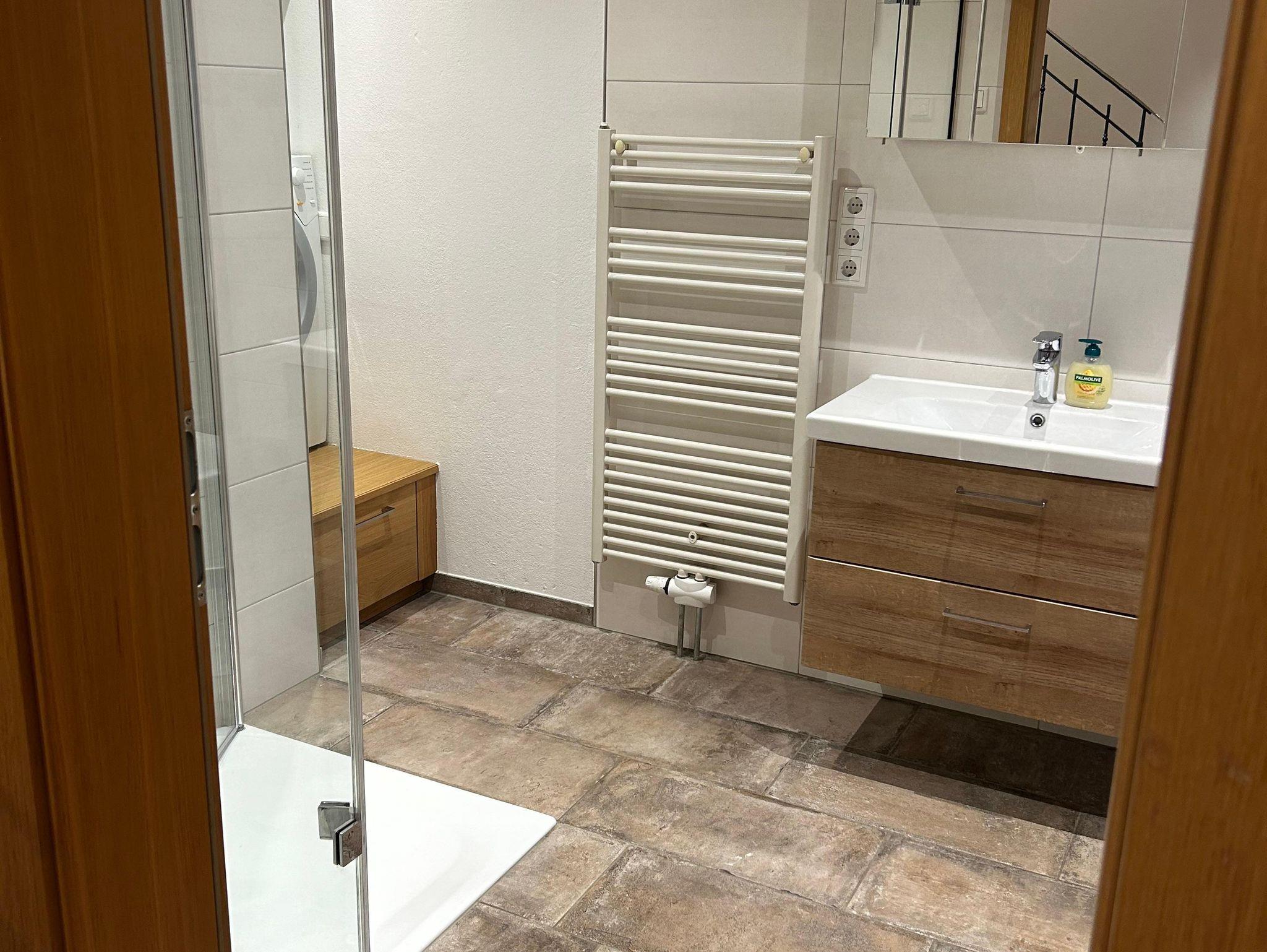 Das Bad ist ausgestattet mit Regendusche, Badewanne und Waschmaschine, dazu gibt es ein separates WC.