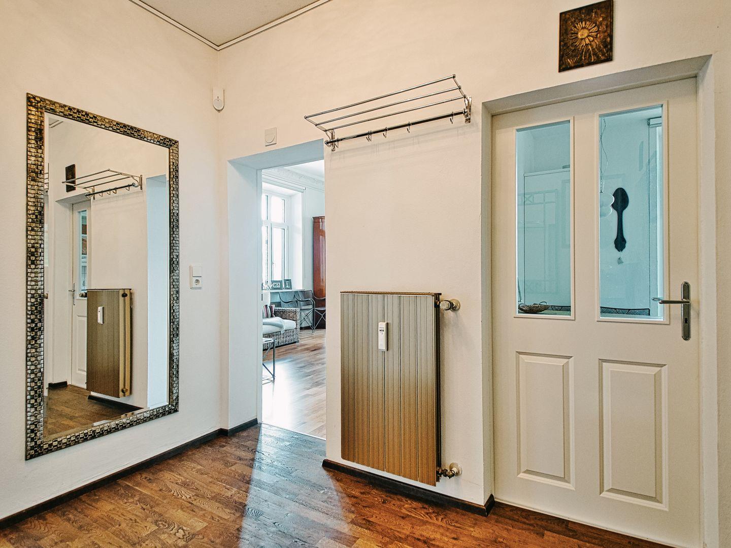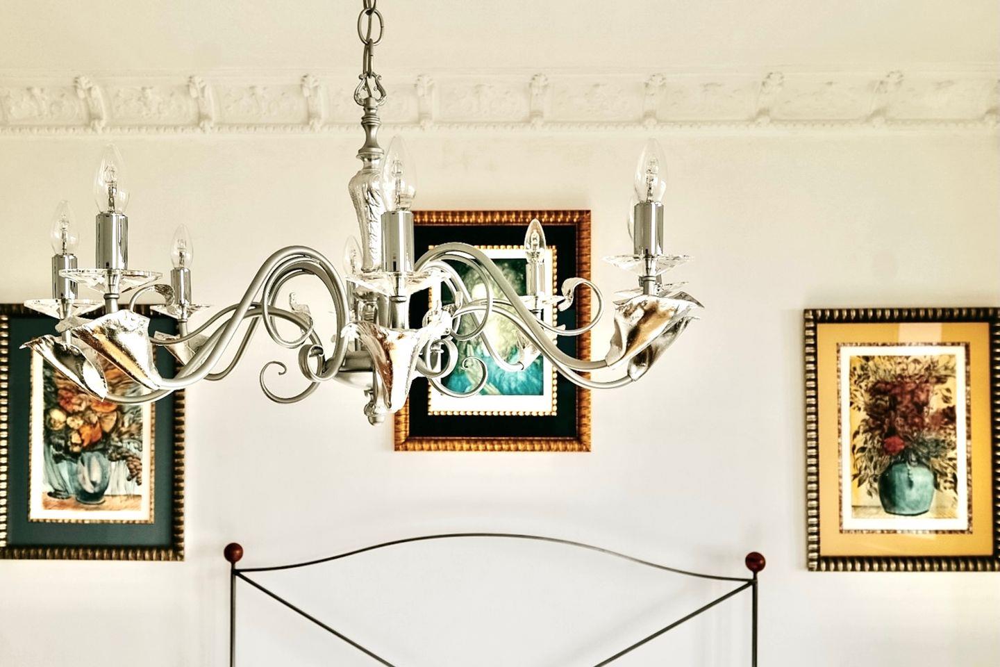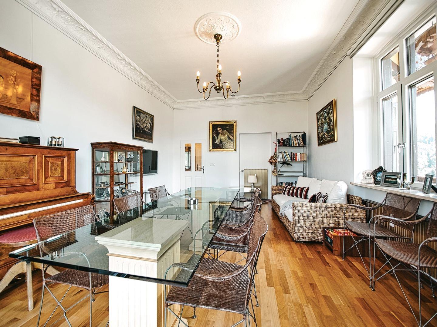 Viel Licht, hohe Räume und das Zusammenspiel aus Glas, Stuck, Eisen, Holz und Kunst verleihen der Wohnung ihren Charakter. Epochenmöbel, ein originaler Bronzelüster und das Klavier setzen Akzente.