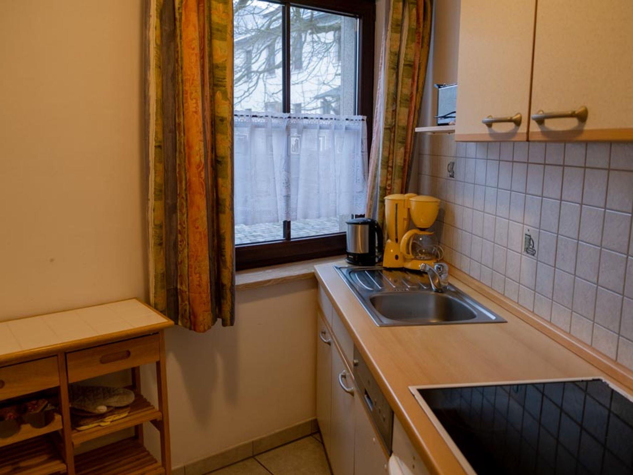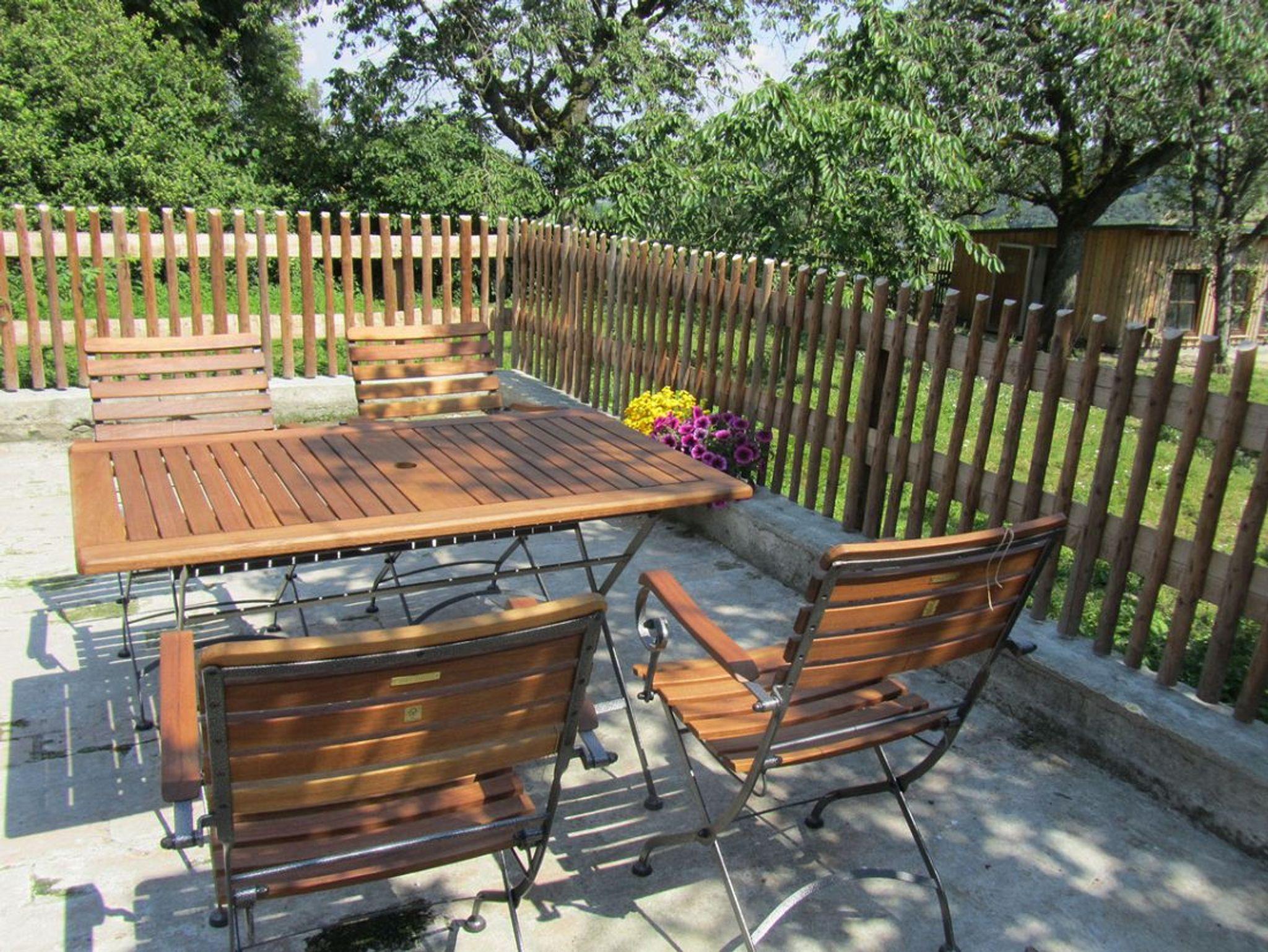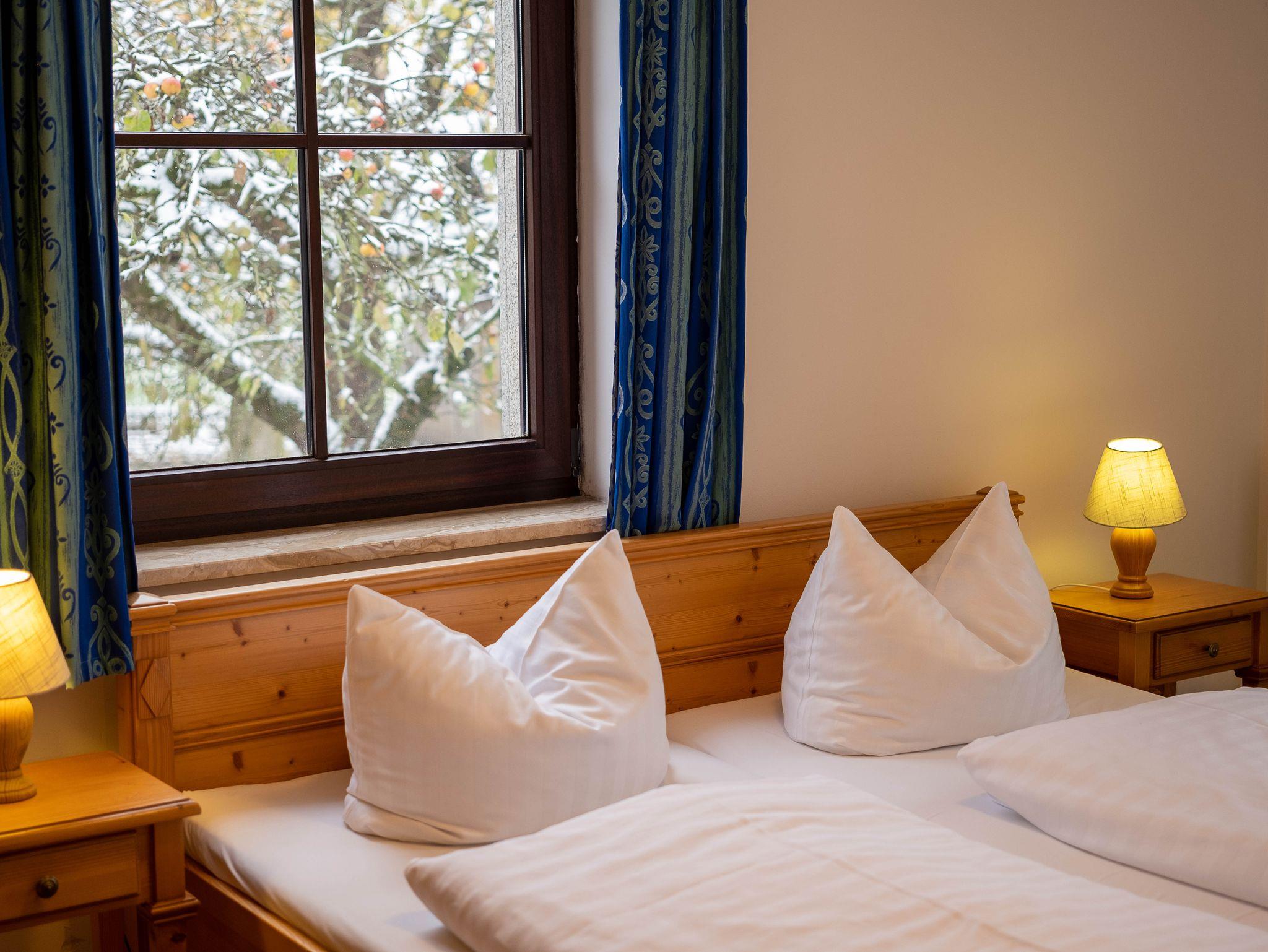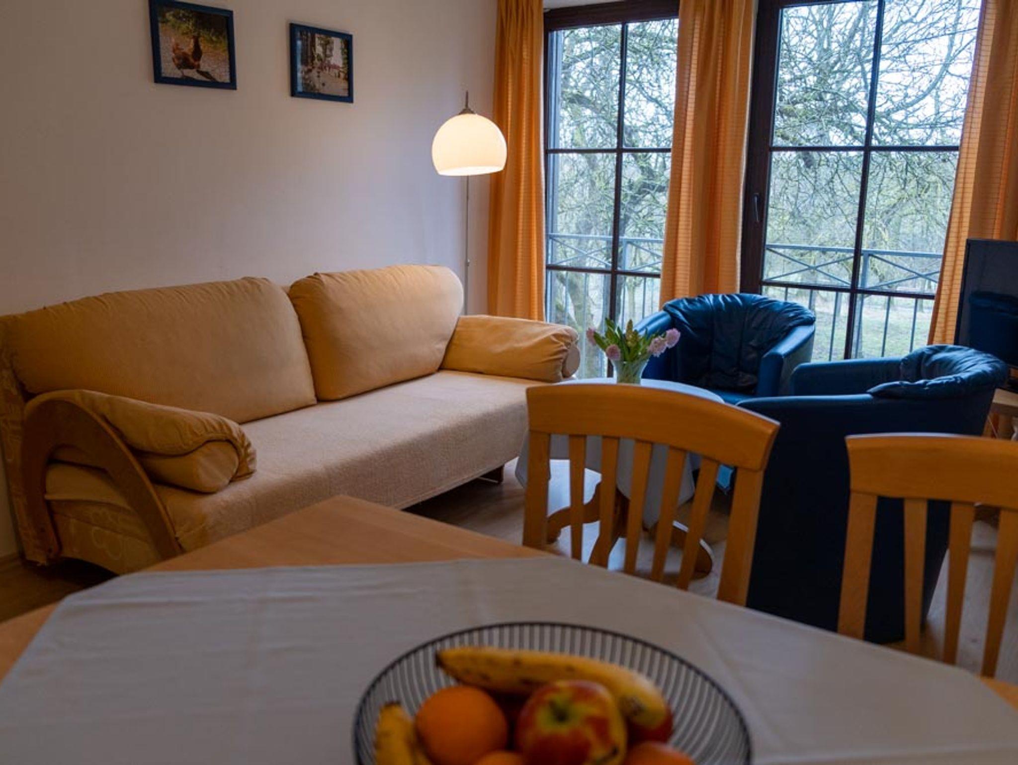 Die Wohnung (42m²) liegt im Erdgeschoß und hat einen herrlichen Blick auf unseren historischen Innenhof und auf den Obstgarten. Sie hat ein Schlafzimmer mit Doppelbett, die Lattenroste sind im Kopfteil höhenverstellbar, ein Wohnzimmer, eine Küche, Dusche / WC mit Fenster. Die Küche ist komplett ausgestattet mit Geschirr, Töpfen und Besteck, einen Geschirrspüler, Kaffeemaschine, Kühlschrank, Gefrierschrank, Herd, Backofen, Toaster und Wasserkocher.