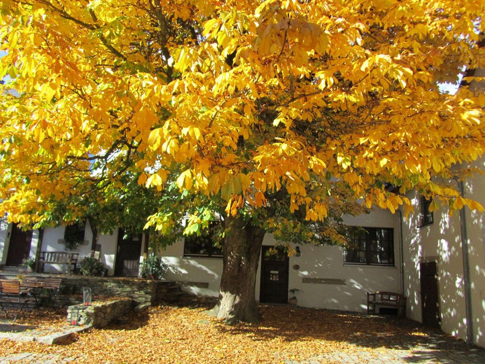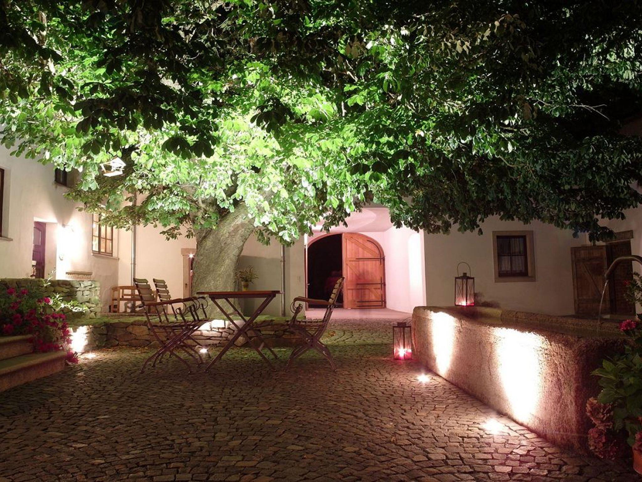 Der historische Innenhof mit den großen Bäumen und dem alten Brunnen, aus dem seit 1799 frisches Quellwasser sprudelt, hat mediterranen Flair und ist der ideale Platz zum Genießen, Entspannen, Frühstücken oder für ein Gläschen Bier / Wein am Abend.