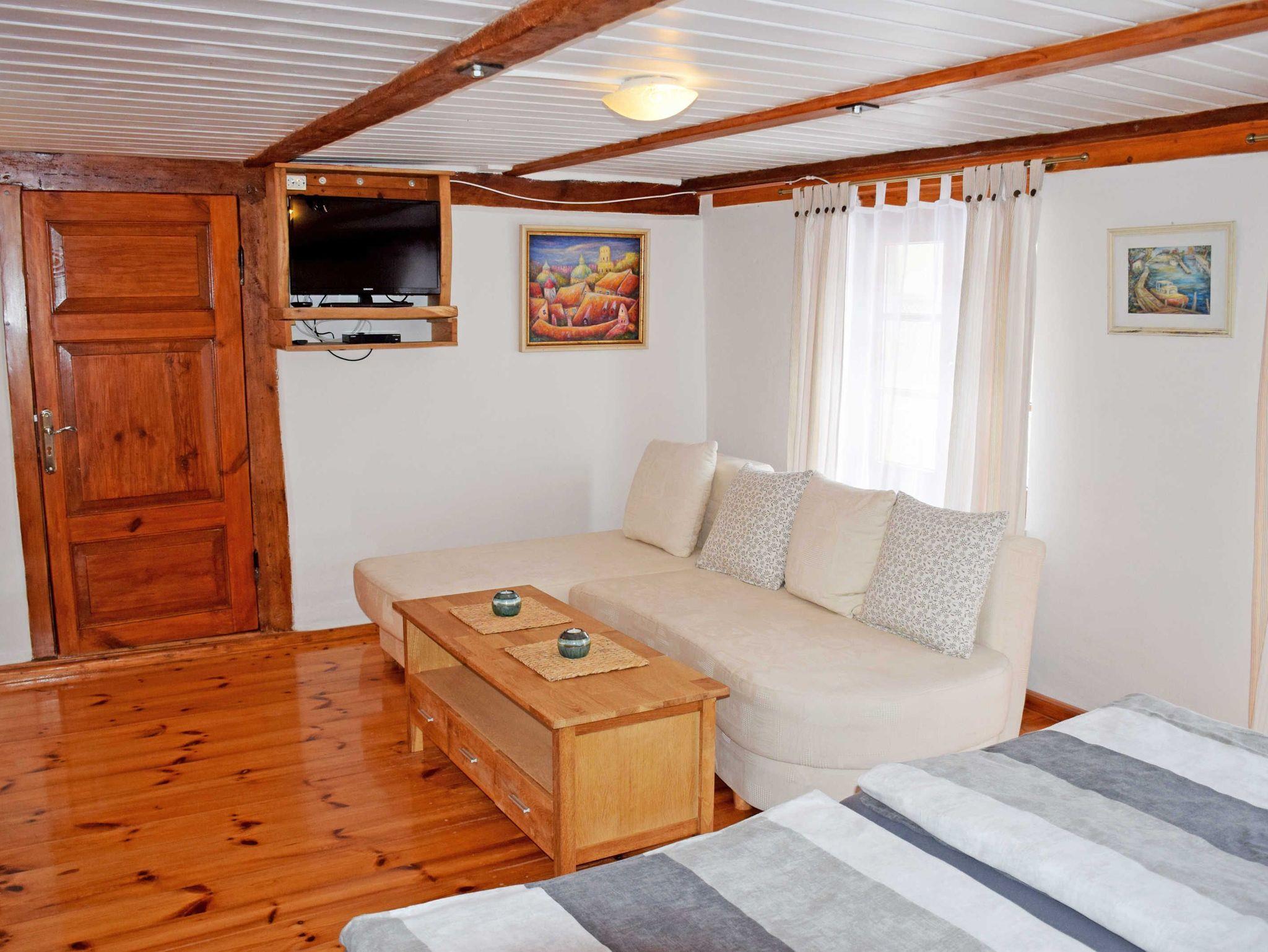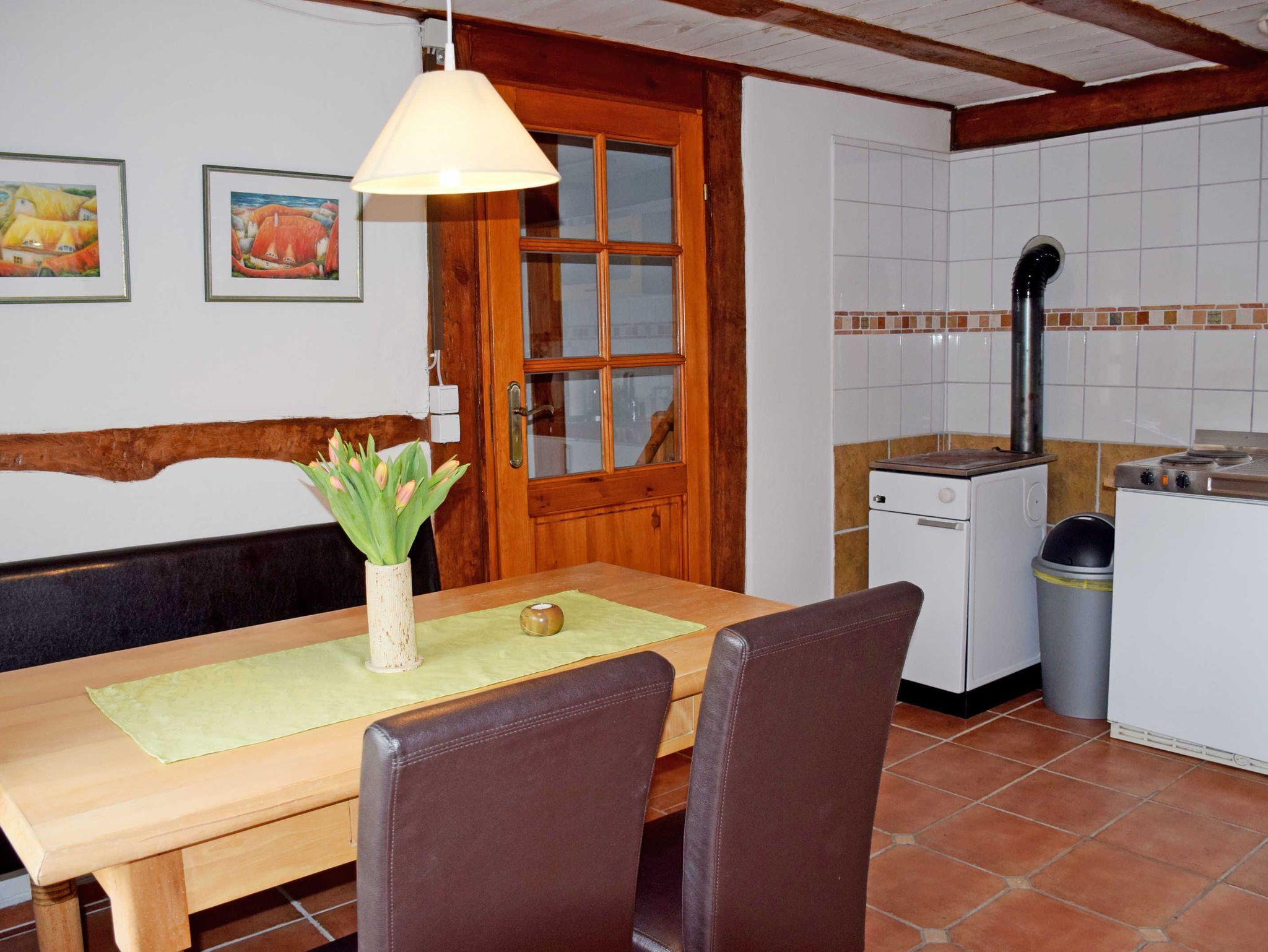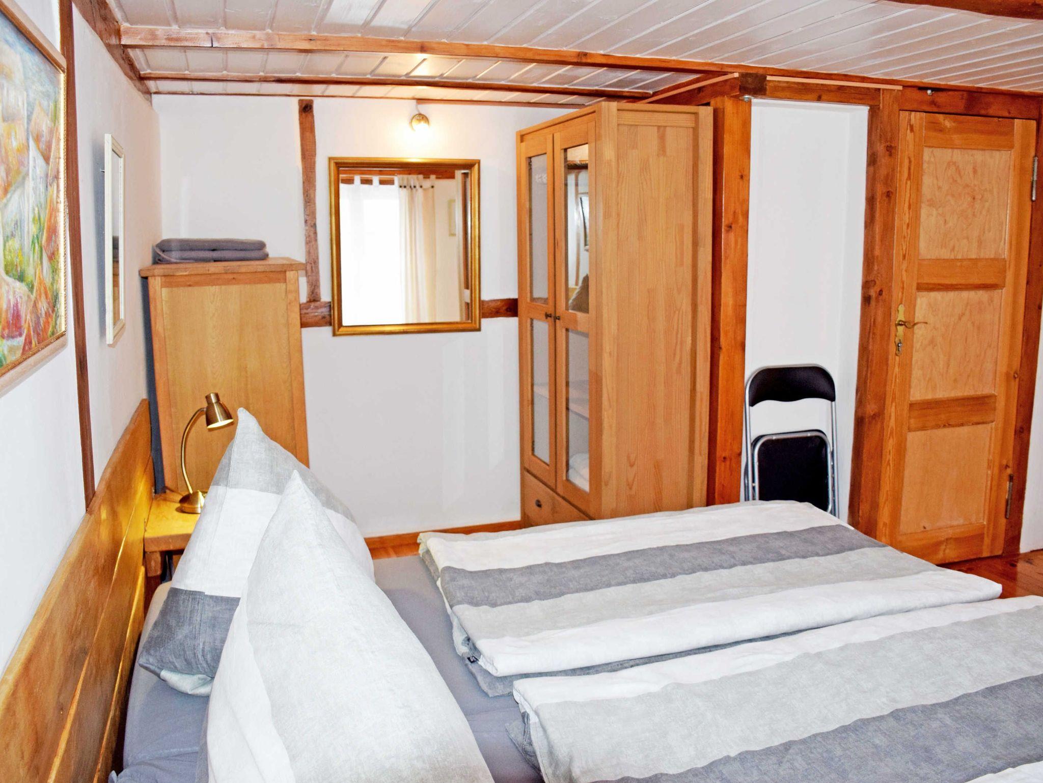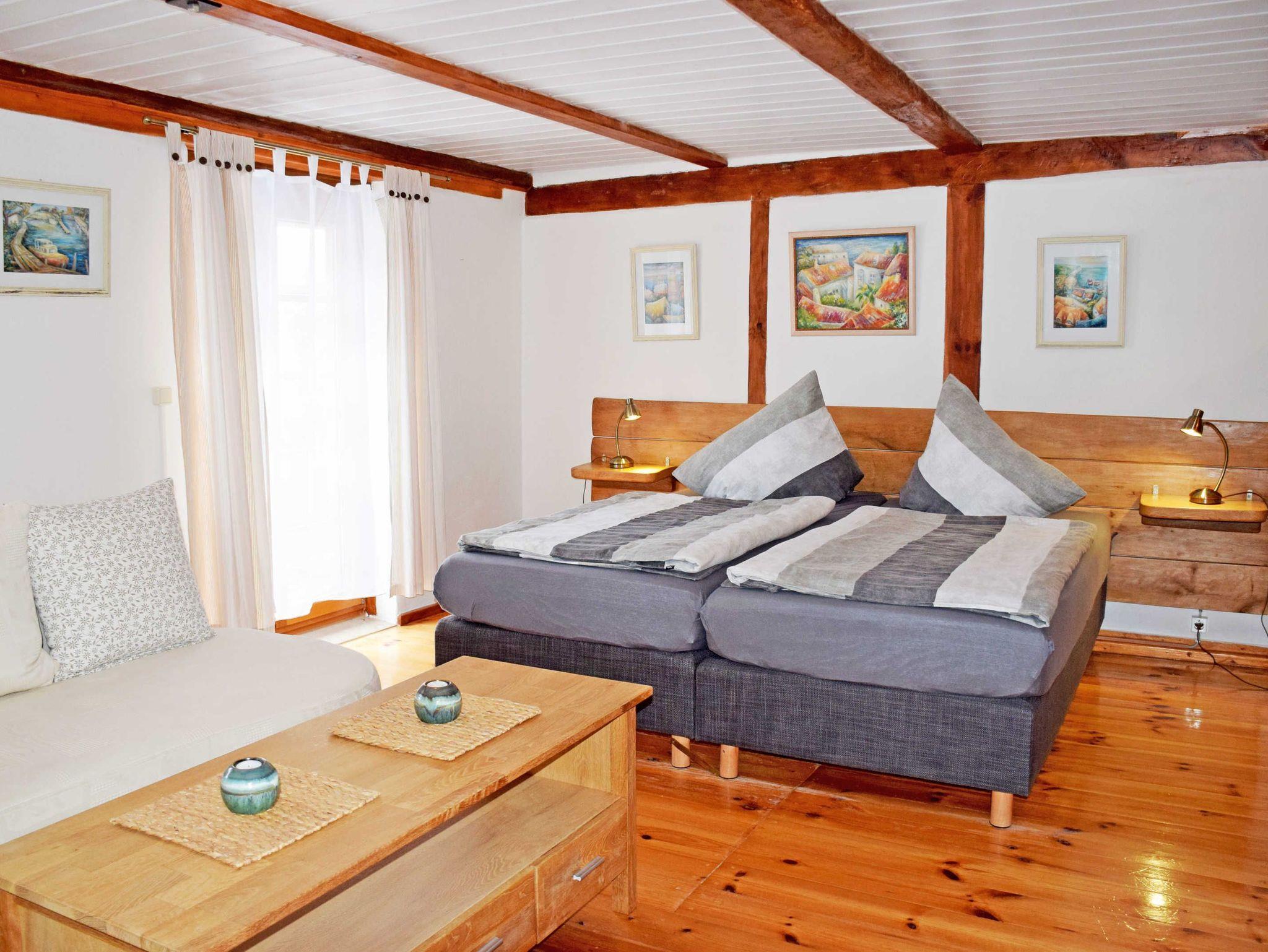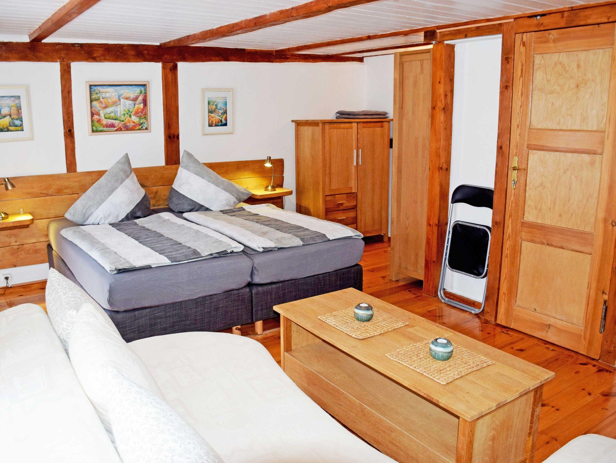 Unsere Ferienwohnung Chagall ist ca. 40 qm groß und bietet Platz für 2 Erwachsene und wurde modern und liebevoll eingerichtet. Die alten Holzbalken des Bauernhauses geben dieser Ferienwohnung ein sehr angenehmes Ambiente. Über einen separaten Eingang gelangt man in die Küche mit Esstisch und Sitzgelegenheiten. Die kleine Miniküche ist mit 2 Herdplatten, Grill, Wasserkocher, Kaffeemaschine, Toaster sowie Kühlschrank komplett ausgestattet. Von hier aus führt eine Holztreppe nach oben in die erste Etage wo sich der Wohn- / Schlafraum befindet. Der Raum ist ausgestattet mit einem bequemen Doppelbett mit Nachtschränken, Leselampen, Sitzecke, ein modernes Flachbild-TV-Gerät und Kleiderschrank. WLAN ist im Erdgeschoss vorhanden.