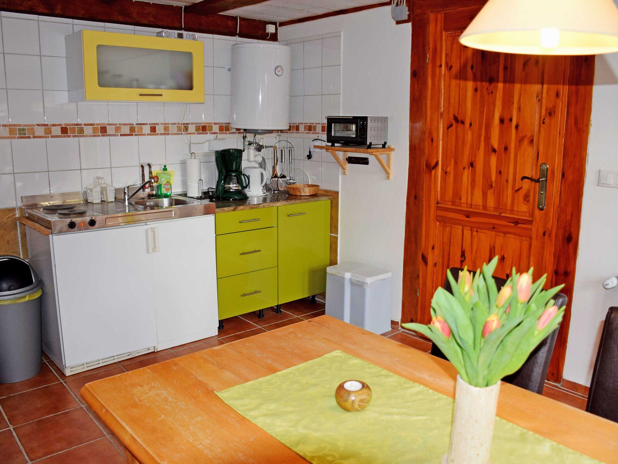 Die Ferienwohnung (40 qm, max. 2 Erw., mit WLAN) verfügt über einen separaten Wohnungseingang, 1 Schlafzimmer, Dusche/WC und Miniküche. Zur Ferienwohnung gehört eine kleine überdachte Terrasse mit Gartenmöbeln. Eine Grillmöglichkeit ist ebenfalls vorhanden.