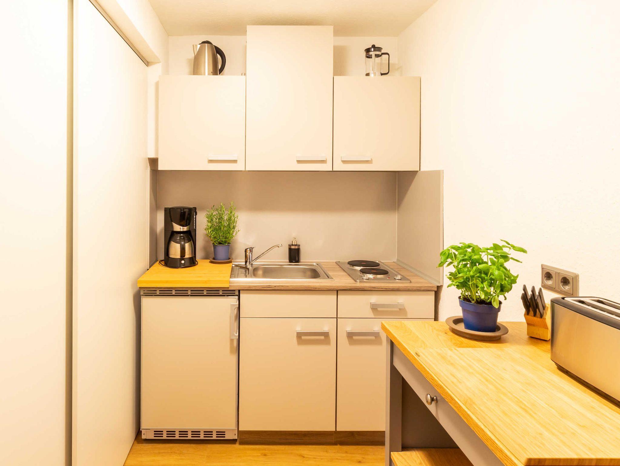 • separate Mini-/Pantry-Küche mit Kühlschrank inkl. Gefrierfach, Zweiplattenkocher, Minibackofen, Kaffeemaschine, Wasserkocher, Toaster, Eierkocher